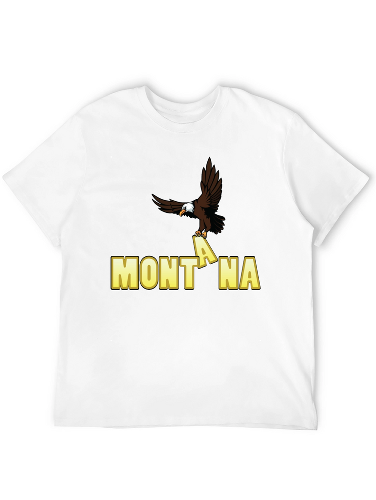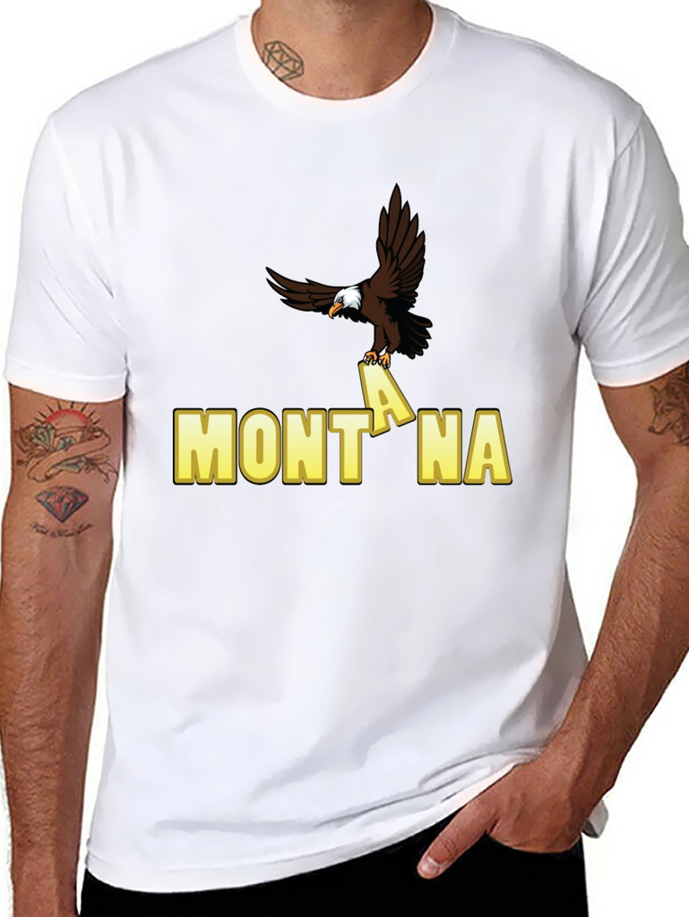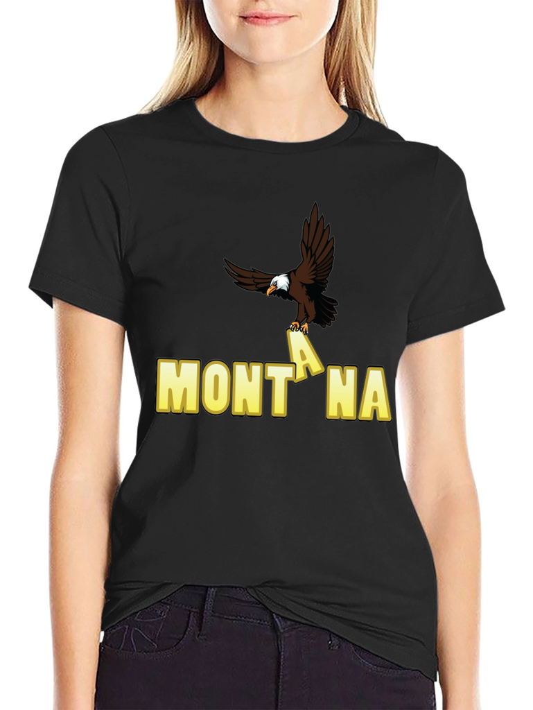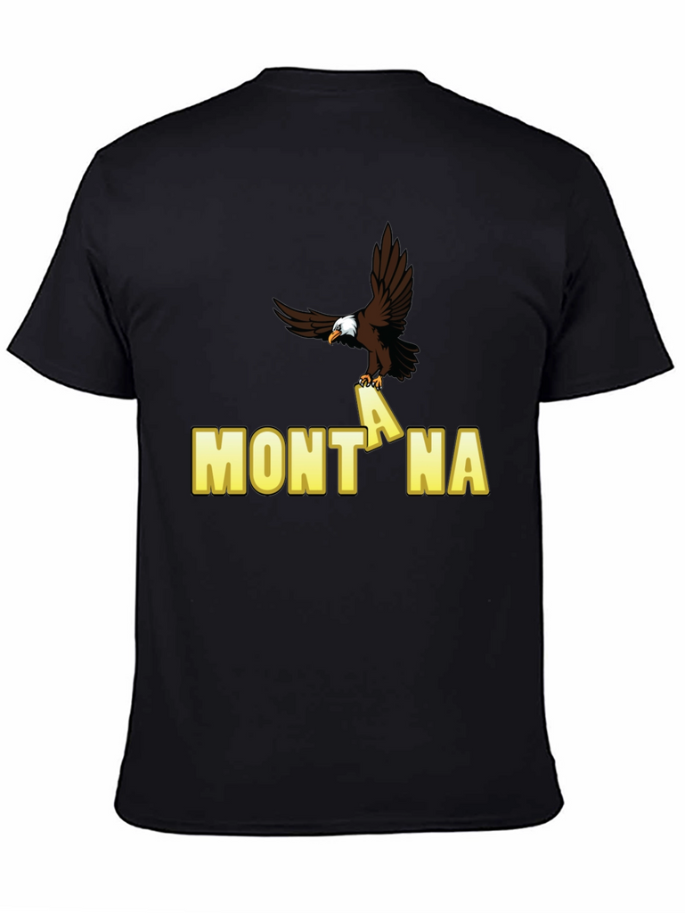 Show your love for Montana with this striking graphic t-shirt! The shirt features a bold "MONTANA" text design. An eagle is perched above the lettering, adding a touch of nature-inspired style. Made from what appears to be soft, breathable cotton, this classic black tee is comfortable enough for everyday wear. The short-sleeve design makes it perfect for warm weather or layering under a jacket. Whether you're a Montana native or just a fan of the state's natural beauty, this t-shirt is a great way to express your passion. Add it to your casual wardrobe for a touch of rugged, outdoorsy charm. Grab yours today!