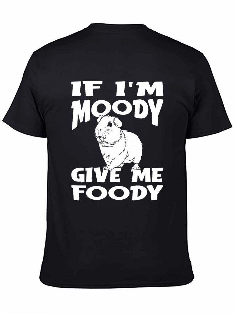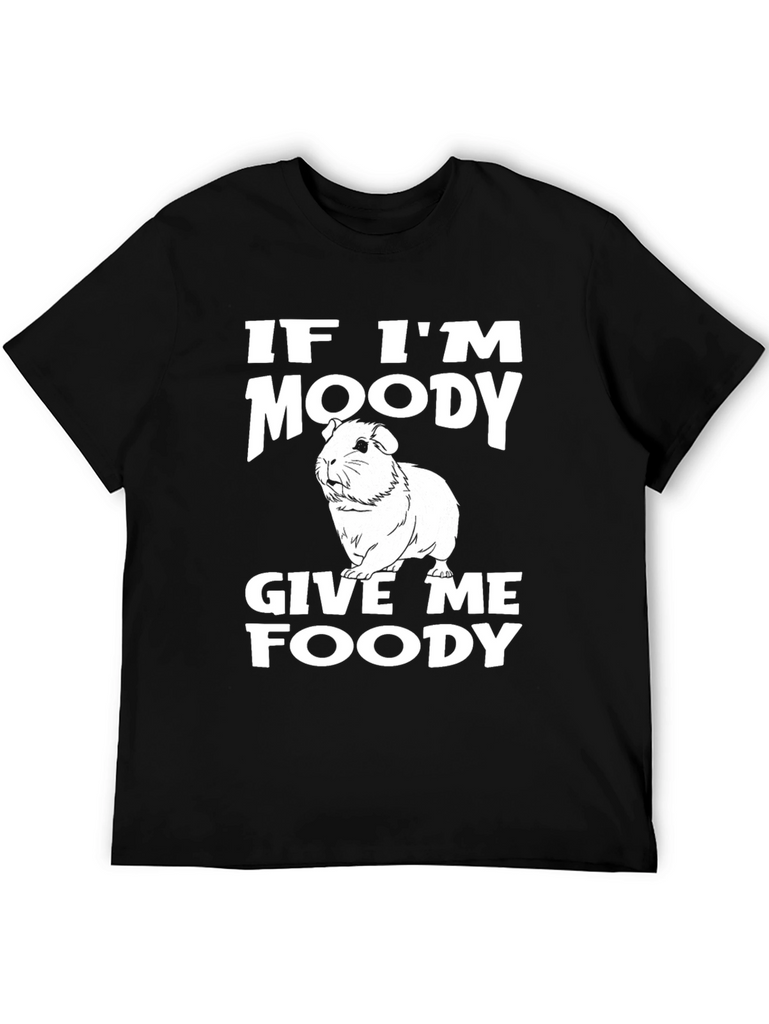 This black t-shirt features a humorous graphic design. The text "IF I'M MOODY GIVE ME FOODY" is printed in bold white letters above and below a white Guinea Pig illustration. This tee appears to be made of soft and comfortable material, perfect for everyday wear. The design makes it a great conversation starter for pet lovers and those with a good sense of humor. It is a casual and unique addition to any wardrobe, ideal for casual outings, lounging at home, or as a fun gift. The shirt seems to be standard fit.