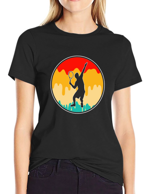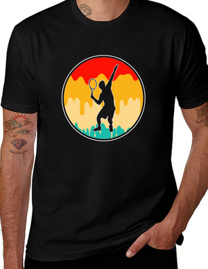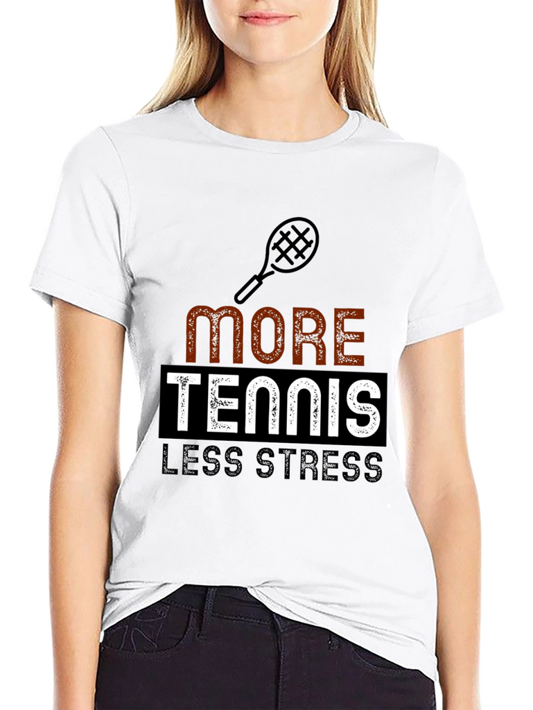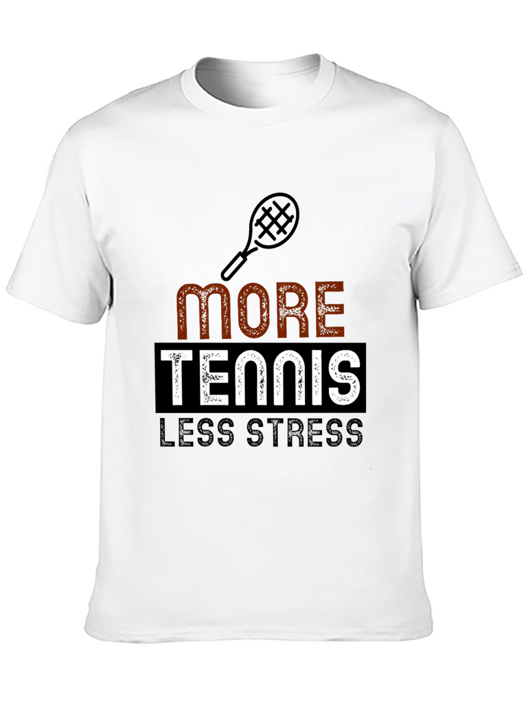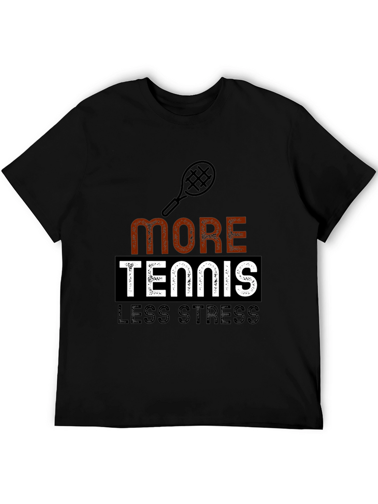This classic black t-shirt features a playful graphic design that speaks to tennis enthusiasts. The design includes a tennis racket icon above the words "MORE TENNIS LESS STRESS," with "MORE" in a textured brown-orange font, "TENNIS" boldly displayed in white within a black rectangle, and "LESS STRESS" in a solid gray font. This tee is perfect for wearing on the court, at casual events, or simply as a comfortable everyday outfit. Show off your love for tennis while promoting a relaxed lifestyle with this eye-catching and comfortable t-shirt.