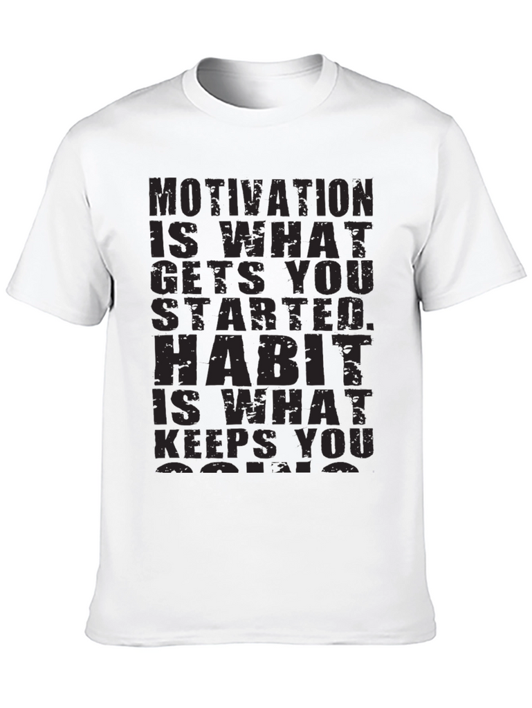 This black t-shirt features a motivational message in a distressed, dark gray font. The design emphasizes the importance of motivation and habit. Made from a soft-looking fabric, this tee offers both style and comfort. It is perfect for workouts, casual outings, or as a daily reminder to stay focused on your goals. The classic fit and crew neck make it a versatile addition to any wardrobe. This shirt makes a statement. It's an inspiring design for those who appreciate self-improvement.