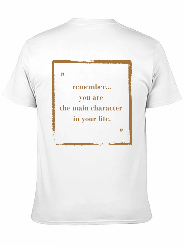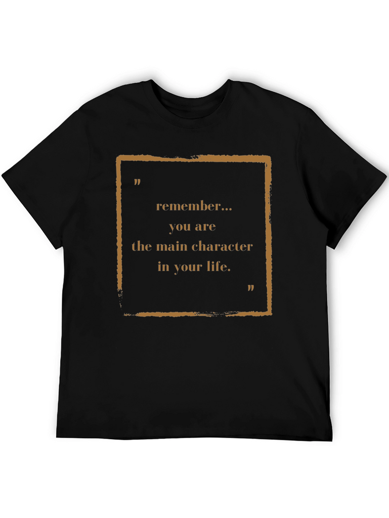 This stylish black t-shirt features a bold, framed graphic with the empowering message: "remember... you are the main character in your life." The design is printed in an earth-tone color, creating a visually appealing contrast against the shirt's dark background. Made from a comfortable-looking fabric, this tee is perfect for everyday wear and a subtle reminder to embrace your own potential. It's an ideal choice for those who appreciate motivational apparel with a modern, minimalist aesthetic. Pair it with jeans or casual pants for a relaxed yet inspiring look.
