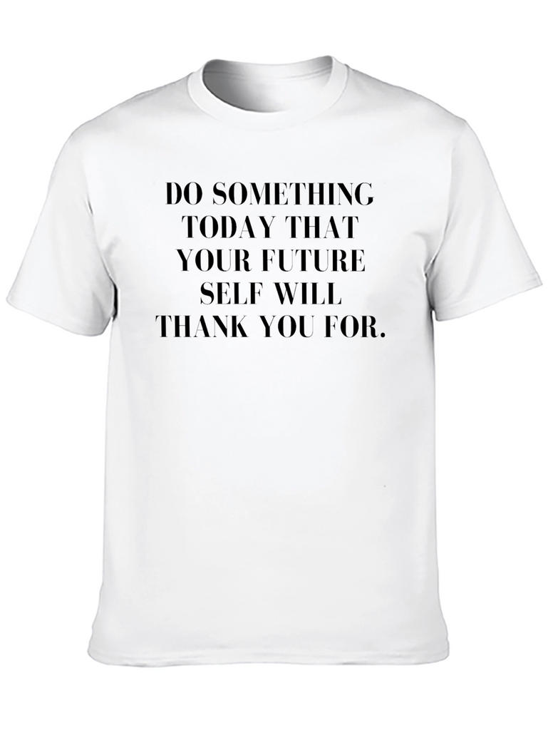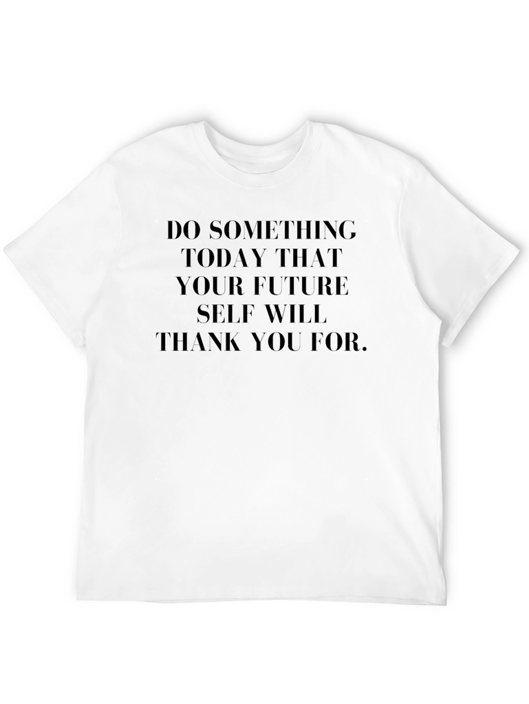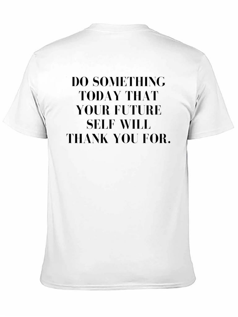 This classic black t-shirt features a powerful motivational message: "DO SOMETHING TODAY THAT YOUR FUTURE SELF WILL THANK YOU FOR." The shirt is made from a soft-looking fabric, offering both comfort and style. The message is prominently displayed in a bold, readable font, making it a great conversation starter and a source of daily inspiration. Perfect for casual wear, workouts, or as a thoughtful gift, this t-shirt is a reminder to stay focused on your goals. Its versatile design makes it easy to pair with jeans, shorts, or any other wardrobe staples. Embrace a positive mindset and wear your motivation with pride!