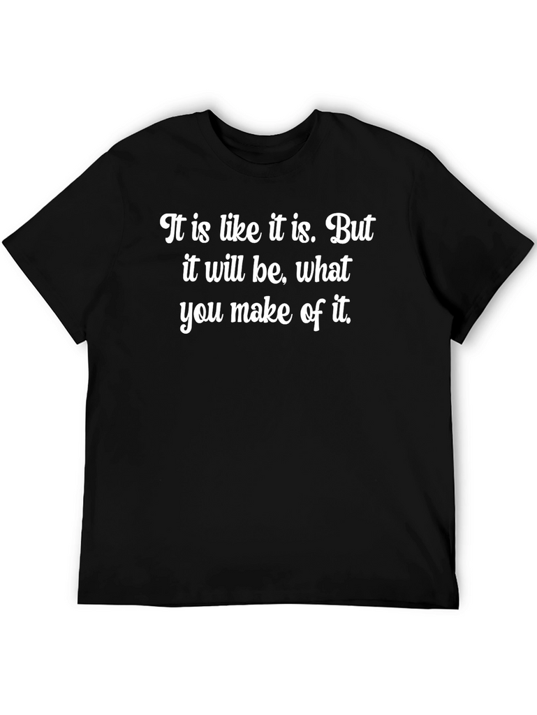 This classic black tee features a bold, white font displaying a motivational message. Made from what appears to be soft, comfortable fabric, this casual shirt is perfect for everyday wear and for those who want to spread positivity. The shirt is designed for a relaxed fit and is suitable for various body types. This t-shirt is ideal for casual outings, gym sessions, or simply lounging at home. Easy to pair with jeans, shorts, or joggers, this t-shirt adds a touch of inspiration to your wardrobe. Be reminded that 'It is like it is. But it will be, what you make of it.'