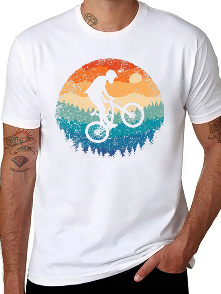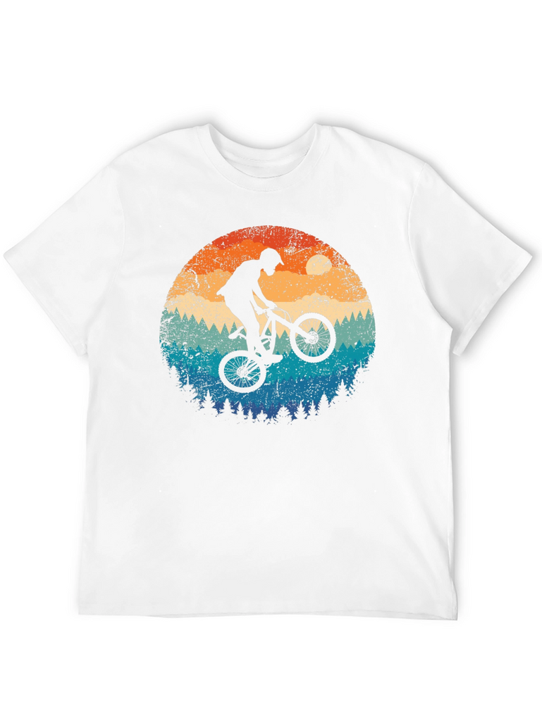 Capture the spirit of adventure with this unique graphic tee. The shirt features a retro-style circular design showcasing a mountain biker silhouette against a sunset backdrop. The design incorporates a gradient of orange, yellow, and blue, evoking a sense of freedom and exploration. Made from a comfortable, breathable fabric, this tee is perfect for casual wear or outdoor activities. Show off your passion for biking with this stylish and eye-catching shirt, ideal for everyday wear or as a gift for the cycling enthusiast in your life.
