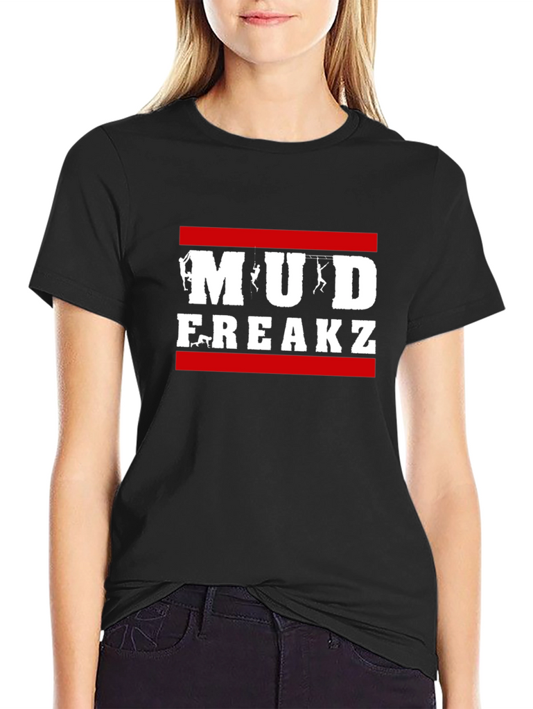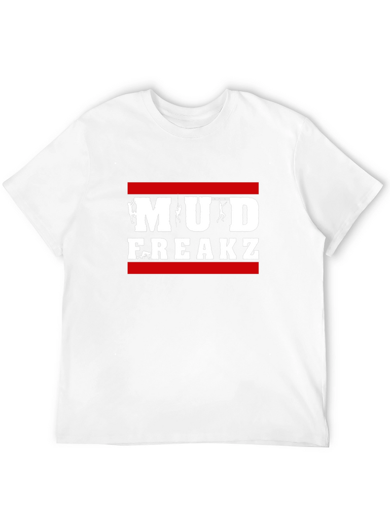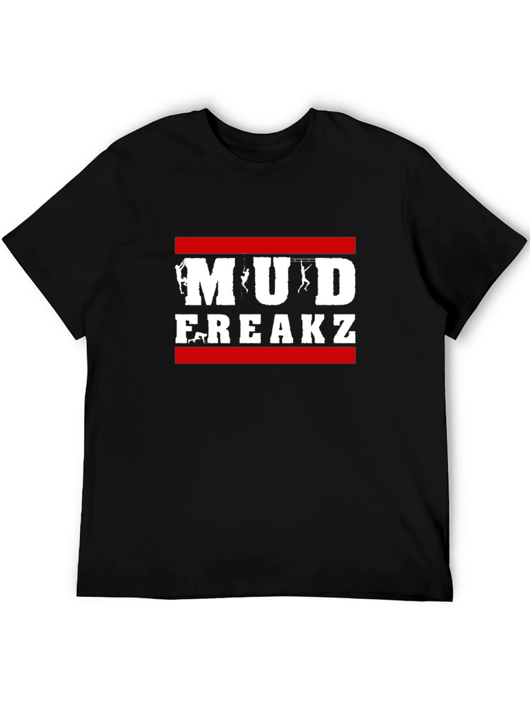 Show off your adventurous side with this bold black t-shirt! Featuring the phrase "Mud Freakz" emblazoned across the chest in white block letters, and framed with a red bar above and below, it's perfect for outdoor enthusiasts. The graphic incorporates silhouettes of climbers, adding a unique touch. Made from a soft, comfortable fabric, this short-sleeved tee is ideal for casual wear or your next muddy adventure. Let everyone know you're ready to get down and dirty in style with this eye-catching design!