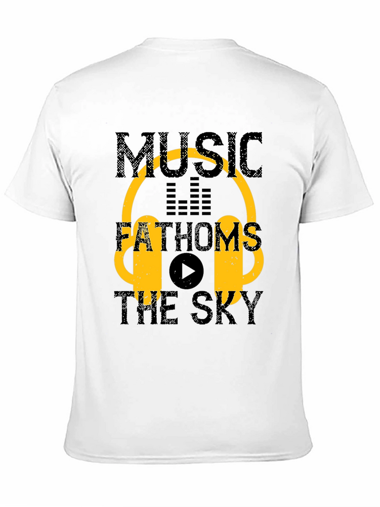 Showcase your love for music with this stylish black t-shirt. The shirt features a bold graphic design incorporating headphones, sound equalizer bars, and the phrase 'Music Fathoms the Sky'. The design is distressed, giving it a cool, vintage aesthetic. Perfect for casual wear, concerts, or expressing your personality. The standard fit and classic style makes it versatile for different occasions. Add this unique piece to your wardrobe today!