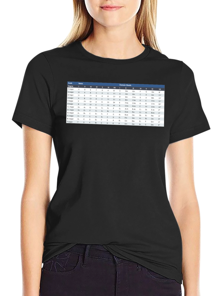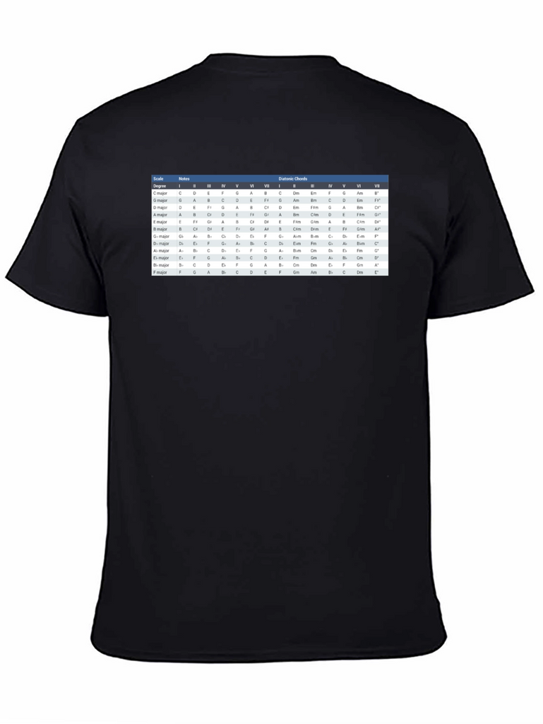 Show off your musical side with this unique t-shirt! This black tee features a detailed chord chart showcasing scales, notes, and diatonic chords. The handy reference guide makes this shirt perfect for musicians, music students, or anyone passionate about music theory. Crafted from a comfortable fabric, this shirt is suitable for everyday wear. Whether you're attending a concert, jamming with friends, or simply expressing your love for music, this shirt is a great conversation starter. Grab yours today and let your passion for music shine!