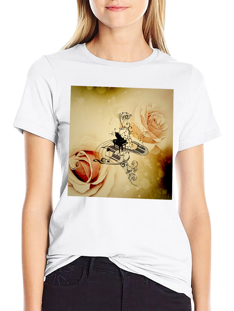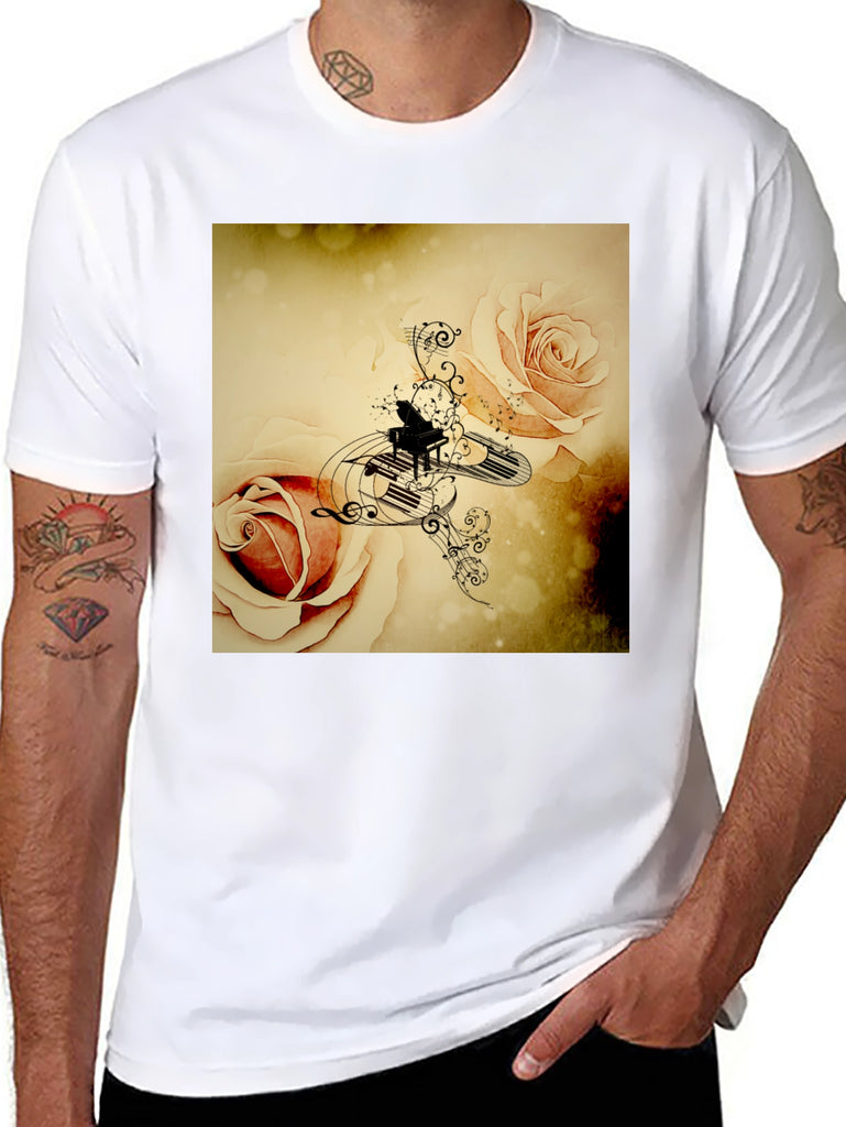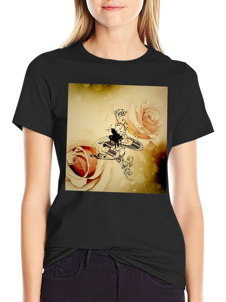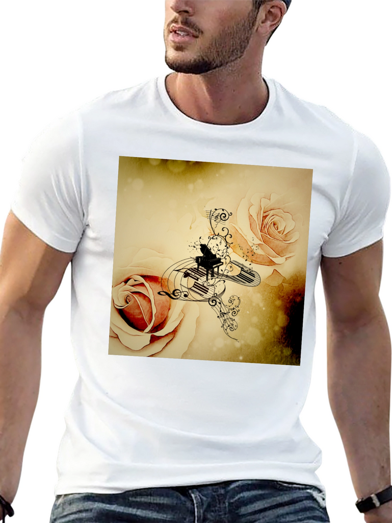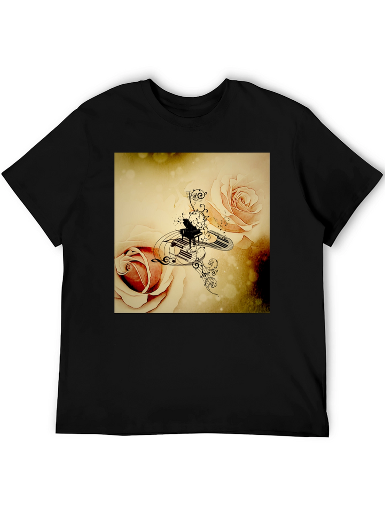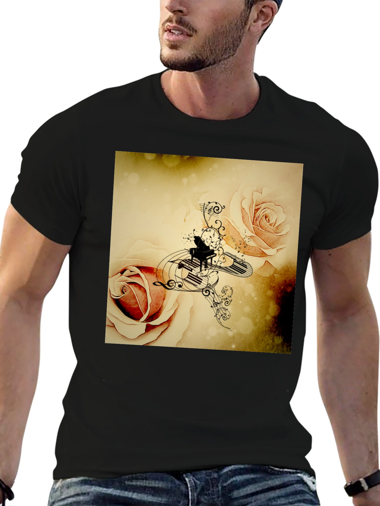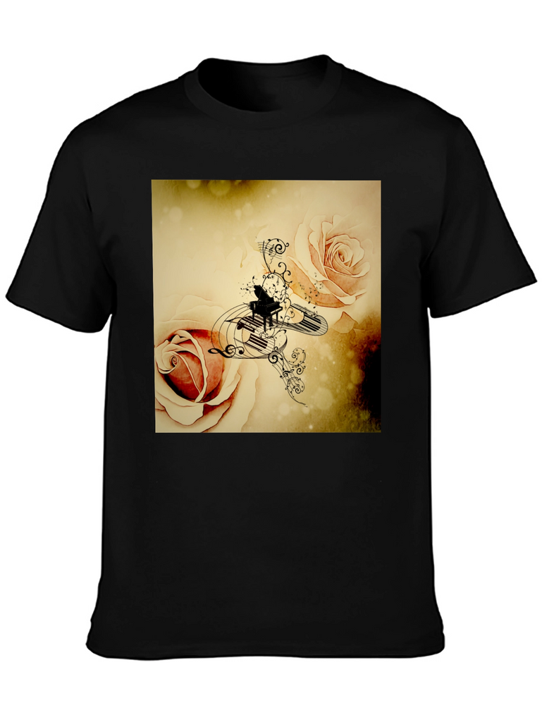 Elevate your style with this unique black t-shirt featuring a beautiful musical rose design. The elegant graphic combines roses with music-themed elements like notes and a piano, creating a visually stunning effect. Made from soft, breathable fabric, this tee offers all-day comfort and a perfect fit. Ideal for music lovers and art enthusiasts alike, this t-shirt can be dressed up or down, making it suitable for concerts, casual outings, or simply expressing your artistic flair. Stand out from the crowd with this eye-catching and comfortable musical rose t-shirt!