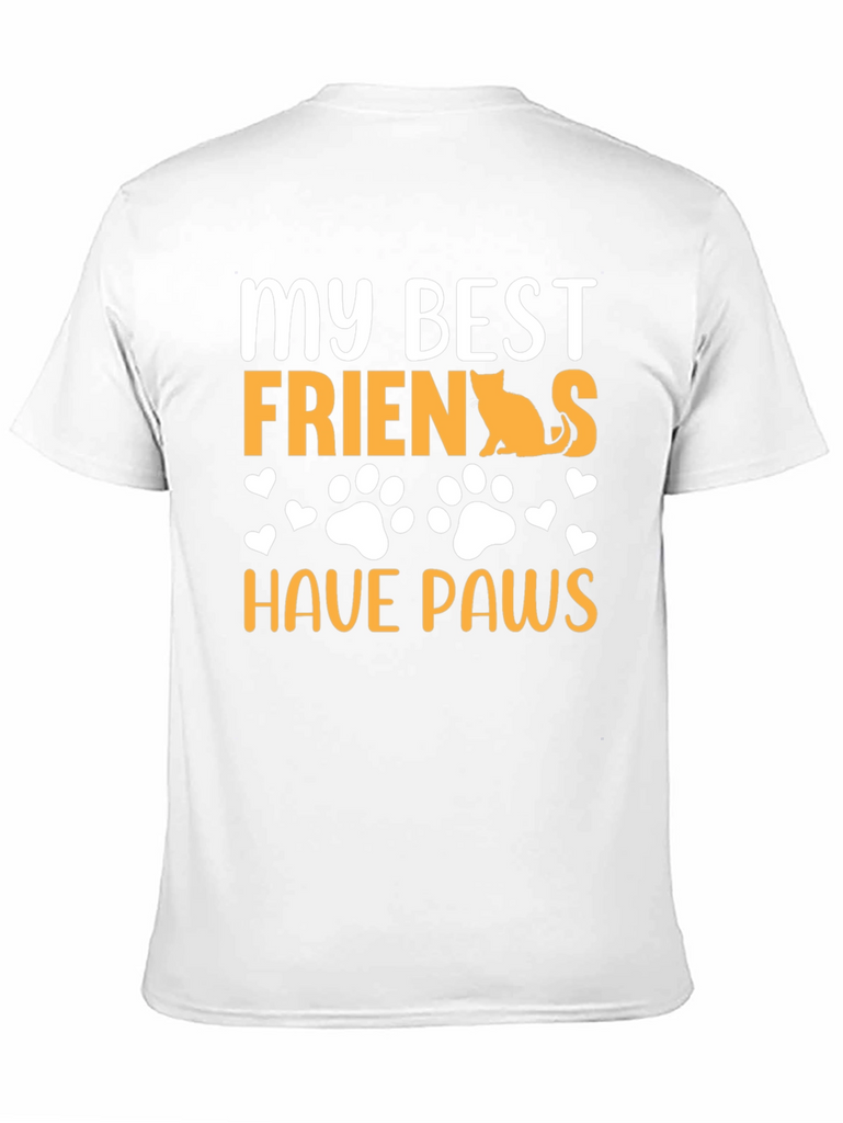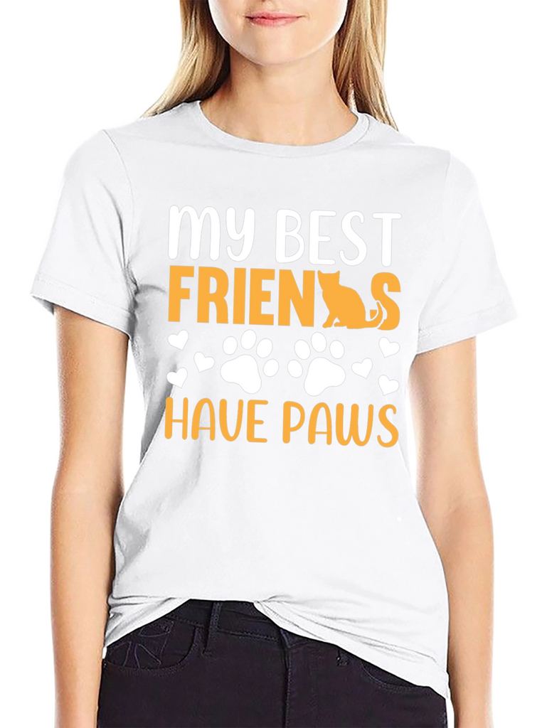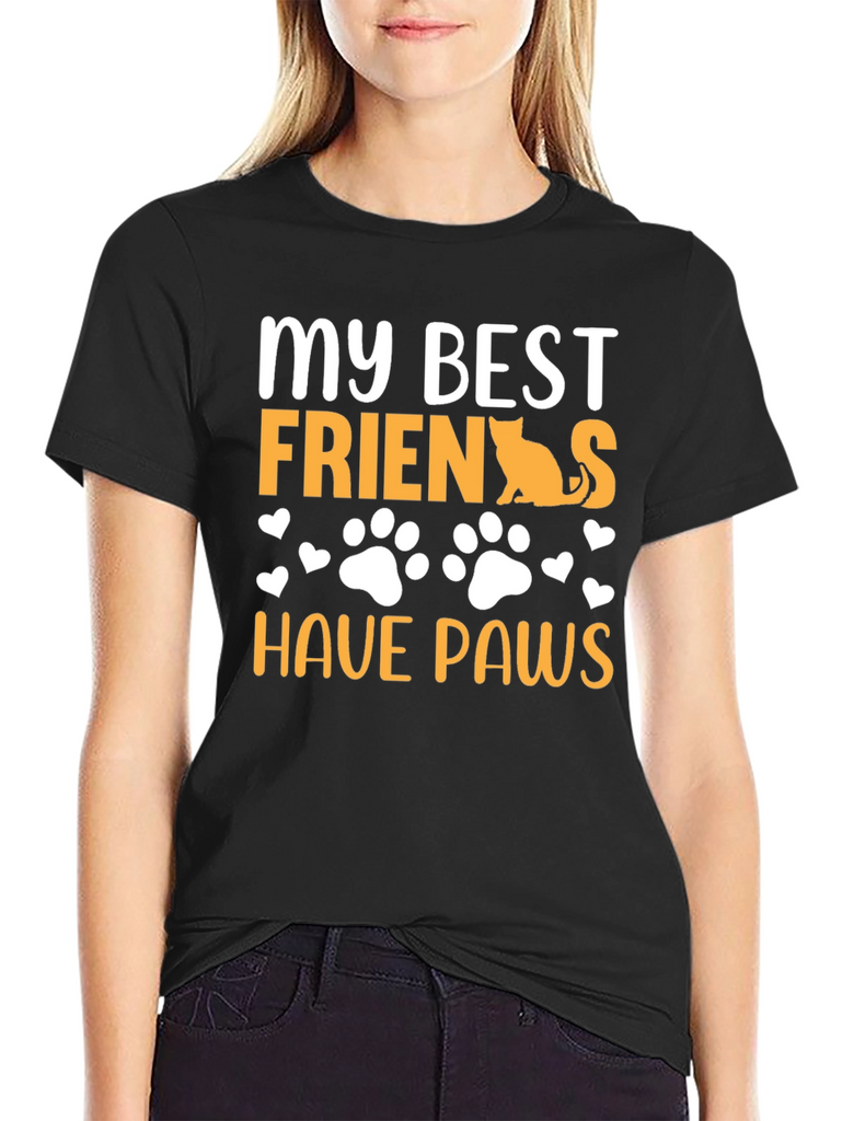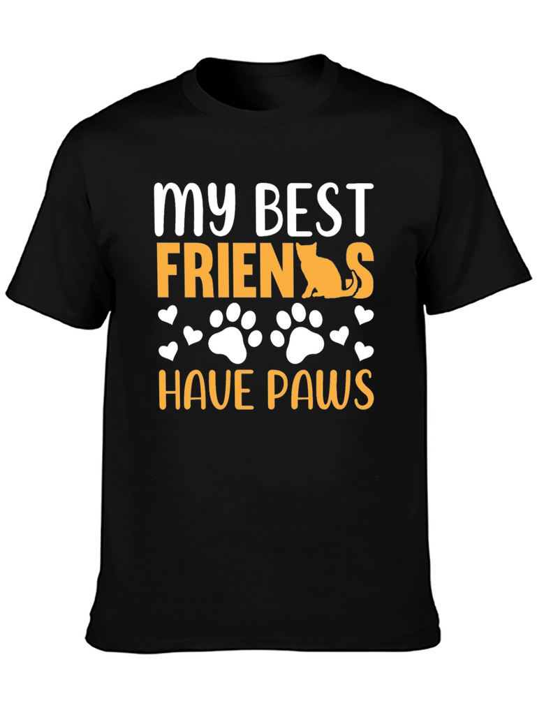 Show off your love for furry friends with this unique graphic t-shirt. The design features the phrase "My Best Friends" in white, followed by “Friends” and “Have Paws” in orange. A cute cat illustration replaces a letter in the word "Friends". Paw prints and hearts accent the design, making it a perfect gift for cat lovers. Made from a comfortable black material, this tee is ideal for casual wear, pet events, or simply expressing your passion for animals. It's a stylish and fun way to celebrate the joy pets bring into our lives. Great for everyday wear!