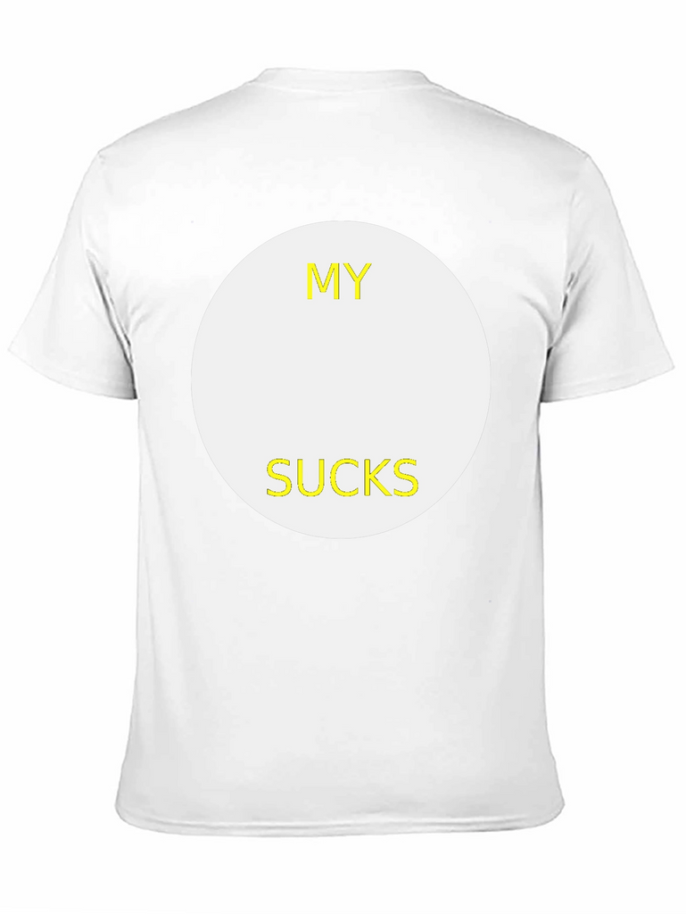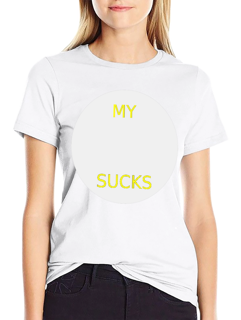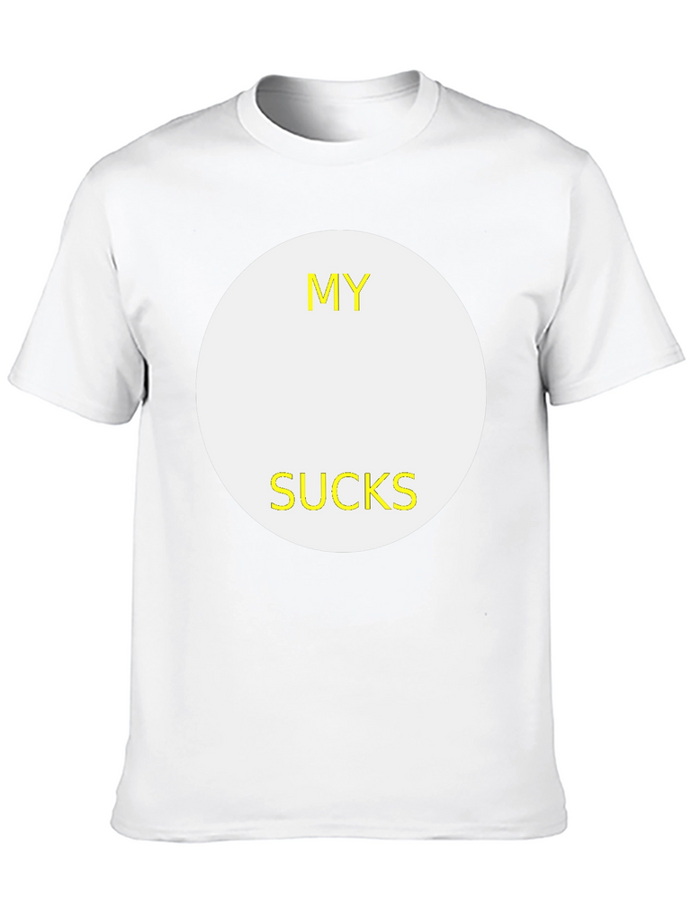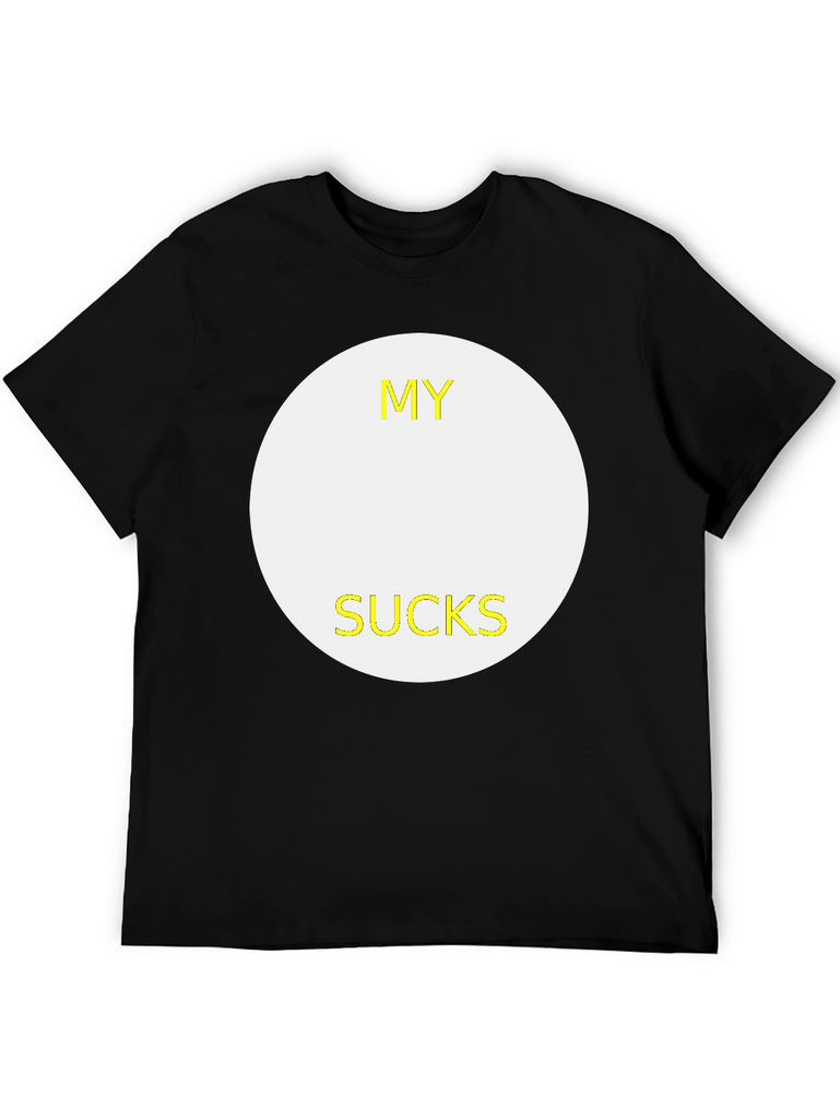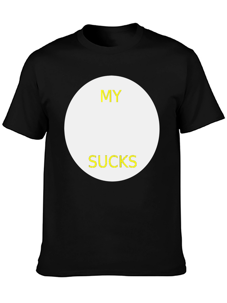 This black crew neck t-shirt features a bold, humorous graphic. A large white circle dominates the center, with the words 'MY' above and 'SUCKS' below in yellow, leaving space for personalization. The shirt appears to be made of soft, comfortable cotton or a cotton blend. It is a casual and eye-catching top for everyday wear. This tee is perfect for making a statement or expressing your playful side, great for casual outings, social gatherings, or just relaxing at home. It will add a touch of humor to any outfit!