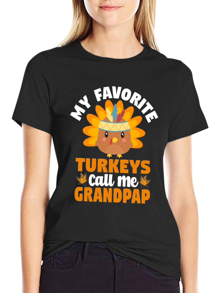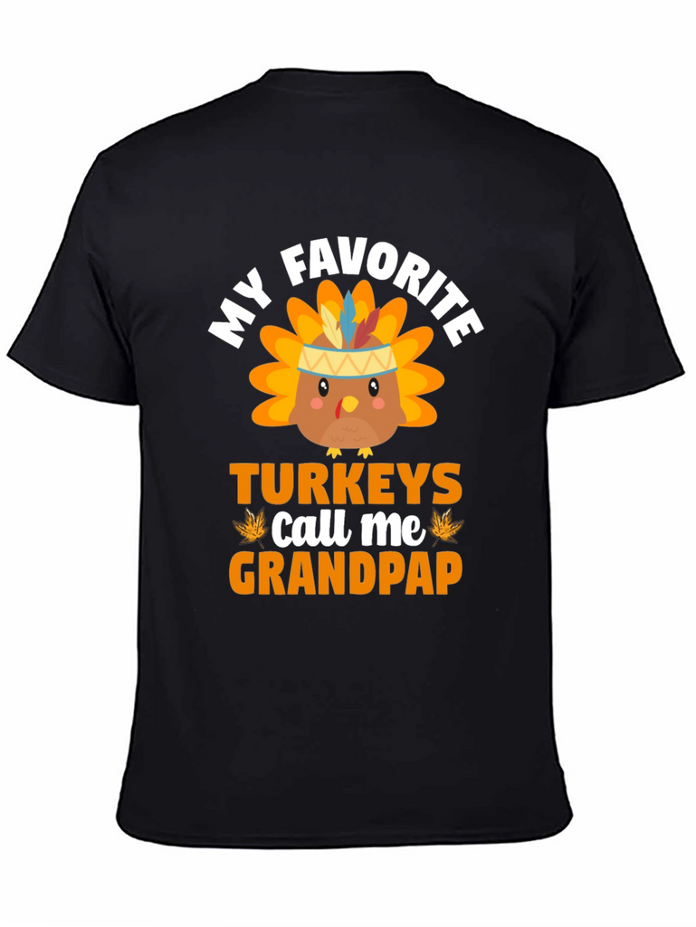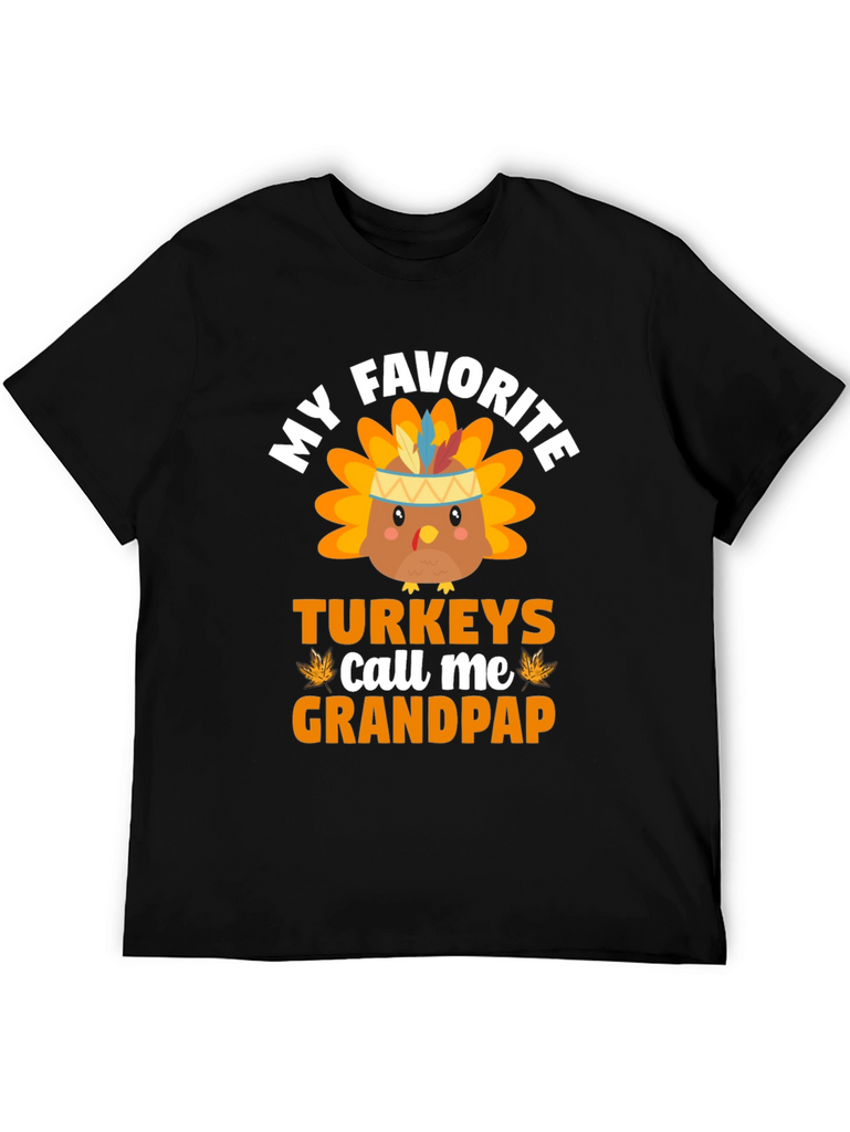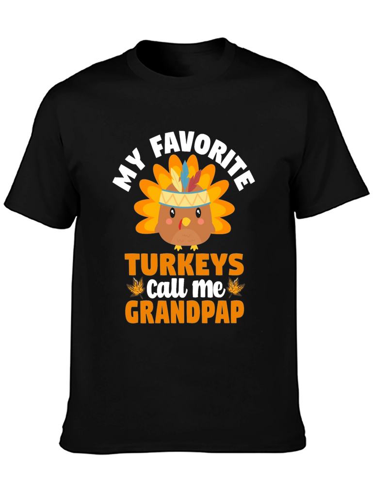 Celebrate Thanksgiving with this fun and festive t-shirt! The shirt features a cute cartoon turkey wearing a Native American headdress, surrounded by the playful text 'My Favorite Turkeys Call Me Grandpap'. The design is printed in bold white and orange lettering on a black, classic-fit tee. Perfect for grandfathers who love Thanksgiving and want to show off their family pride. This comfortable and stylish shirt is ideal for holiday gatherings, family dinners, or casual everyday wear. Get yours today and be the coolest grandpap at the Thanksgiving table!