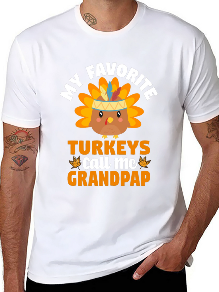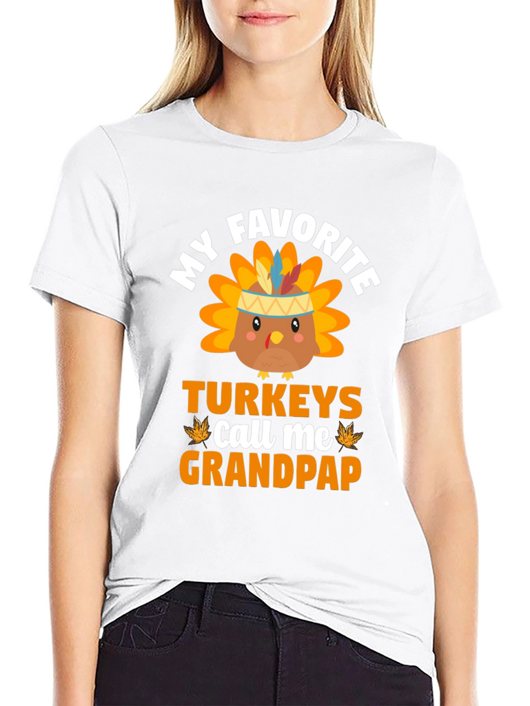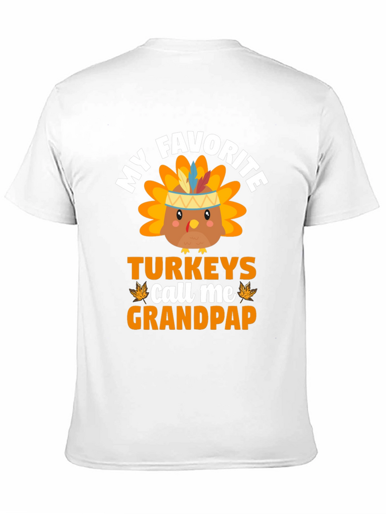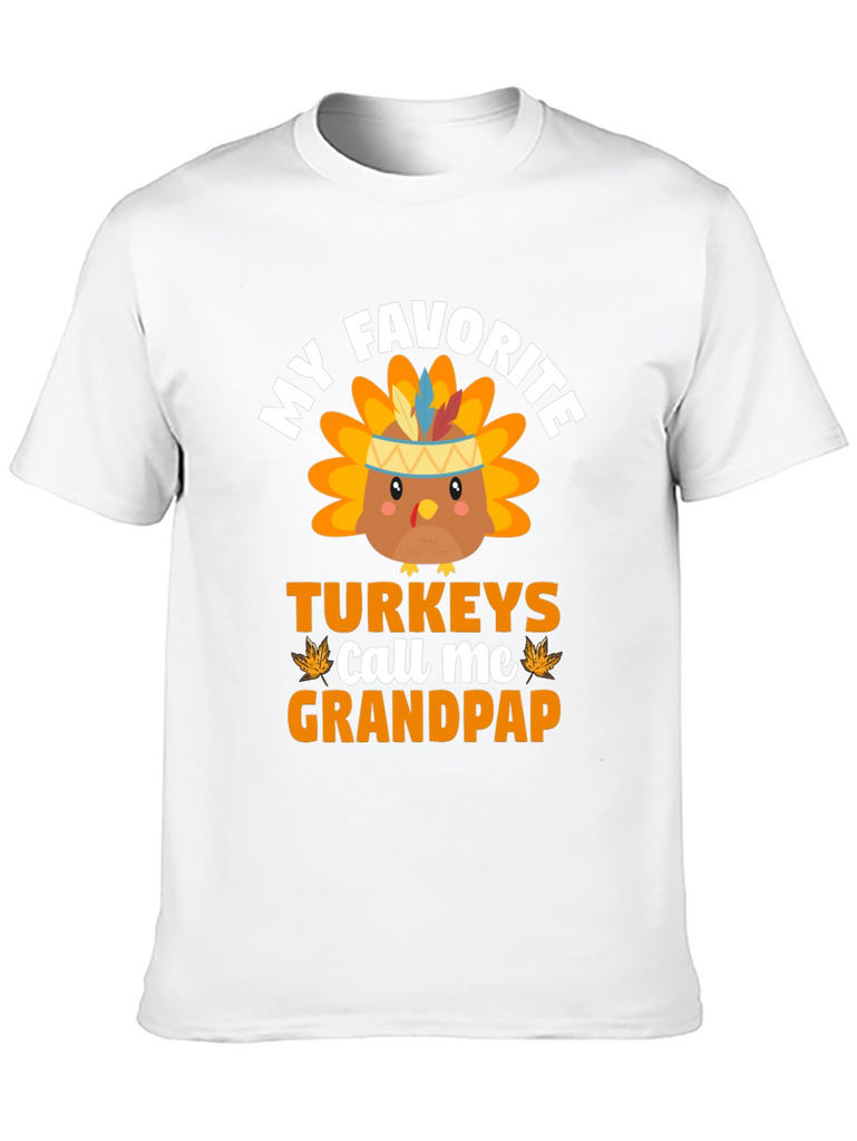 Celebrate Thanksgiving with this fun and festive t-shirt! The shirt features a cute cartoon turkey wearing a Native American headdress, surrounded by the playful text 'My Favorite Turkeys Call Me Grandpap'. The design is printed in bold white and orange lettering on a black, classic-fit tee. Perfect for grandfathers who love Thanksgiving and want to show off their family pride. This comfortable and stylish shirt is ideal for holiday gatherings, family dinners, or casual everyday wear. Get yours today and be the coolest grandpap at the Thanksgiving table!