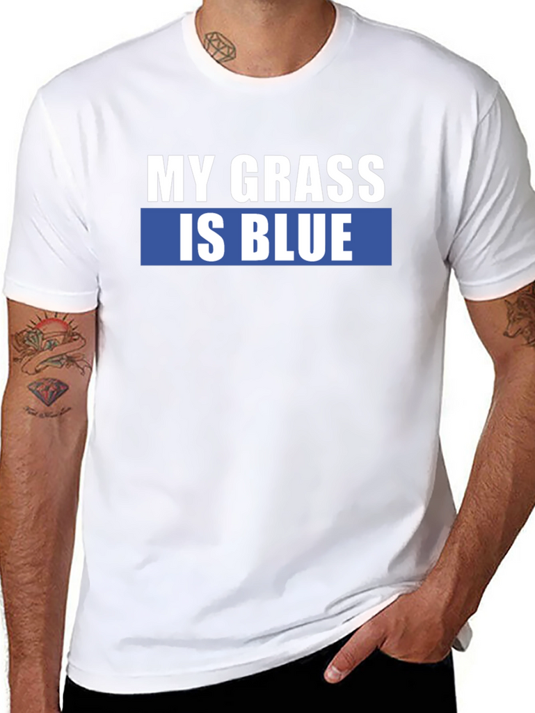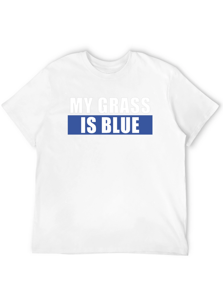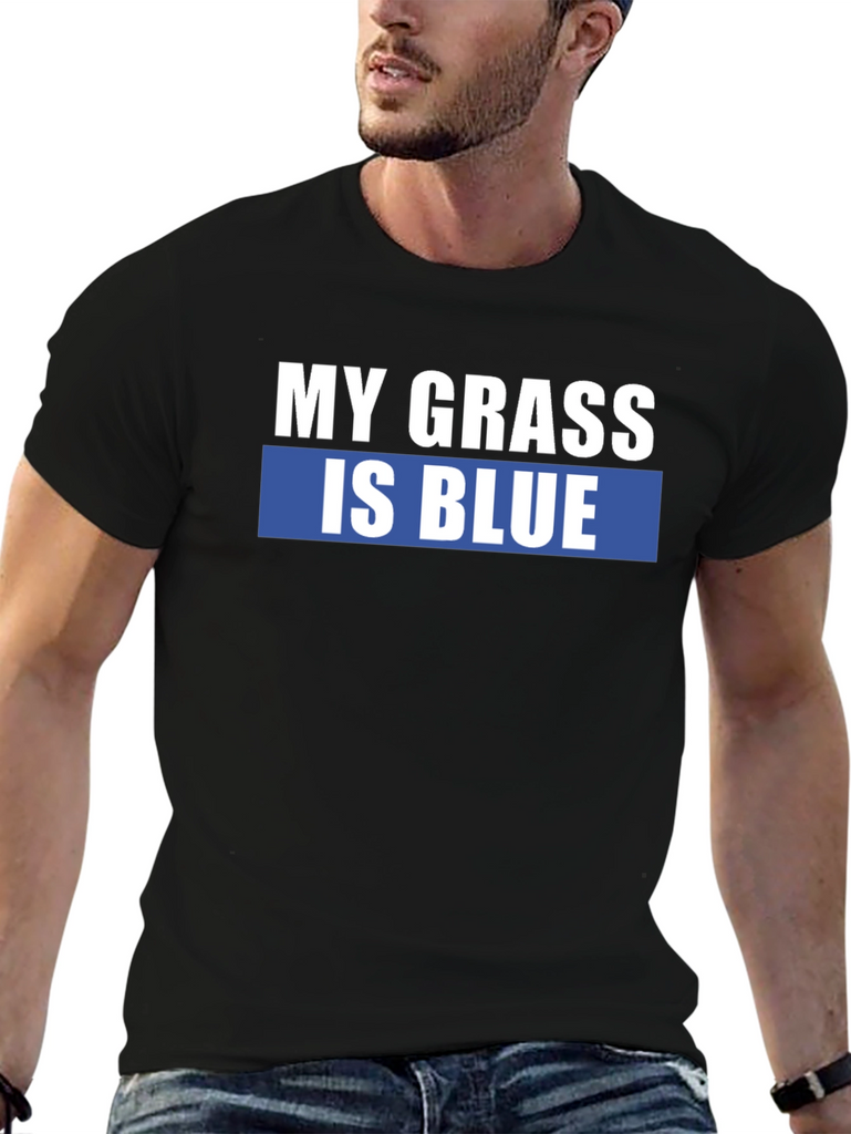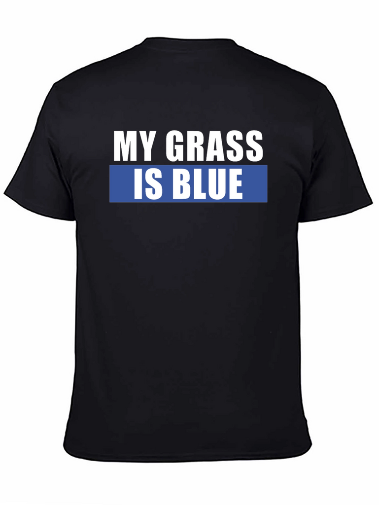 Make a statement with this eye-catching black t-shirt! Featuring a bold white "MY GRASS IS BLUE" graphic set against a striking blue stripe, this tee is sure to turn heads. Made from a comfortable material, this regular fit shirt offers both style and wearability. The short-sleeved design is perfect for casual outings, lounging at home, or making a statement wherever you go. The design is printed with high-quality ink for a durable and long-lasting print. Show off your unique sense of humor and stand out from the crowd with this trendy and unique graphic tee.