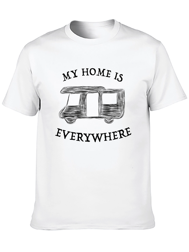 Embrace your wanderlust with this unique graphic tee! This stylish black t-shirt features a sketched camper graphic alongside the phrase 'My Home Is Everywhere', perfect for travel enthusiasts and free spirits. Made from a comfortable-looking fabric, this tee is ideal for everyday wear, road trips, camping adventures, or simply expressing your love for the open road. The design is minimalist yet eye-catching, making it a great conversation starter. Show off your adventurous side with this must-have addition to your wardrobe. Let your shirt reflect your love for travel and exploration!