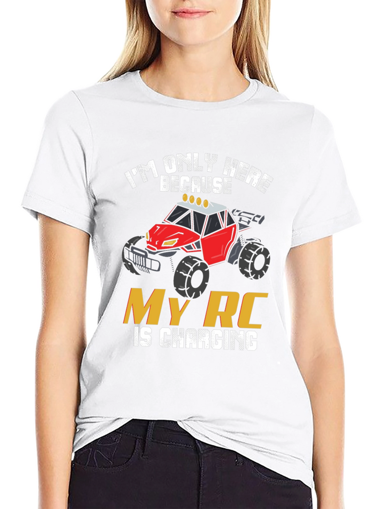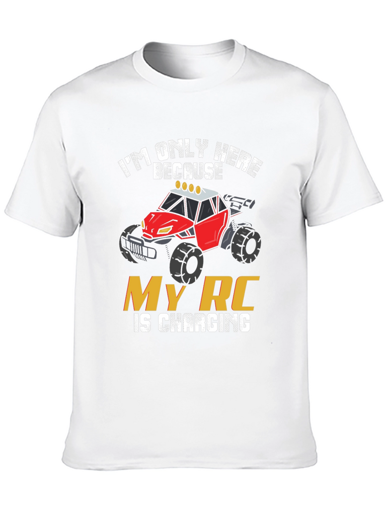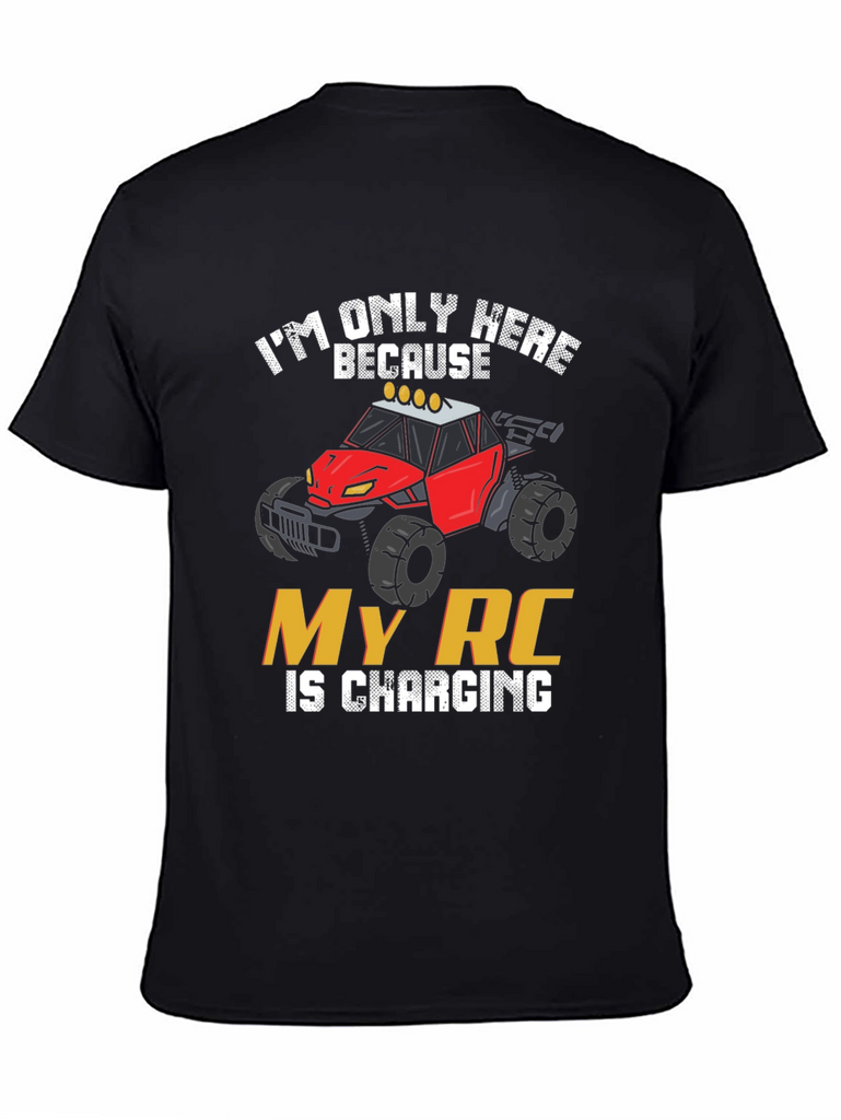 Show off your love for remote control cars with this fun graphic tee! The black t-shirt features a red RC car illustration with the phrase 'I'm Only Here Because My RC Is Charging'. Made from a comfortable fabric, this shirt is perfect for casual wear, RC car meets, or just lounging around while your favorite toy powers up. A great conversation starter for hobbyists and RC enthusiasts. The vibrant design and bold text make it a standout piece in any wardrobe. Express your passion and sense of humor with this unique t-shirt.