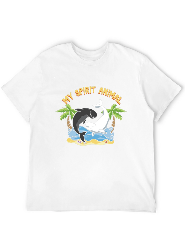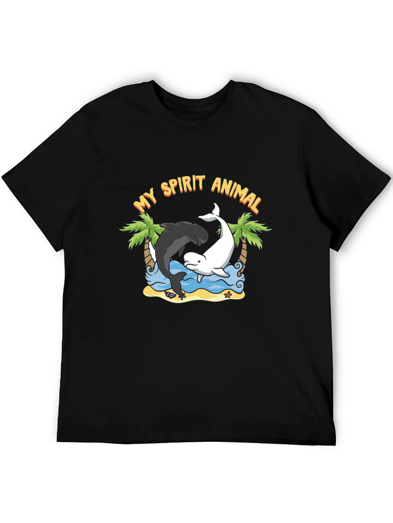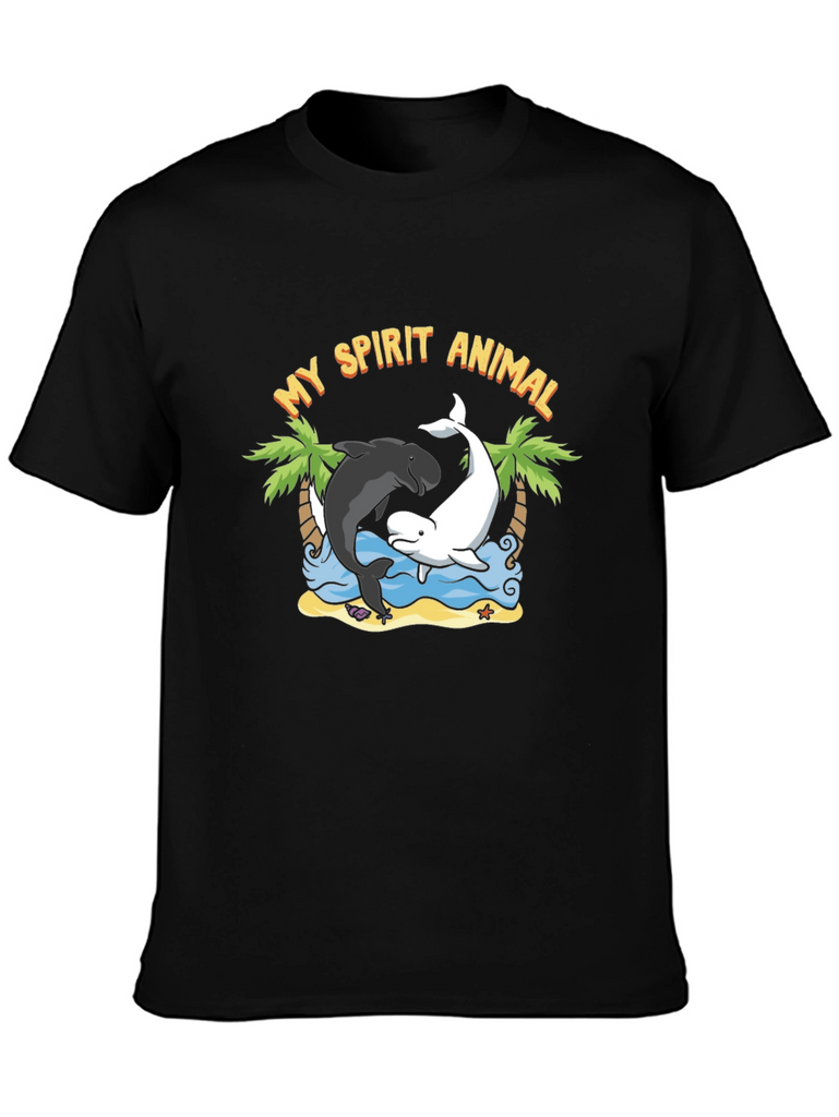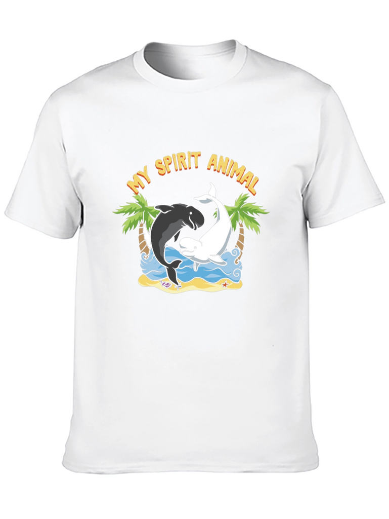 Show off your love for marine life with this unique "My Spirit Animal" T-shirt. Featuring a playful design of two cartoon dolphins beneath palm trees on a sunny beach. The shirt itself appears to be made of a comfortable, breathable material. The graphic design is colorful and eye-catching, making it a great conversation starter. This T-shirt is perfect for casual wear, beach outings, or as a fun gift for animal lovers. Wear your passion for dolphins and the ocean with pride. Great for everyday style.