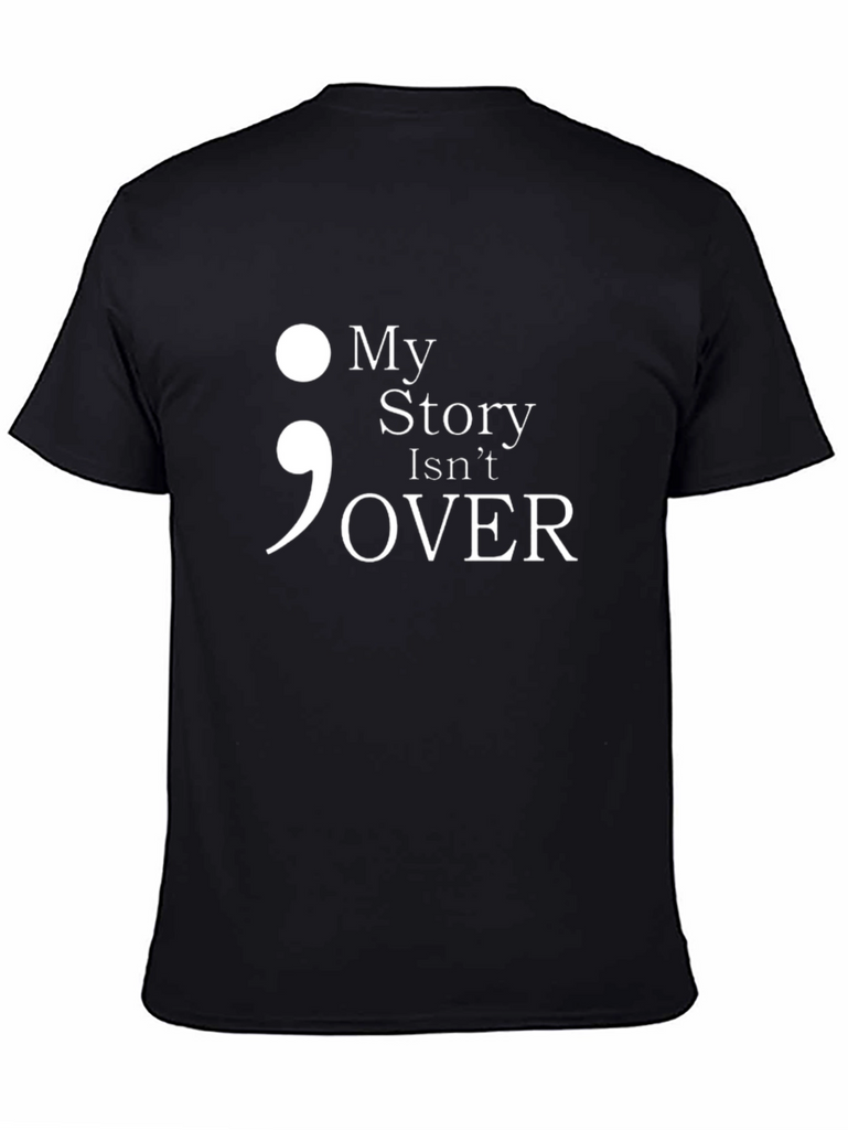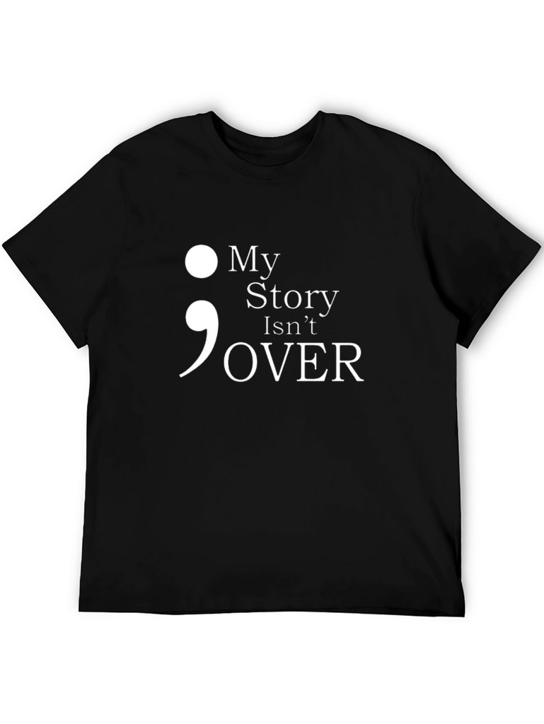 Show your support for mental health awareness with this powerful statement t-shirt. Crafted from a soft, breathable fabric, this tee features a semicolon design alongside the inspiring message "My Story Isn't Over." The bold white print stands out against the classic black background, making it a versatile piece for everyday wear. Whether you're looking to spread a message of hope, start a conversation, or simply express your own journey, this shirt is a perfect choice. Great for casual outings, support groups, or as a thoughtful gift for someone special.