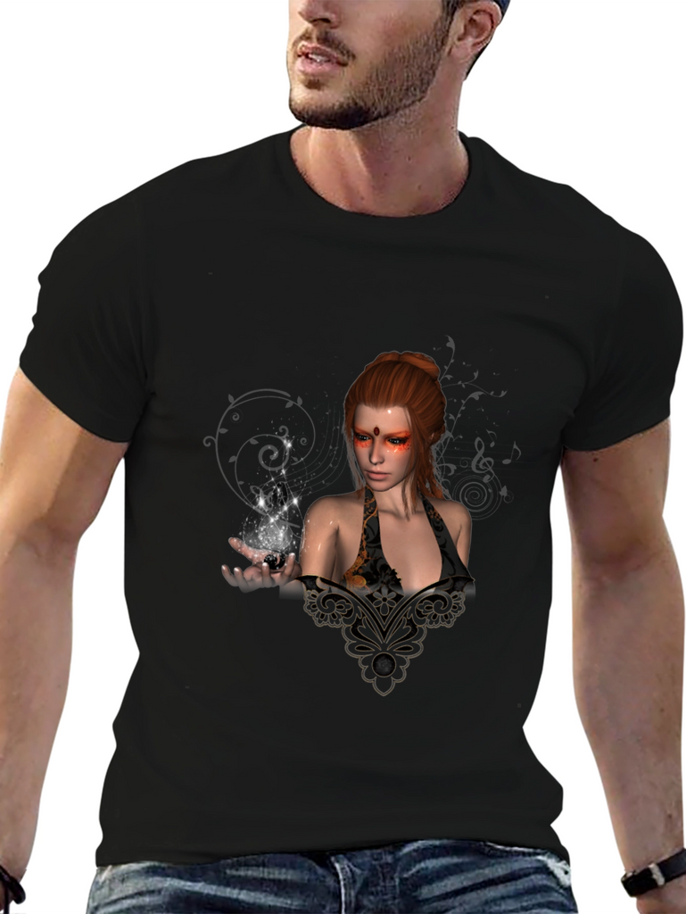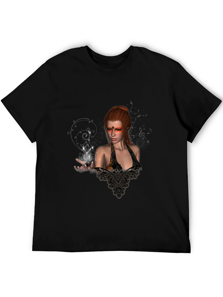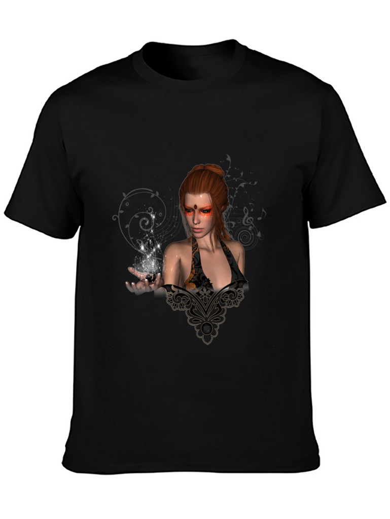 Embrace the enigmatic with this eye-catching black t-shirt. It features a captivating graphic of a mystic woman holding a shimmering orb, adding a touch of fantasy to your everyday style. The intricate design is printed on a soft, comfortable fabric, ensuring both style and comfort. This unique tee is perfect for casual outings, concerts, or expressing your individuality. Stand out from the crowd with this mesmerizing piece!