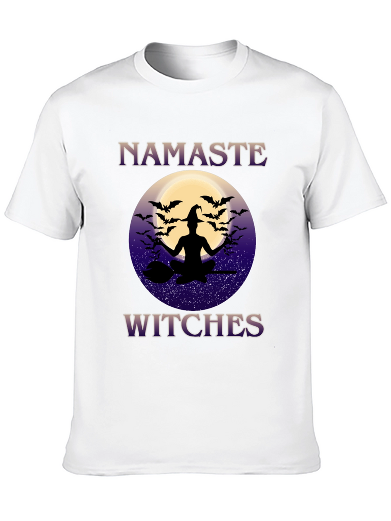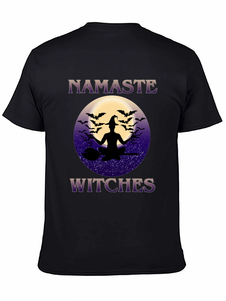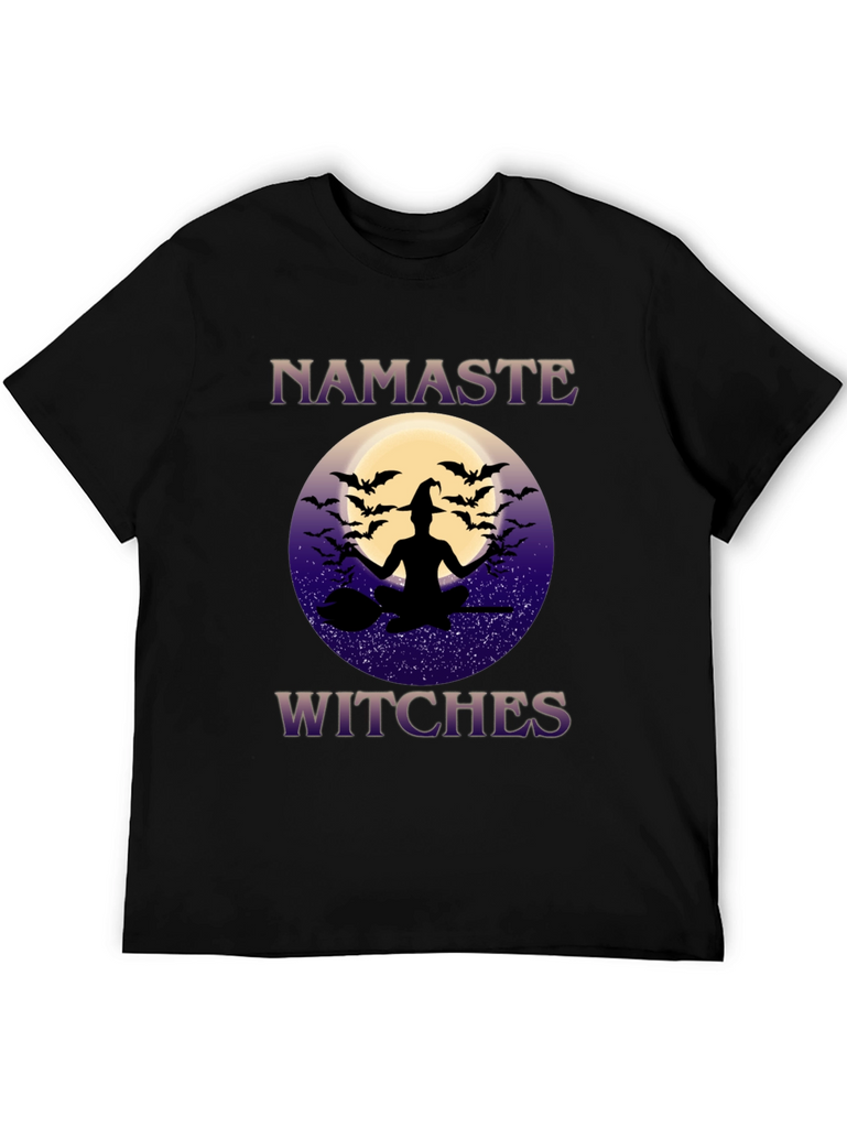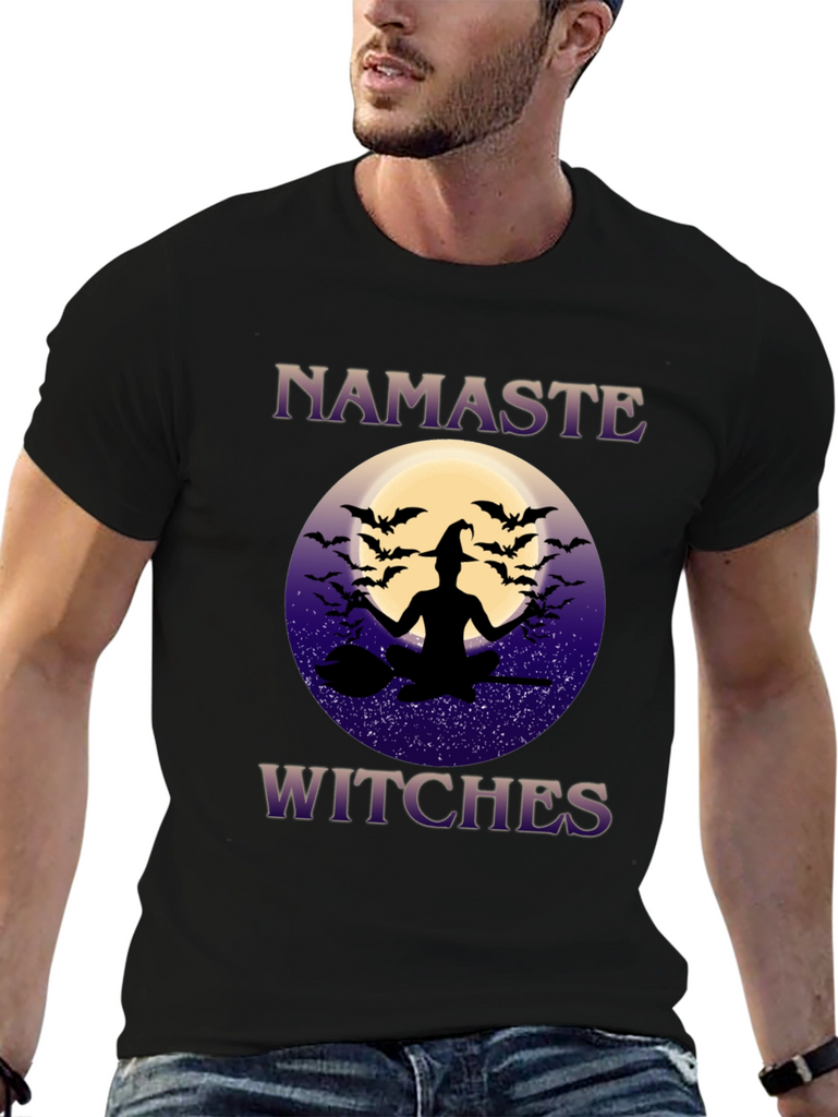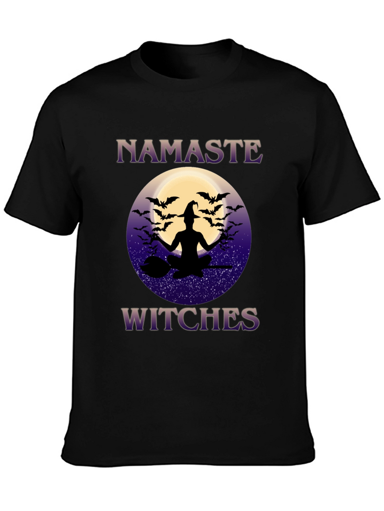 Embrace the spooky season with this unique 'Namaste Witches' t-shirt. This eye-catching black tee features a Halloween-themed graphic with a silhouette of a witch meditating on a broomstick against a full moon backdrop, surrounded by bats. The design is creatively textured and rendered in purple and yellow hues. Crafted from a soft, comfortable fabric, this shirt is perfect for Halloween parties, yoga sessions, or casual wear. Show off your playful side and zen spirit with this fun and festive tee. A must-have for Halloween enthusiasts and yoga lovers alike!