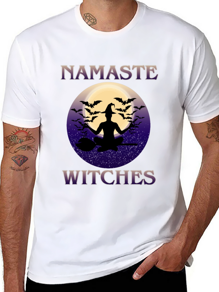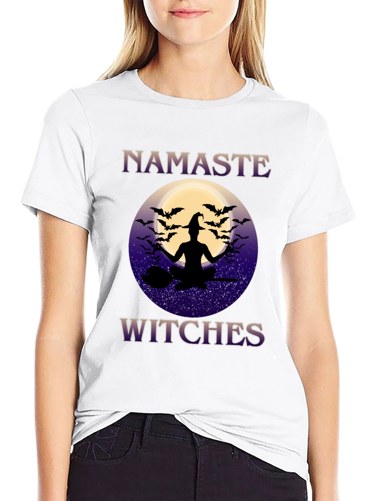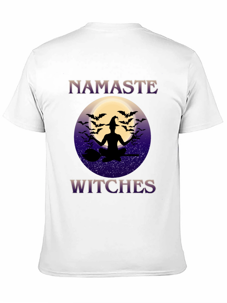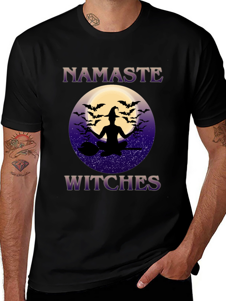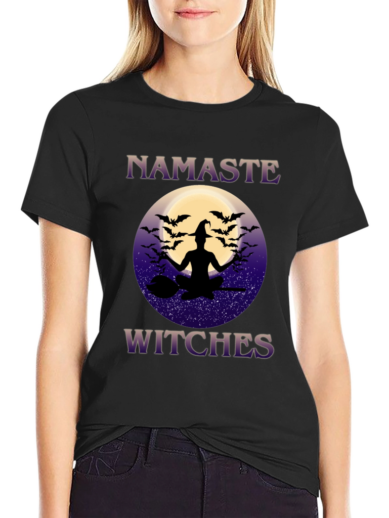 Embrace the spooky season with this unique 'Namaste Witches' t-shirt. This eye-catching black tee features a Halloween-themed graphic with a silhouette of a witch meditating on a broomstick against a full moon backdrop, surrounded by bats. The design is creatively textured and rendered in purple and yellow hues. Crafted from a soft, comfortable fabric, this shirt is perfect for Halloween parties, yoga sessions, or casual wear. Show off your playful side and zen spirit with this fun and festive tee. A must-have for Halloween enthusiasts and yoga lovers alike!