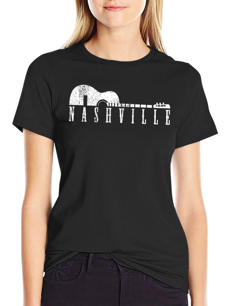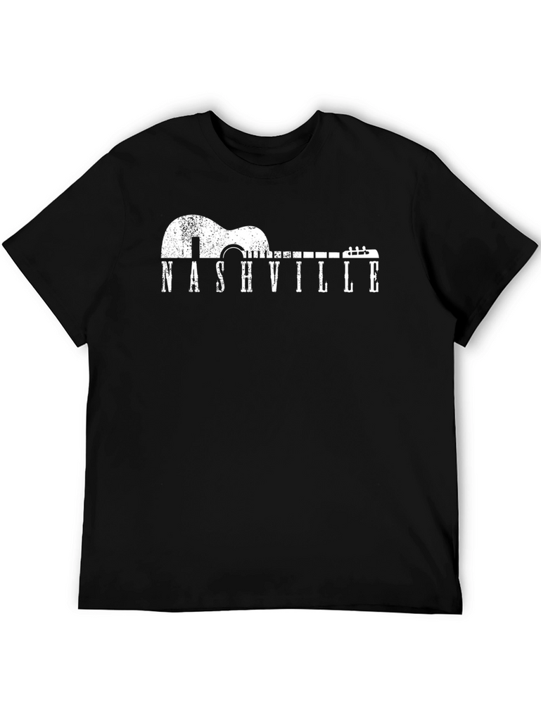 Show your love for Music City with this stylish black t-shirt. The design features a distressed guitar silhouette with "NASHVILLE" printed in a classic, Western-style font. Made from what appears to be a comfortable cotton blend, this tee is perfect for everyday wear. The white graphic pops against the black background, making it a versatile piece for your wardrobe. Whether you're a musician, a country music fan, or simply love Nashville, this shirt is a must-have. Dress it up with a jacket or keep it casual with jeans - ideal for concerts, casual outings, or just relaxing at home. The perfect gift for the music lover in your life!