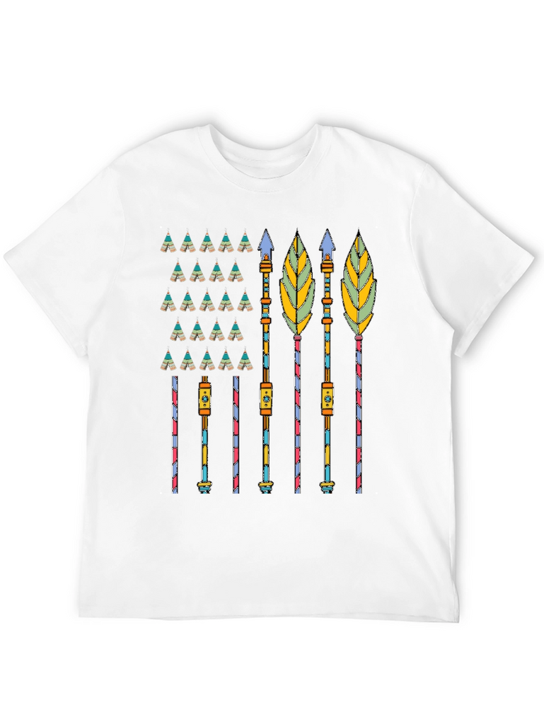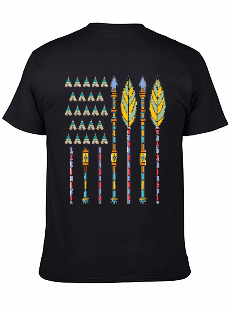 Showcase your unique style with this eye-catching graphic tee. The design features an array of colorful tepees and detailed native arrows, creating a bold and artistic statement. Made from a comfortable, breathable fabric, this tee is perfect for everyday wear. Pair it with jeans or shorts for a casual look, or dress it up with a jacket for a more stylish ensemble. This distinctive tee is sure to turn heads and spark conversations. Get yours today and express your individuality!