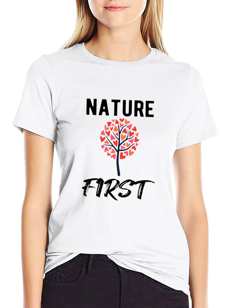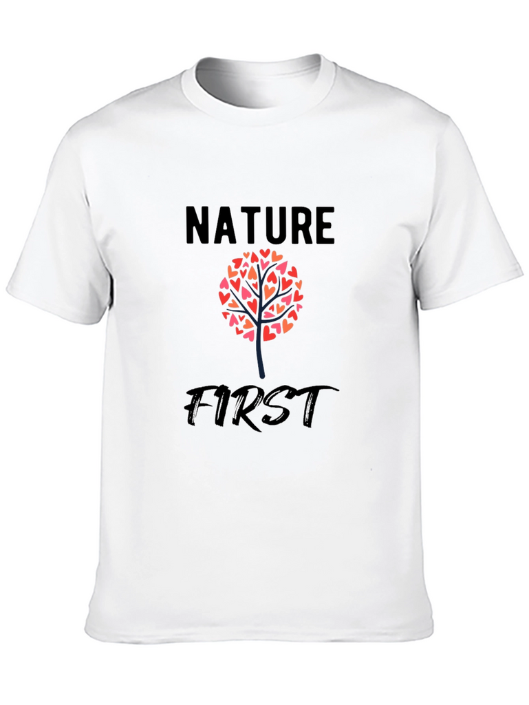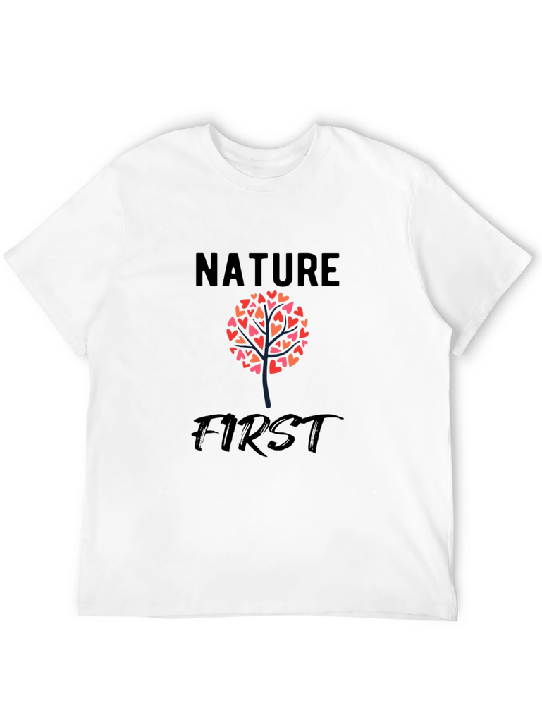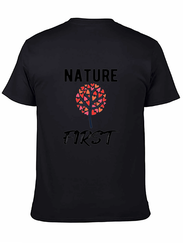 Show your love for nature with this stylish black t-shirt. Featuring a unique 'Nature First' design with a tree composed of vibrant red and peach hearts, this tee is sure to make a statement. Made from comfortable, breathable fabric, this shirt is perfect for everyday wear, casual outings, or environmental events. The classic fit ensures a flattering look for all body types. Embrace sustainability and make a fashion statement with this eye-catching graphic tee. A great gift for nature lovers and eco-conscious individuals. Stand out and express your passion for the planet!