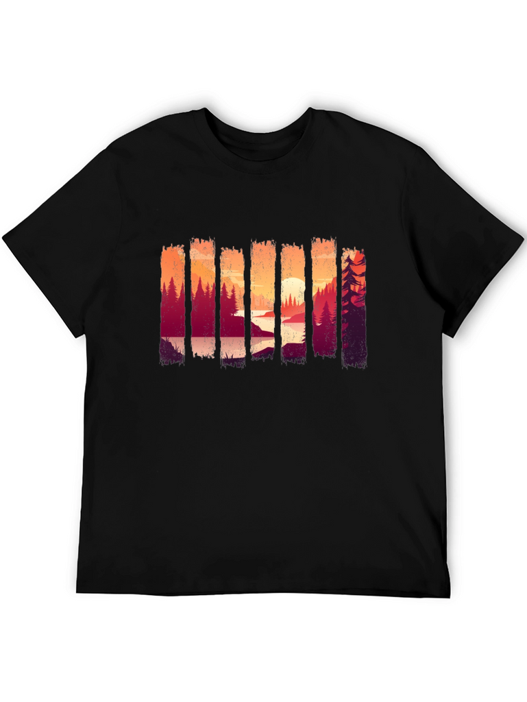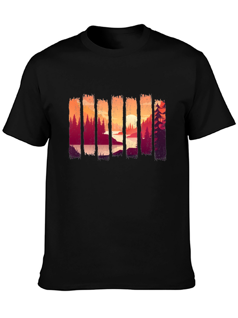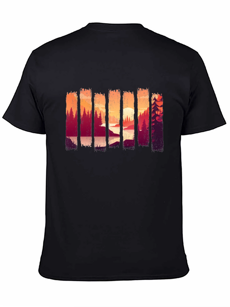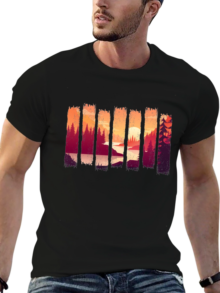 Showcase your love for the outdoors with this stylish black t-shirt. The shirt features a unique and eye-catching graphic design of a forest landscape at sunset, adding a touch of nature-inspired charm to your wardrobe. Made from comfortable and breathable fabric, this tee is perfect for everyday wear, casual outings, or weekend adventures. Its versatile design makes it easy to pair with jeans, shorts, or joggers for a relaxed and trendy look. The striking scenery print ensures you'll stand out in style, making it an ideal choice for nature enthusiasts.