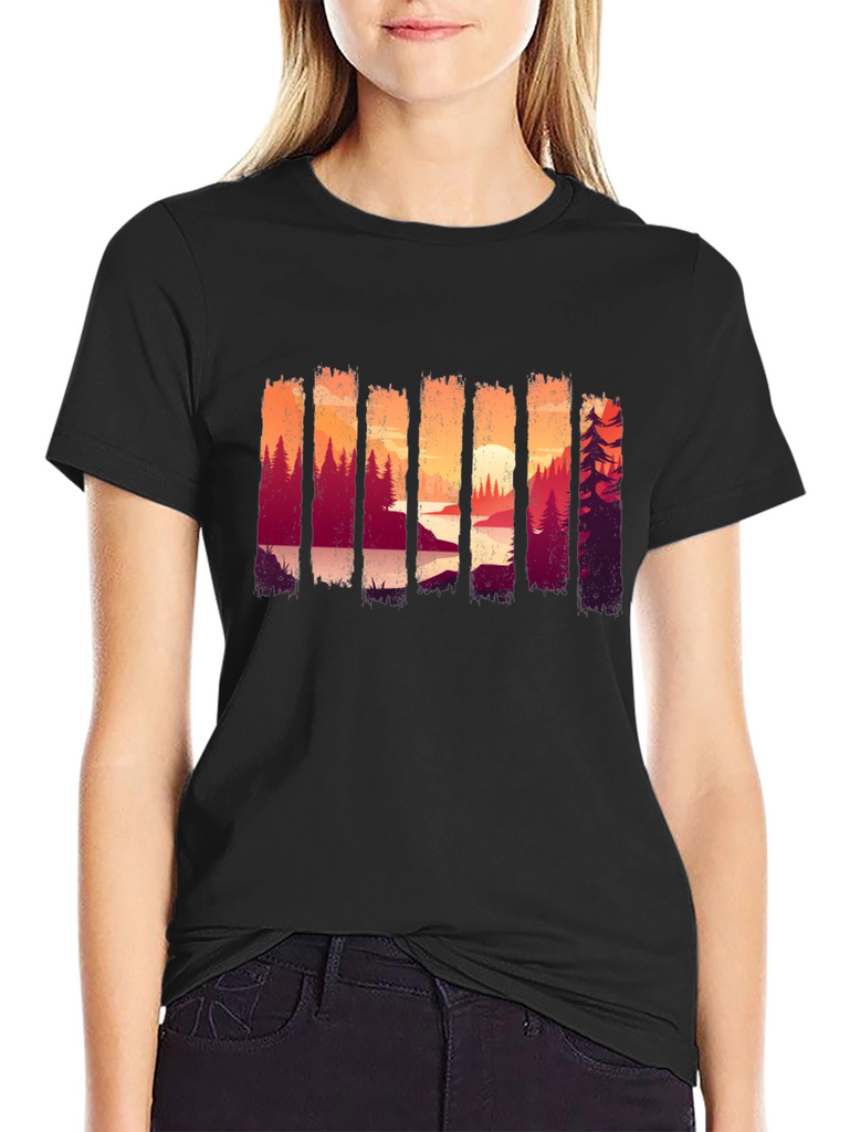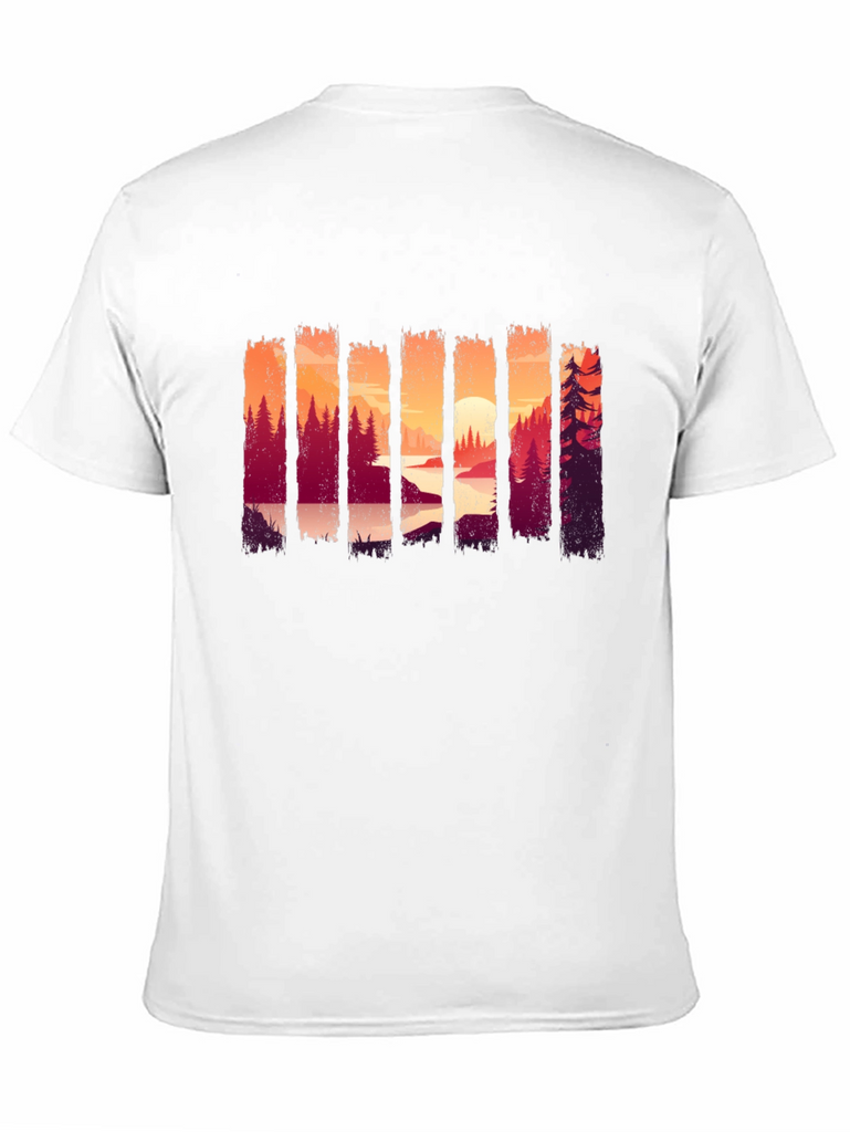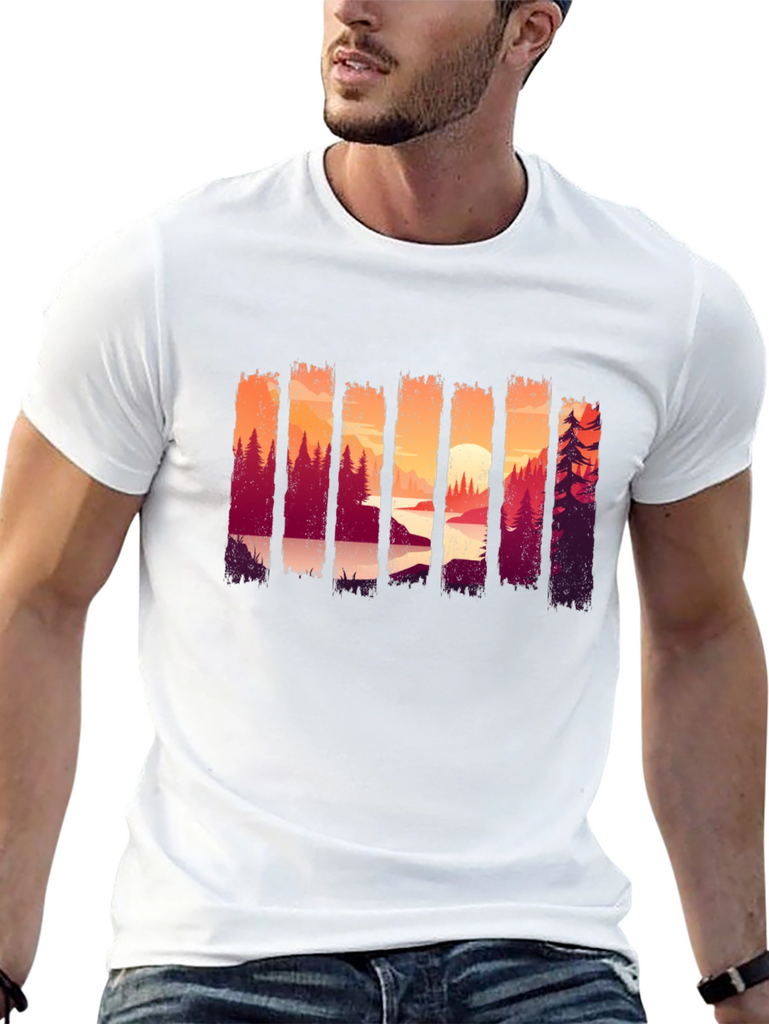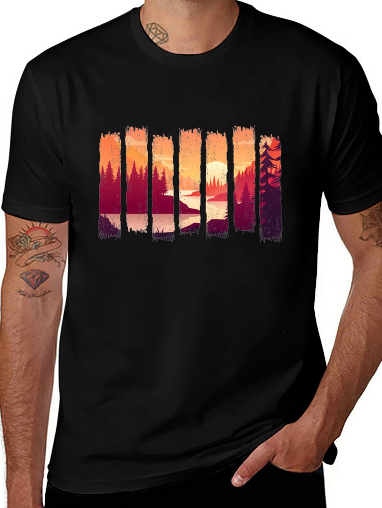 Showcase your love for the outdoors with this stylish black t-shirt. The shirt features a unique and eye-catching graphic design of a forest landscape at sunset, adding a touch of nature-inspired charm to your wardrobe. Made from comfortable and breathable fabric, this tee is perfect for everyday wear, casual outings, or weekend adventures. Its versatile design makes it easy to pair with jeans, shorts, or joggers for a relaxed and trendy look. The striking scenery print ensures you'll stand out in style, making it an ideal choice for nature enthusiasts.