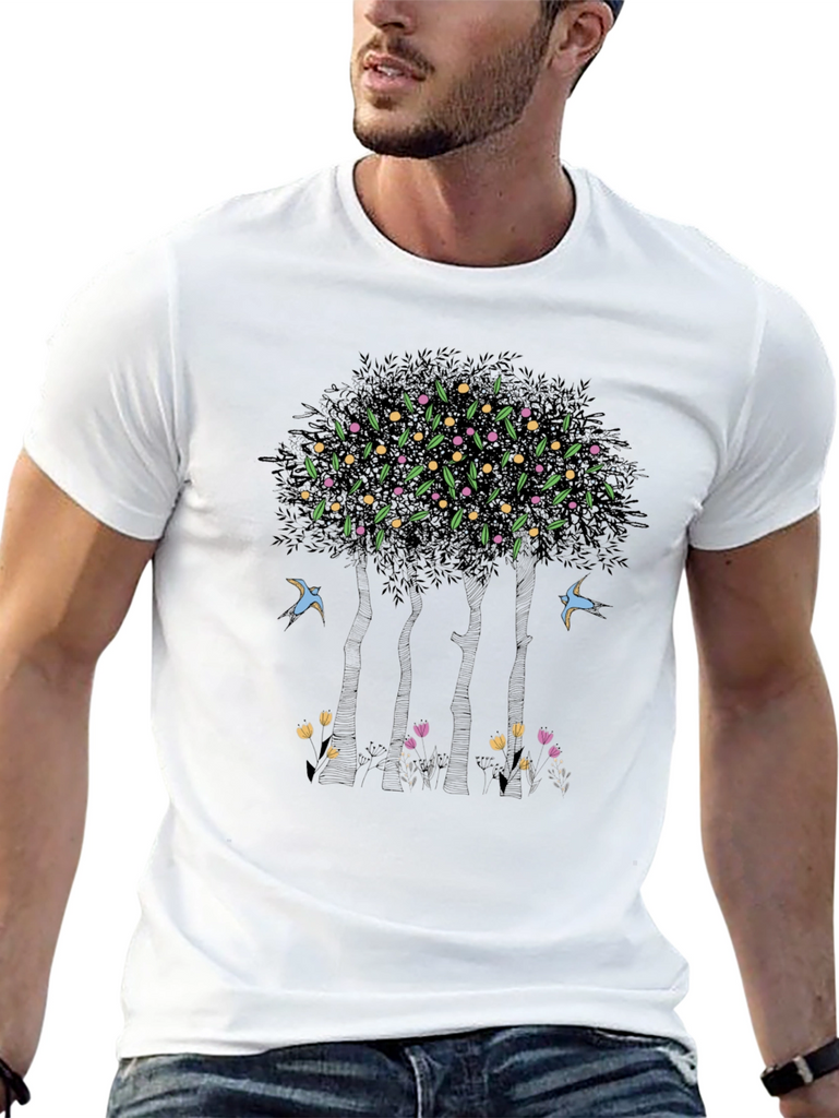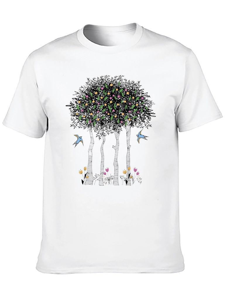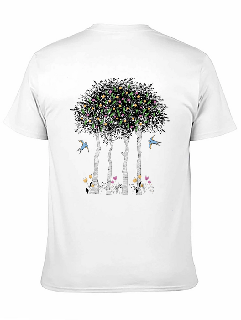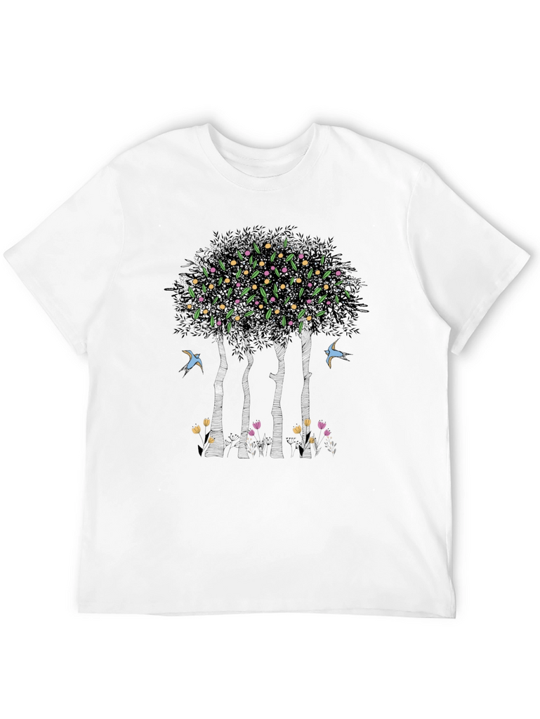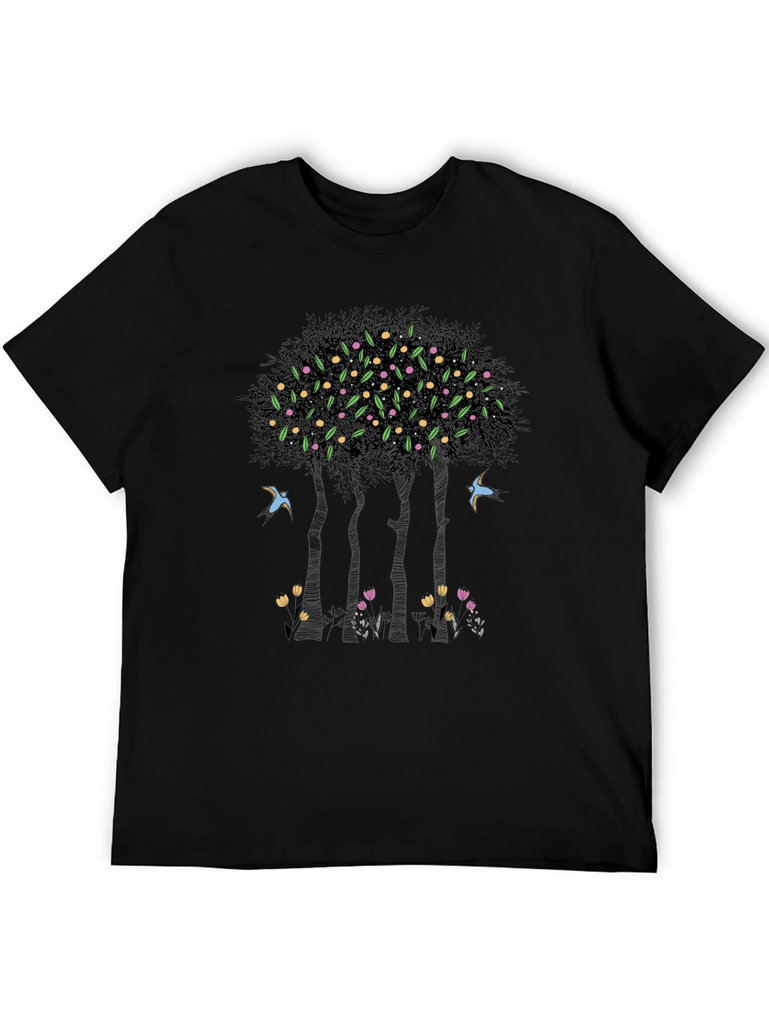 Embrace nature with this unique black graphic tee. The design features a vibrant array of flowers and leaves, accented with delicate pink and yellow berries. Two blue birds in flight add a touch of whimsy to the top of the design. Below, small floral clusters bring a touch of serenity to this stylish, comfortable tee. Perfect for casual wear or expressing your love for the outdoors, this shirt is a must-have for any wardrobe.