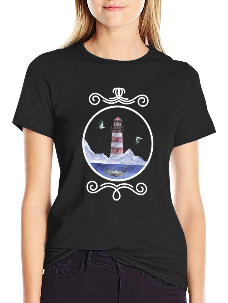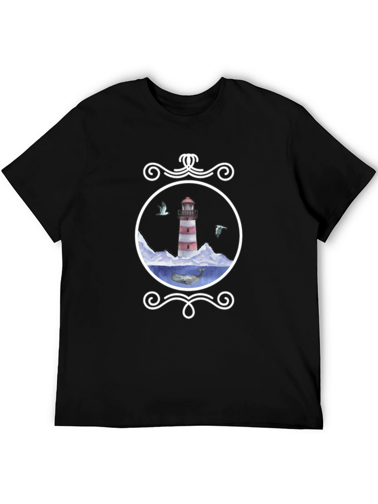 Embrace your love for the sea with this unique graphic t-shirt. Featuring a captivating design of a lighthouse, surrounded by ice, seagulls, and a whale in a decorative circle. This stylish black tee is perfect for everyday wear, showcasing your passion for nautical themes. Made from comfortable materials, it offers a relaxed fit, ideal for casual outings or cozy days at home. Add a touch of maritime charm to your wardrobe with this eye-catching and conversation-starting t-shirt. A great gift for ocean lovers!