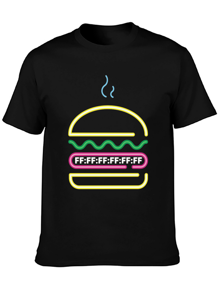 Show off your love for burgers with this stylish black t-shirt. Featuring a vibrant neon-style burger graphic, it's sure to make a statement. The design incorporates a yellow bun, green lettuce, and a pink center, all outlined with a glowing effect. Perfect for casual wear, parties, or foodie events, this unique tee adds a fun, quirky touch to any outfit. Made from comfortable, breathable fabric, it's an ideal addition to your wardrobe or a perfect gift for the burger enthusiast in your life. Grab yours now and wear your love for burgers!
