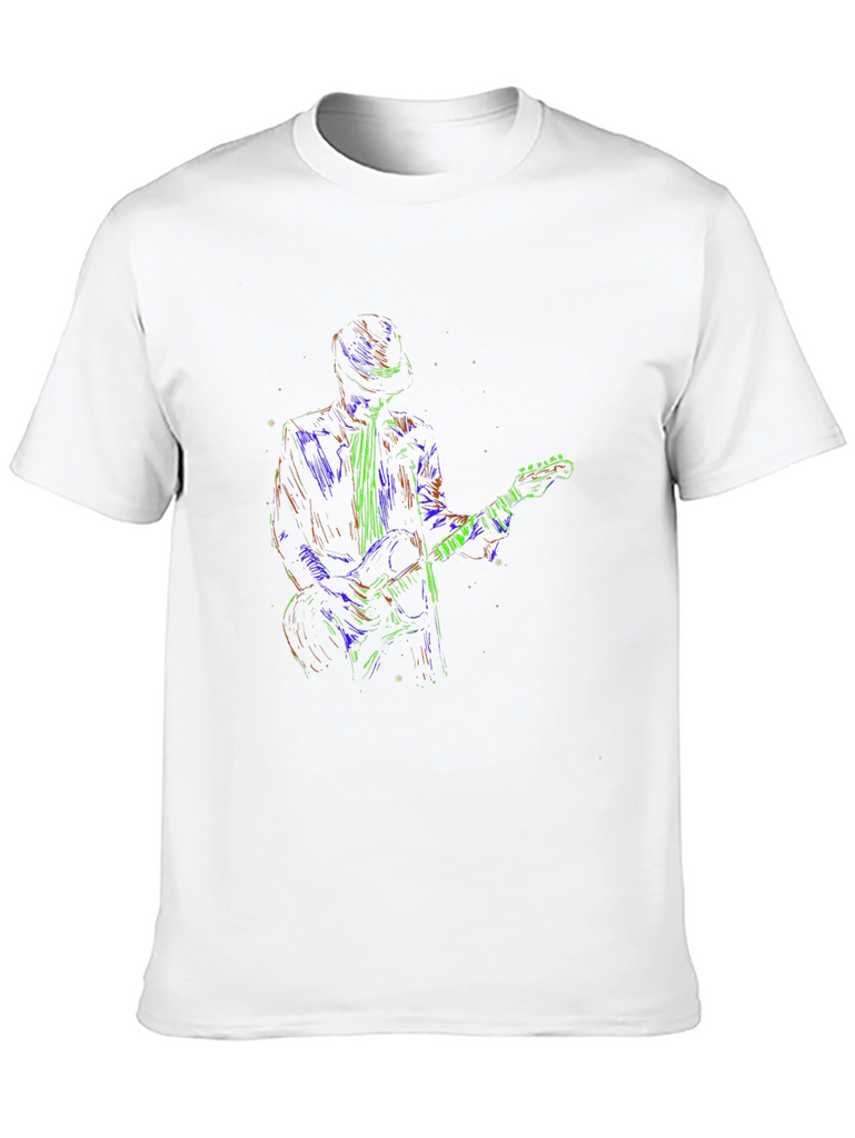 Rock your style with this unique black graphic tee! Featuring a vibrant, neon-style illustration of a guitar player, this shirt is sure to turn heads. The design pops with shades of green, blue and orange, creating a dynamic and eye-catching look. Made from a comfortable, breathable fabric, it's perfect for everyday wear or a night out. Show off your love for music and stand out from the crowd with this stylish and edgy t-shirt.