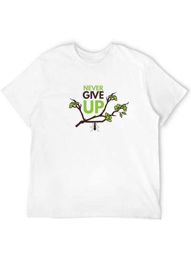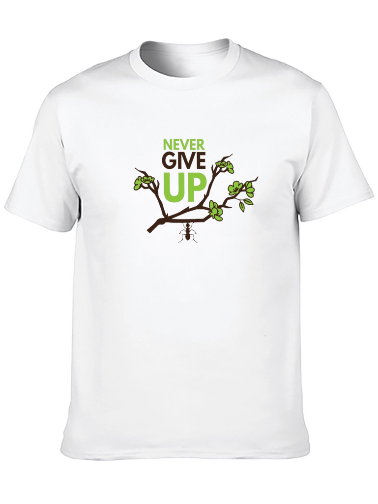 Showcase your resilience with this stylish black graphic tee. The shirt features the words "Never Give Up" above a blossoming branch. The design is eye-catching with its use of a light green and brown color scheme. Made from comfortable, breathable fabric, this tee is perfect for everyday wear, gym workouts, or casual outings. Its unique design makes a statement while providing optimal comfort. Wear this shirt as a daily reminder to stay strong and overcome any challenges that come your way. It’s a versatile piece that easily pairs with jeans, shorts, or joggers.