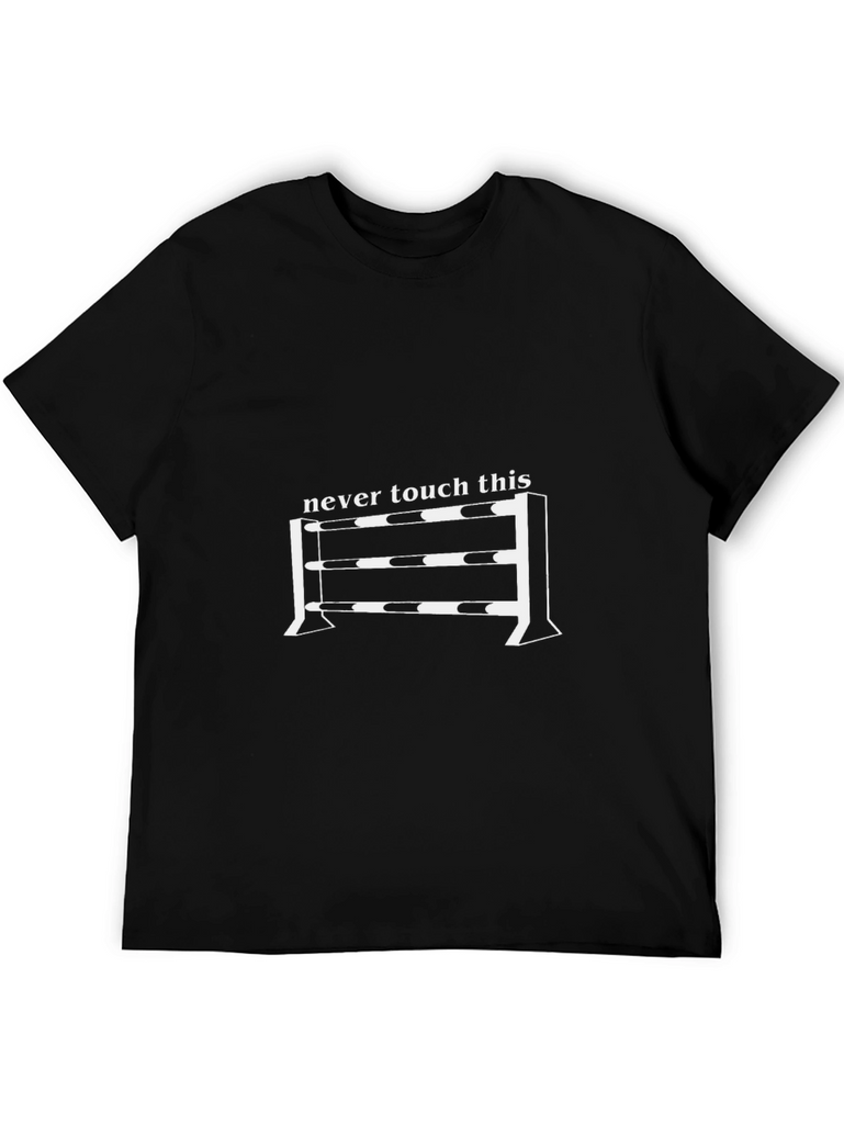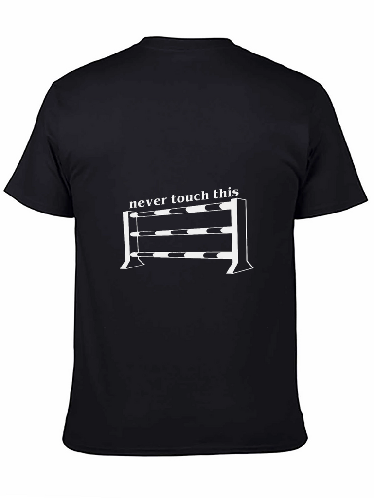 Show off your equestrian spirit with this bold, black t-shirt featuring a white graphic of a horse jump. Above the jump, the phrase 'never touch this' adds a playful touch. Made from comfortable material, this tee is perfect for everyday wear, trips to the stables, or casual outings. Its unique design makes it a great conversation starter and a must-have for any horse lover's wardrobe. The dark color ensures versatility and easy pairing with jeans, shorts, or riding pants. A stylish way to express your passion for horses!