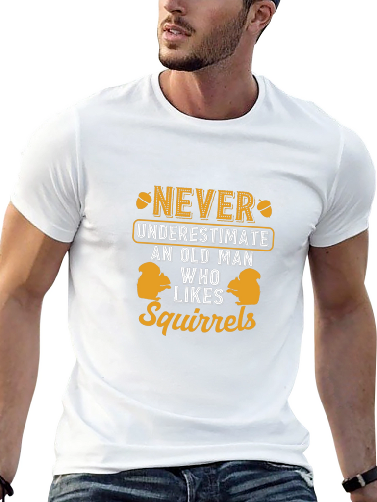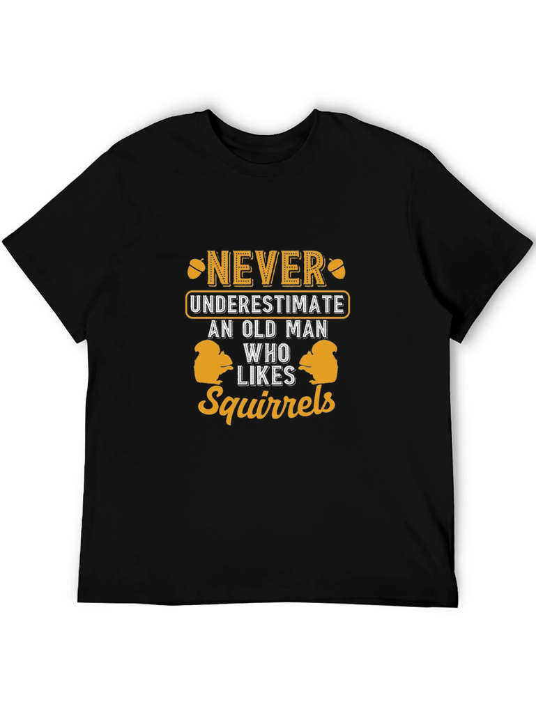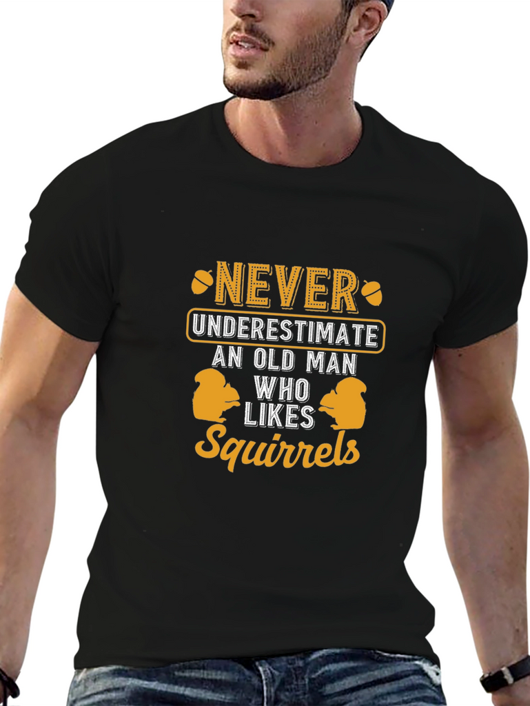 Showcase your love for squirrels with this eye-catching black t-shirt. The design features the playful phrase "Never Underestimate An Old Man Who Likes Squirrels" in a stylish yellow font. Two adorable squirrel illustrations add a touch of whimsy to the design. Made from a comfortable and durable fabric, this t-shirt is perfect for casual wear, outdoor adventures, or as a fun gift for the squirrel enthusiast in your life. Express your unique personality with this attention-grabbing piece. Get yours today and let the world know about your passion for squirrels!