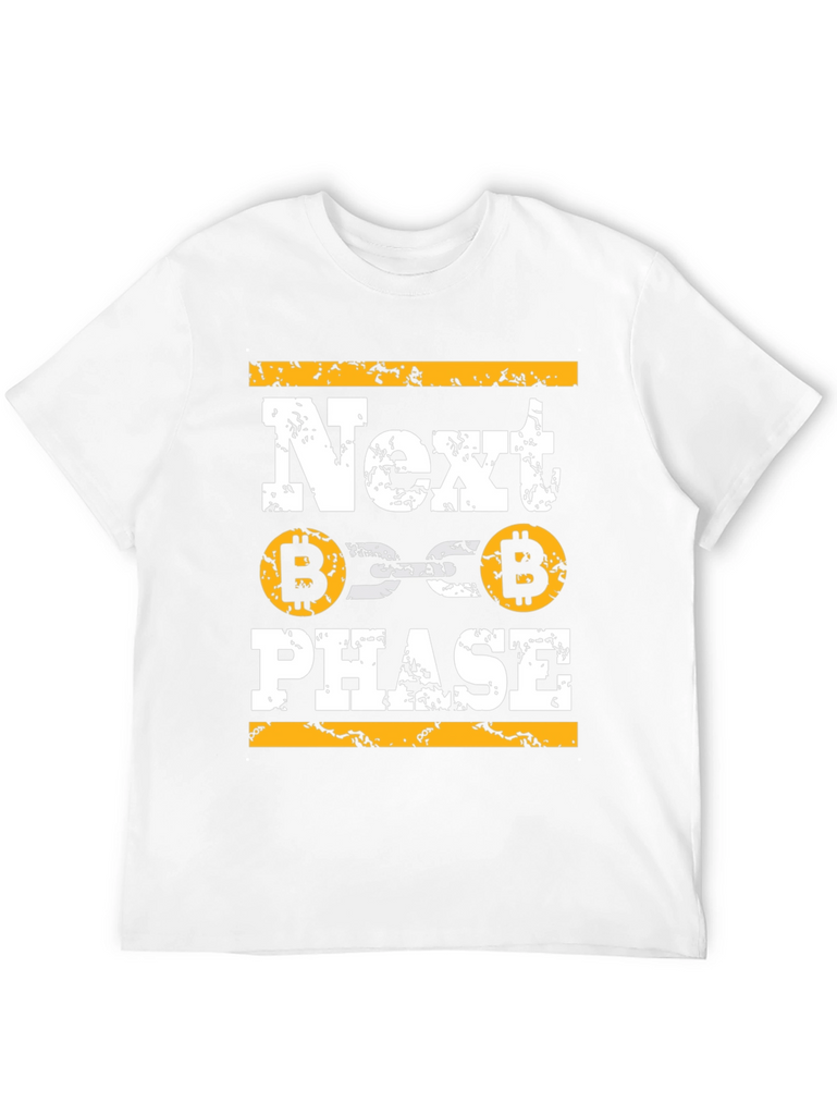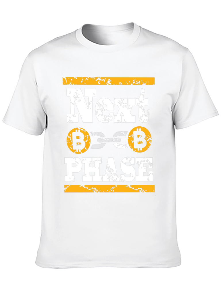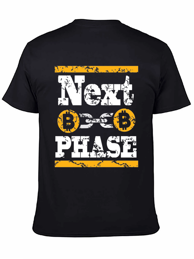 Show your support for crypto with this stylish black graphic t-shirt. This tee features the phrase "Next Phase" printed in bold, distressed white lettering, with two Bitcoin symbols incorporated into the design. Yellow textured lines provide an accent to the top and bottom of the text. Made from comfortable, breathable material, it is perfect for everyday wear, crypto meetups, or casual outings. This Bitcoin themed tee is an eye-catching way to express your interest in cryptocurrency and digital finance. A must-have for Bitcoin enthusiasts!