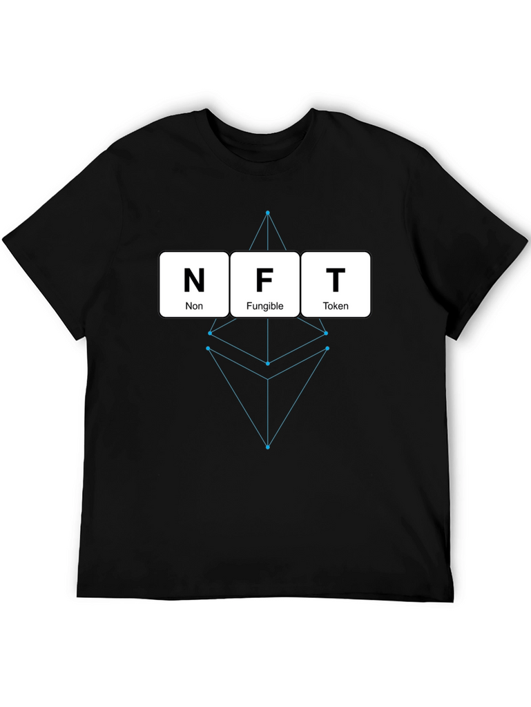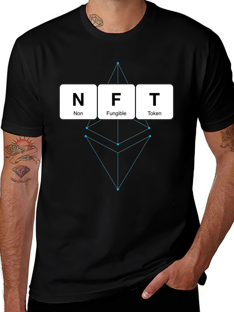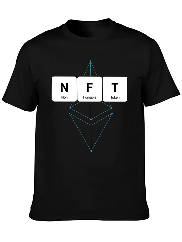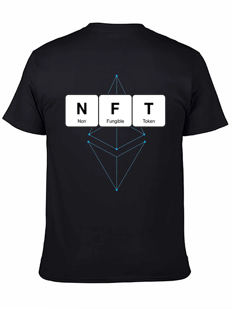 Show your love for the crypto world with this stylish black t-shirt. This shirt features a bold "NFT" design with "Non", "Fungible", and "Token" displayed on white squares, connected to a crypto logo. The comfortable fit makes it perfect for casual wear, tech meetups, or showcasing your enthusiasm for blockchain technology. Grab yours and show off your passion for NFTs!