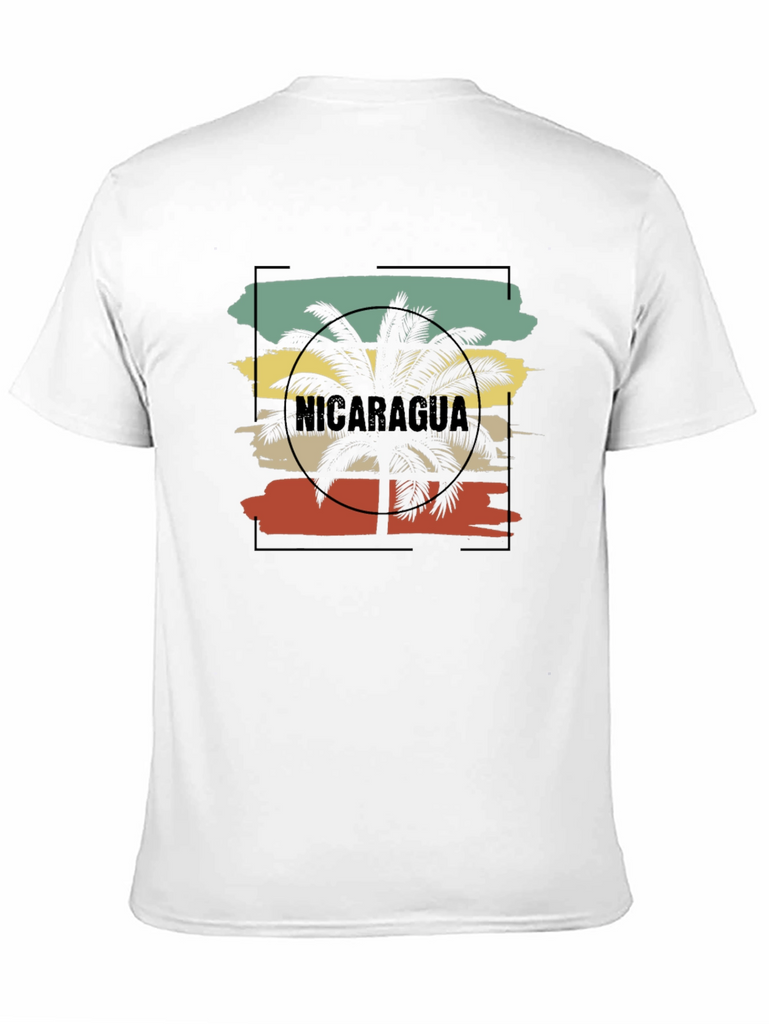Embrace tropical vibes with this unique Nicaragua palm tree graphic tee. The design features a vintage-inspired, distressed-style palm tree silhouette set against a backdrop of horizontal stripes in calming turquoise, yellow, and coral tones. The word "Nicaragua" is integrated into the design. This eye-catching print is framed by a subtle black border, adding a touch of modern flair to the classic crew neck style. Made from a comfortable black fabric, this tee is perfect for casual outings, beach days, or simply showcasing your love for Nicaragua. A great conversation starter and wardrobe staple for anyone seeking a touch of wanderlust in their everyday style.