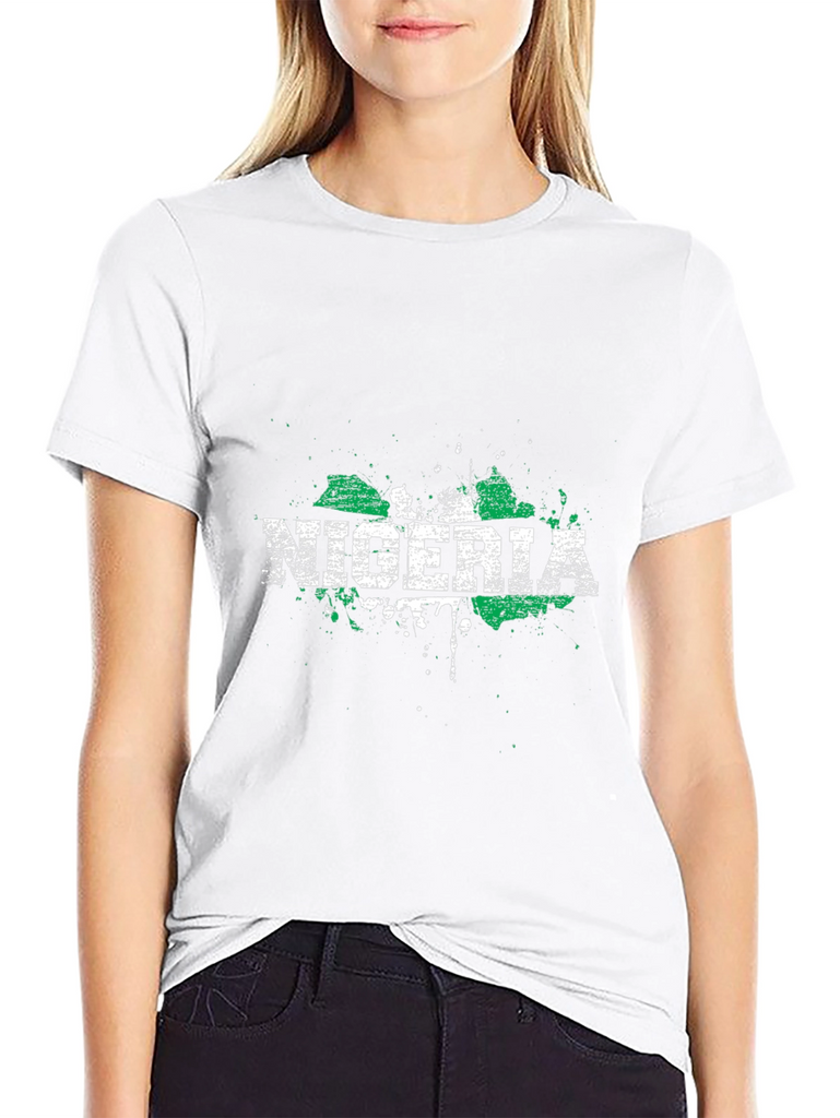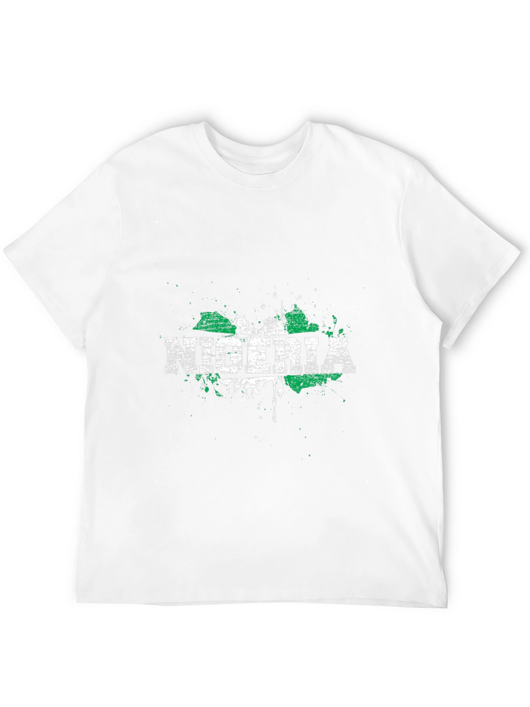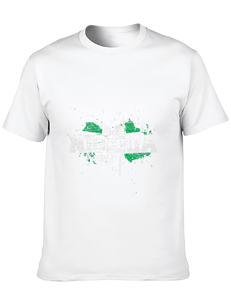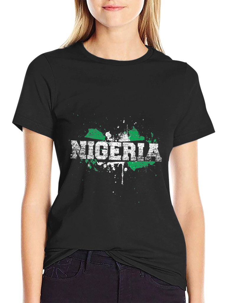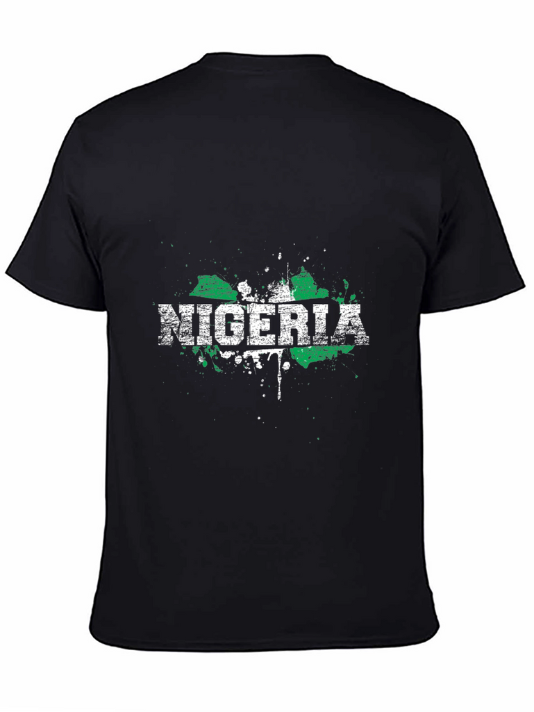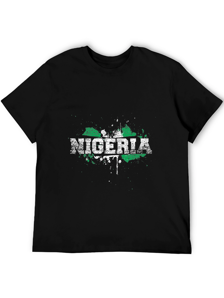 Show your Nigerian pride with this stylish black t-shirt. The front features a bold "NIGERIA" text graphic with distressed green and white infill, mimicking the colors of the Nigerian flag. The design has a cool, splatter effect for a modern, edgy look. Made from a comfortable fabric, this short-sleeve tee is perfect for casual wear. Whether you're cheering on your team, celebrating Nigerian culture, or just want to make a statement, this shirt is a great choice. A unique addition to any wardrobe.