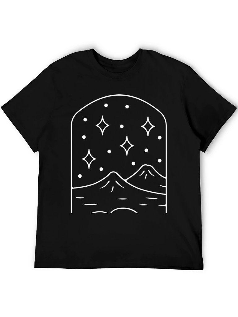 This sleek black t-shirt features a minimalist graphic design that captures a serene night landscape. The design showcases stylized mountains under a starry sky within an arched frame, all rendered in crisp white lines. Made from a soft and comfortable-looking fabric, this tee offers a relaxed fit perfect for everyday wear. Its simple yet eye-catching design makes it ideal for casual outings, relaxed evenings, or as a unique addition to your streetwear collection. Pair it with jeans, shorts, or joggers for an effortlessly stylish look. This tee is a great choice for those who appreciate nature-inspired designs and understated aesthetics.