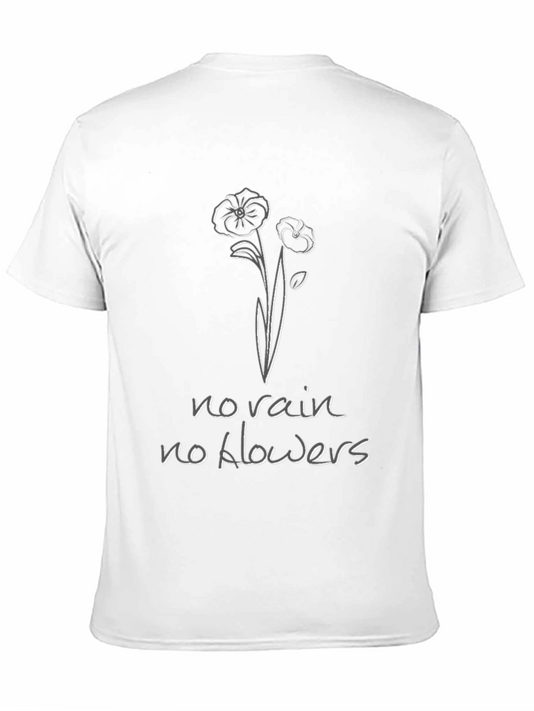 This classic fit black t-shirt features a stylish and meaningful design. The front showcases a minimalist drawing of two flowers accompanied by the phrase "no rain no flowers", creating a visually appealing and inspirational message. Made from what appears to be comfortable cotton material, this tee offers both style and comfort. Ideal for casual wear, it's a great way to express your personal style and resilience. Wear it for everyday outings, workouts, or simply lounging around.