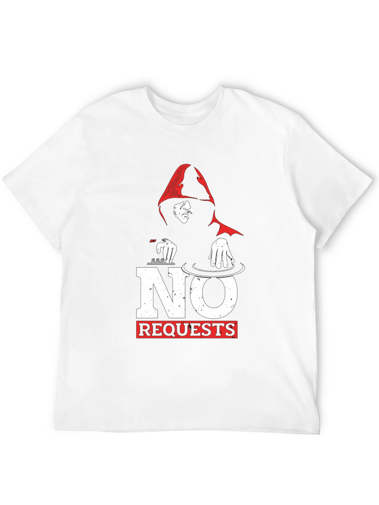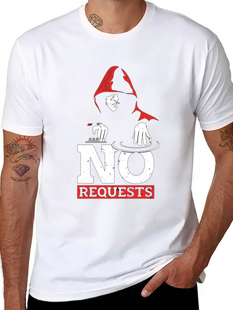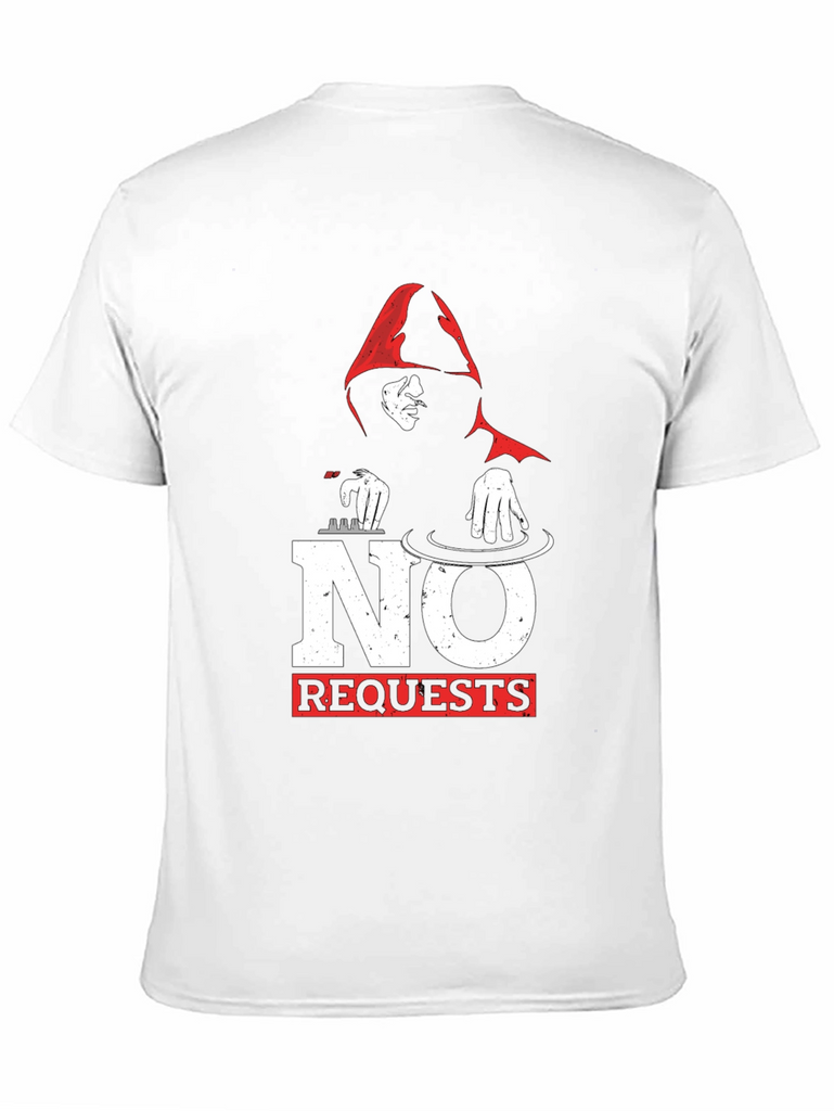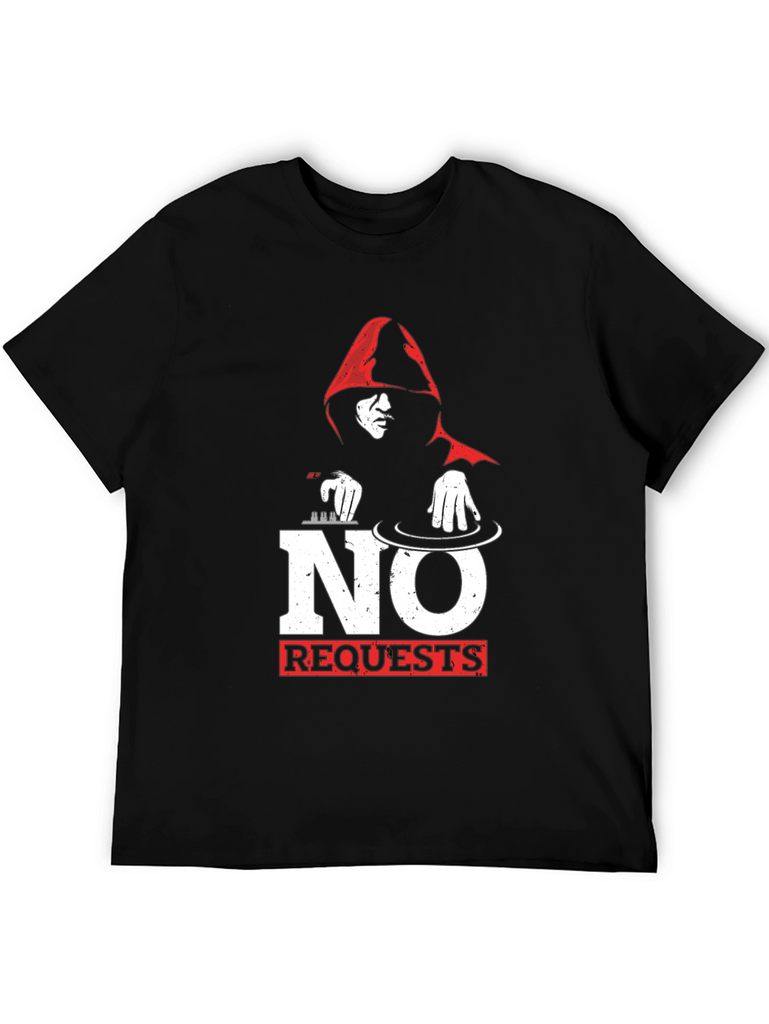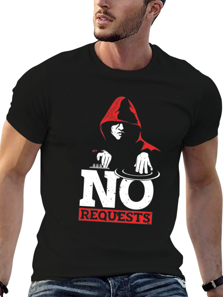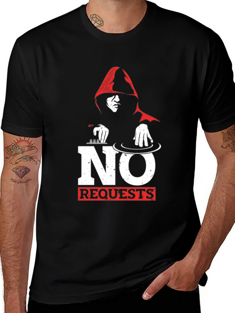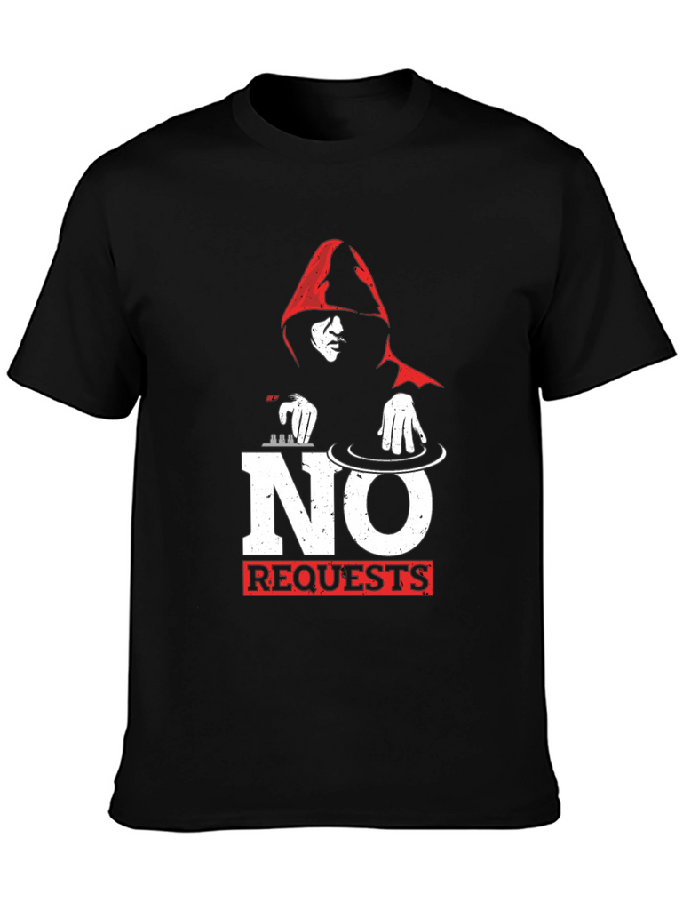 Rock the party with this edgy black graphic tee! The bold design features a hooded DJ silhouette and the words "NO REQUESTS" in a stylized font. Perfect for DJs, music lovers, and anyone with a strong sense of humor. Made from comfortable fabric, this tee is ideal for casual wear, concerts, or hitting the club. Show off your unique style and let everyone know you're in charge of the music! Get yours today and make a statement!
