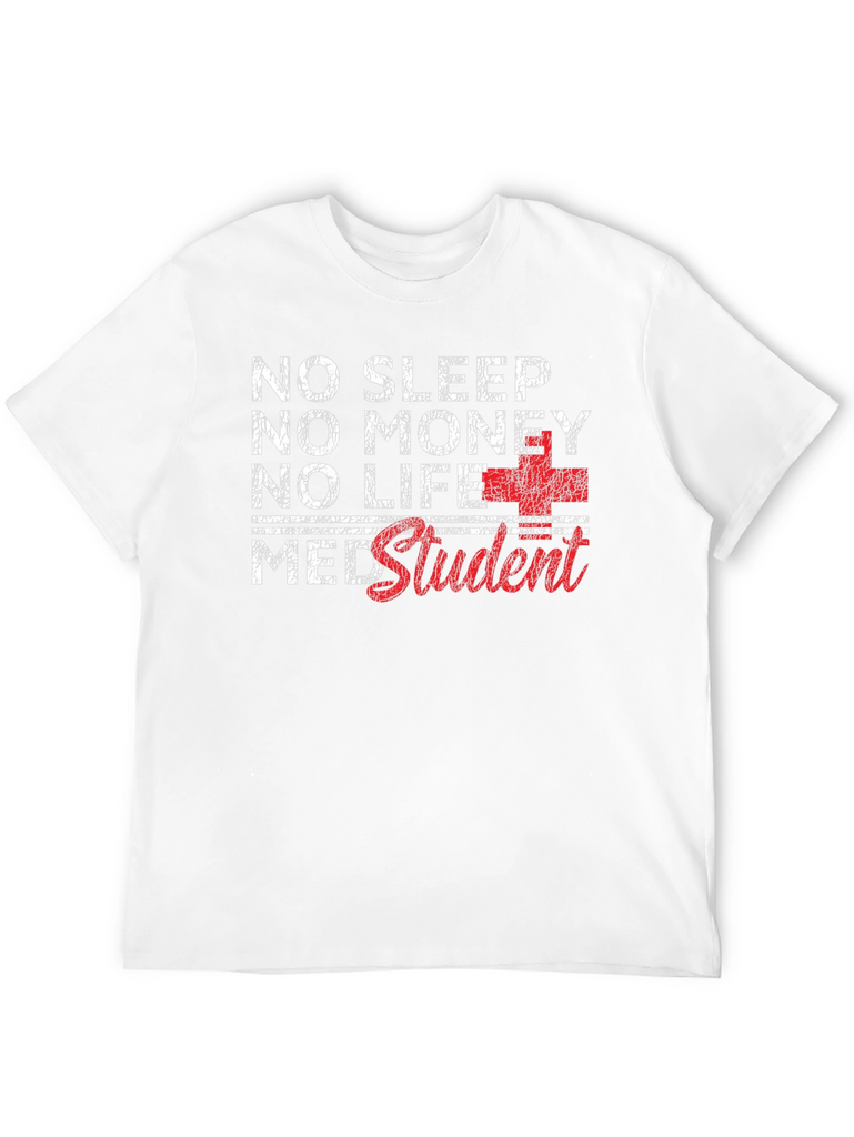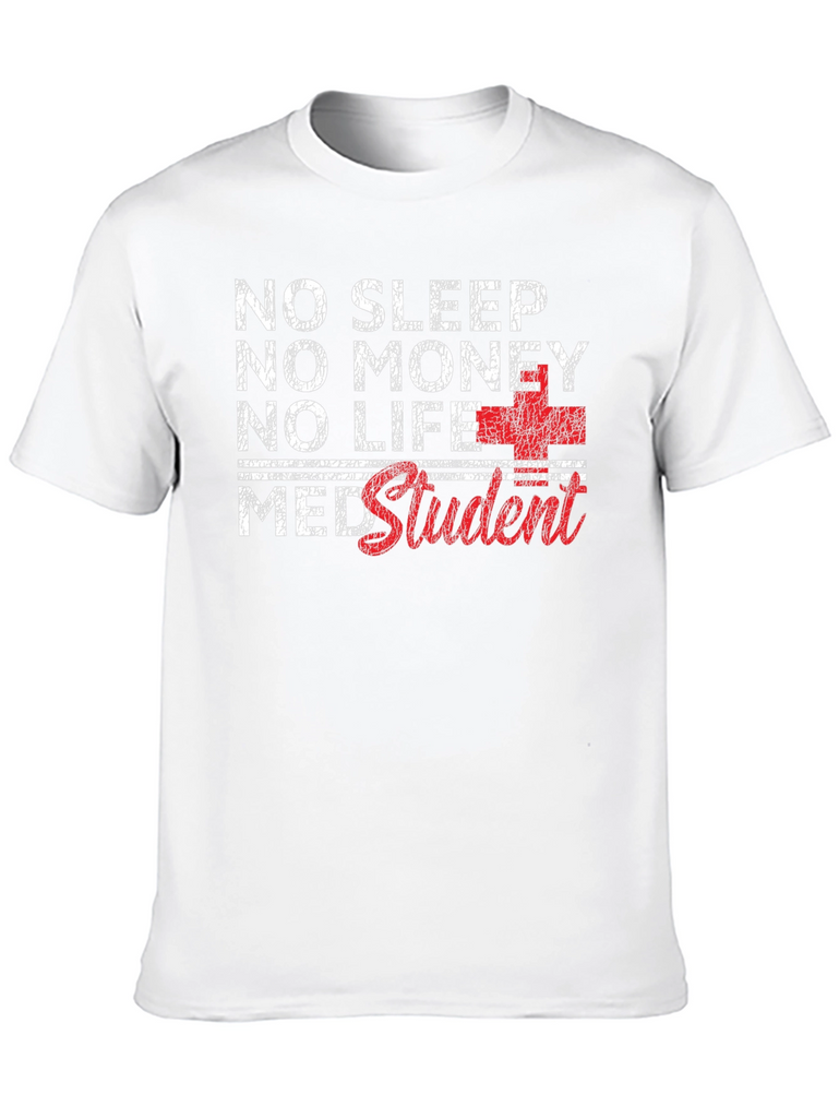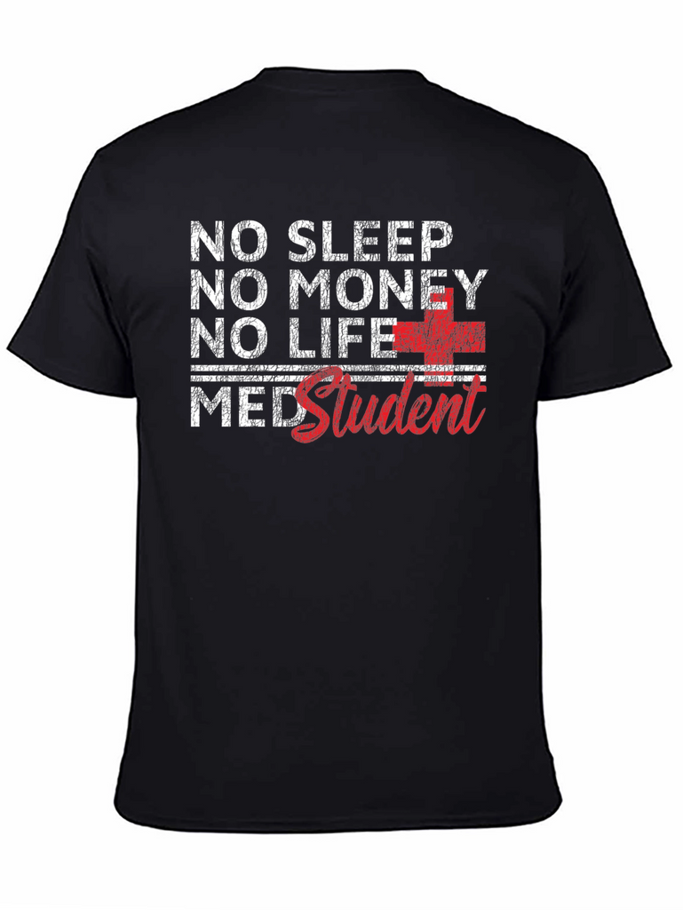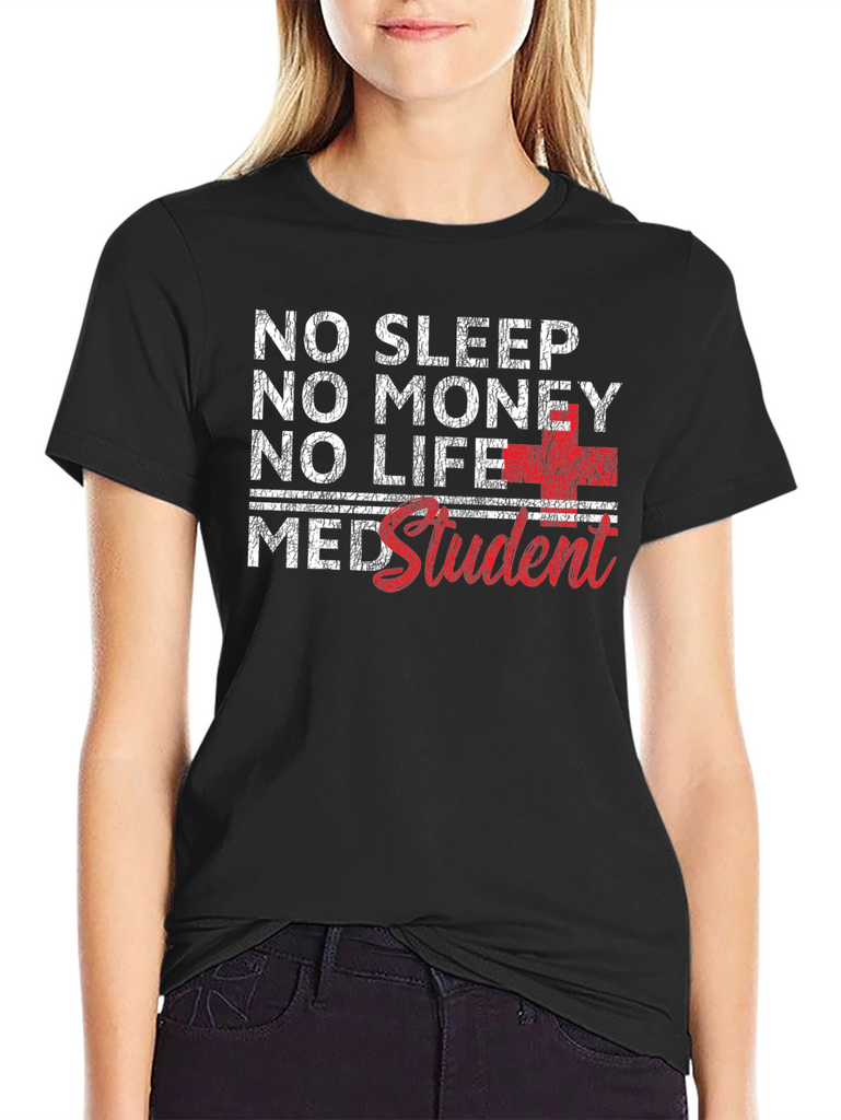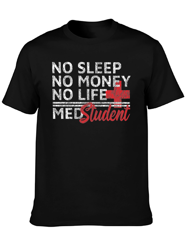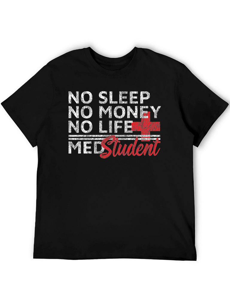 This stylish black t-shirt makes a statement. Featuring the witty phrase "No Sleep No Money No Life Med Student" in distressed white and red lettering, it's perfect for hardworking medical students who can relate. A red medical cross cleverly replaces the 'T' in 'Life'. The design is printed on a soft, comfortable fabric. This tee is ideal for casual wear, study sessions, or as a humorous gift for the med student in your life. Show off your dedication (and lack of sleep!) with this unique and eye-catching shirt.