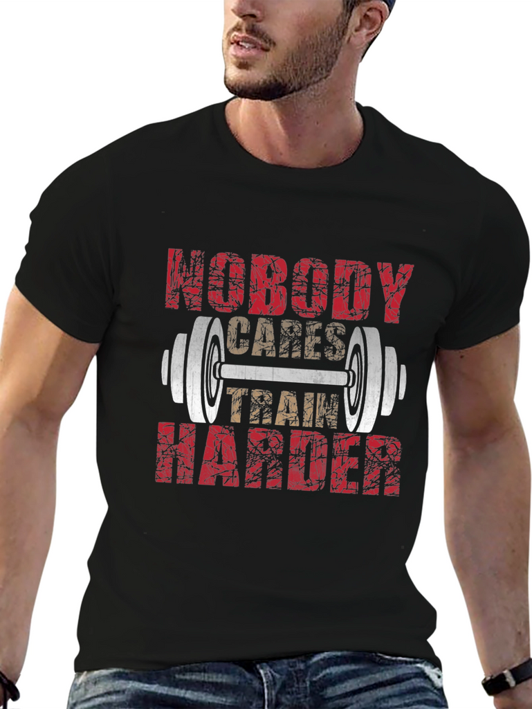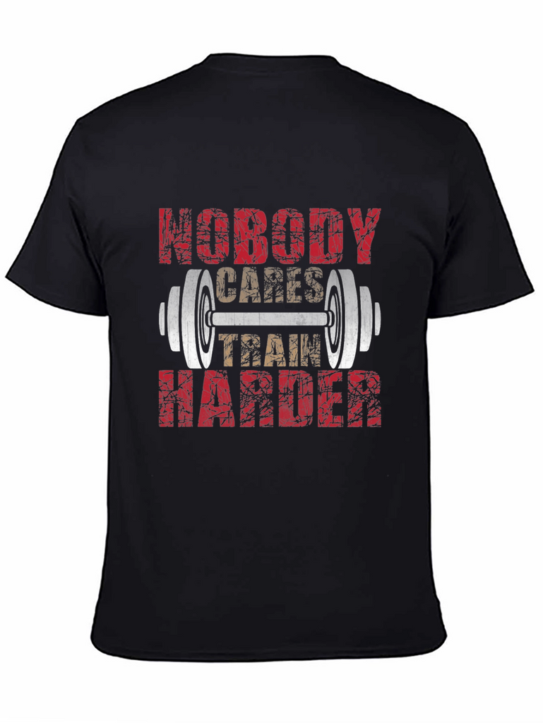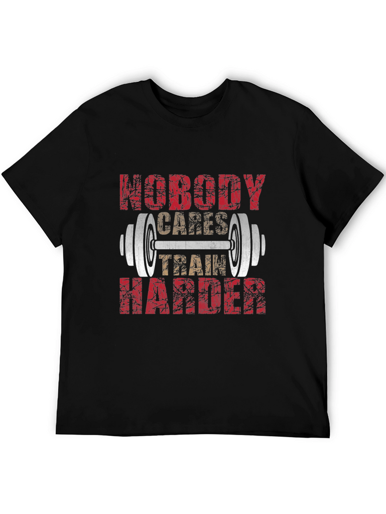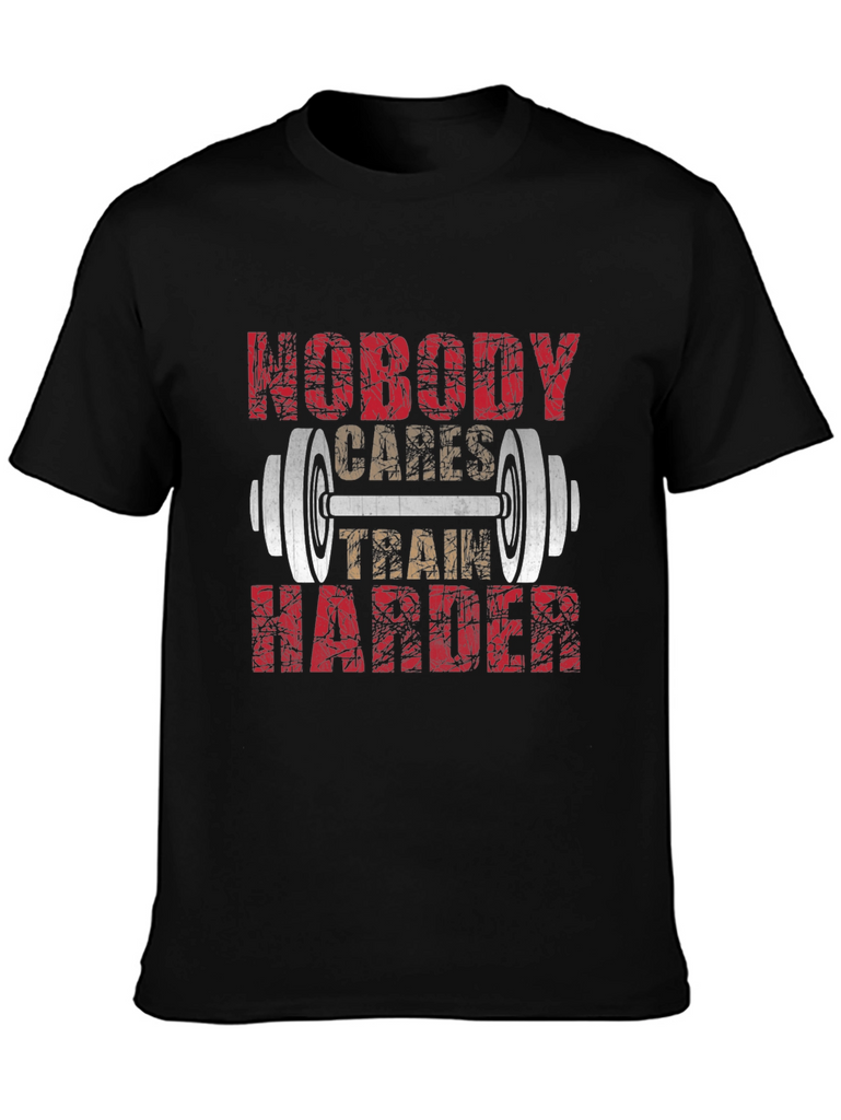 Show your dedication to fitness with this motivational "Nobody Cares Train Harder" t-shirt. This black tee features a bold graphic print of a barbell with the phrase "Nobody Cares Train Harder" in a distressed, eye-catching font. The graphic has red and brown elements, adding depth and character. Perfect for the gym, workouts, or casual wear, this shirt is a great way to inspire yourself and others to push harder. Made from comfortable fabric, it's designed for both style and performance. This tee makes a great gift for the fitness enthusiast in your life.