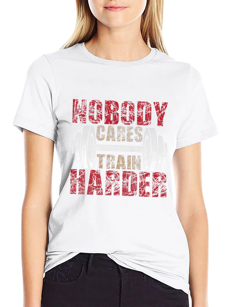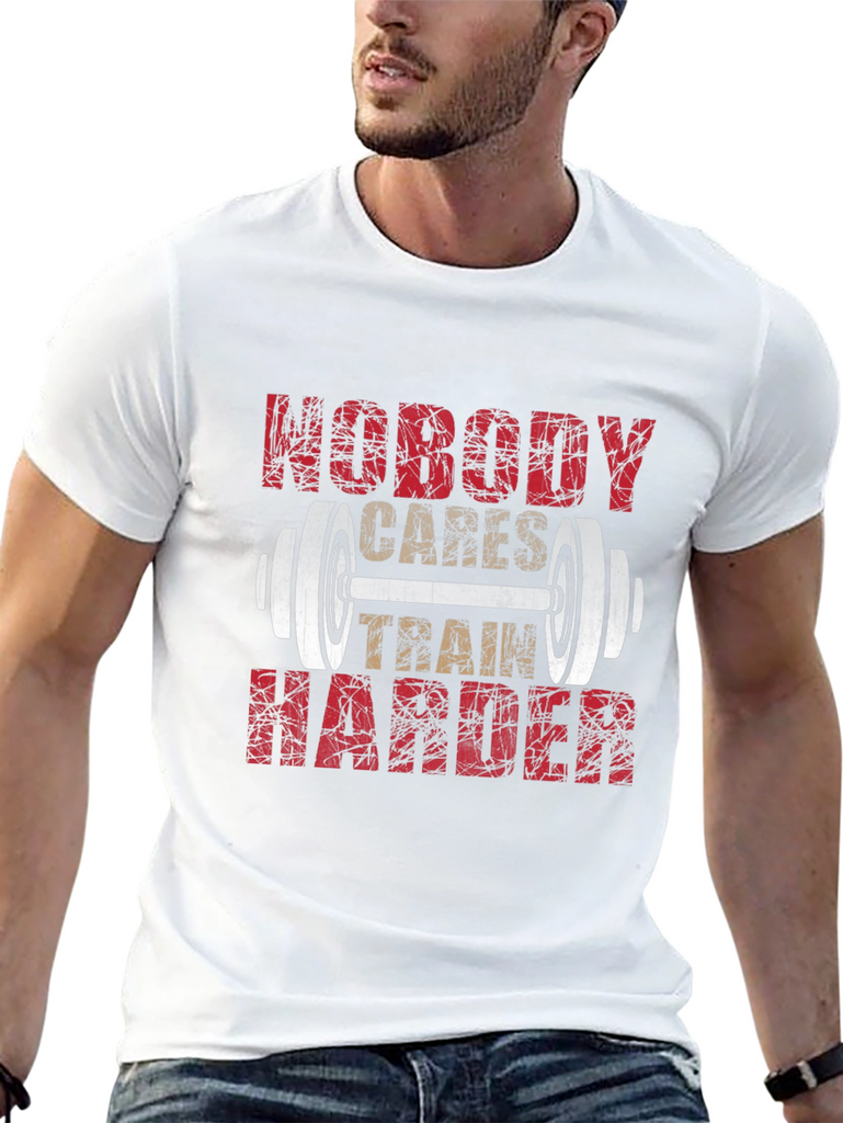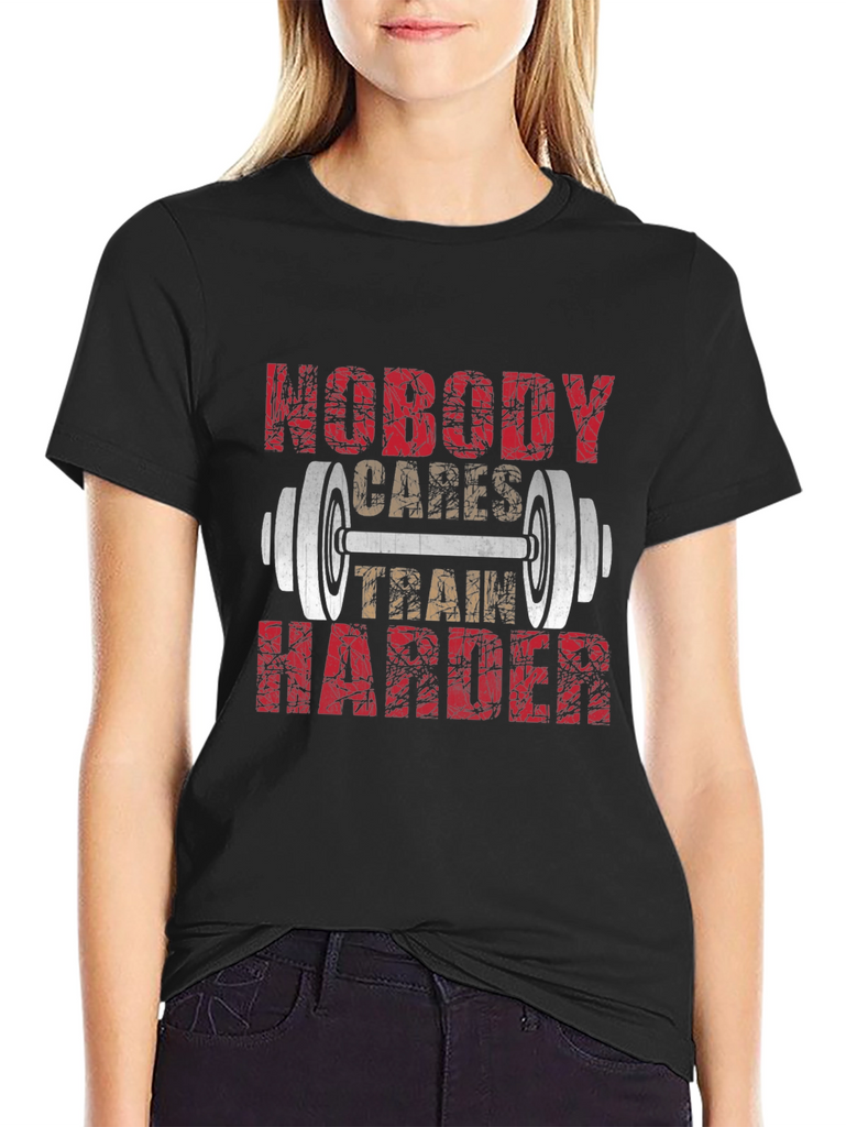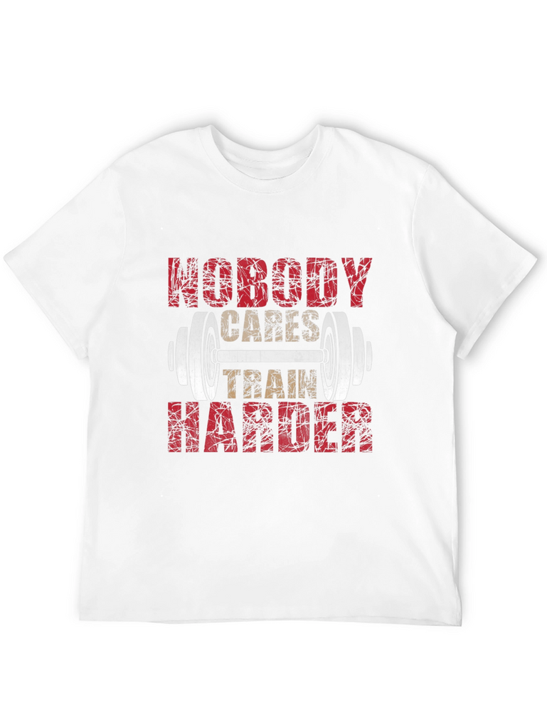 Show your dedication to fitness with this motivational "Nobody Cares Train Harder" t-shirt. This black tee features a bold graphic print of a barbell with the phrase "Nobody Cares Train Harder" in a distressed, eye-catching font. The graphic has red and brown elements, adding depth and character. Perfect for the gym, workouts, or casual wear, this shirt is a great way to inspire yourself and others to push harder. Made from comfortable fabric, it's designed for both style and performance. This tee makes a great gift for the fitness enthusiast in your life.