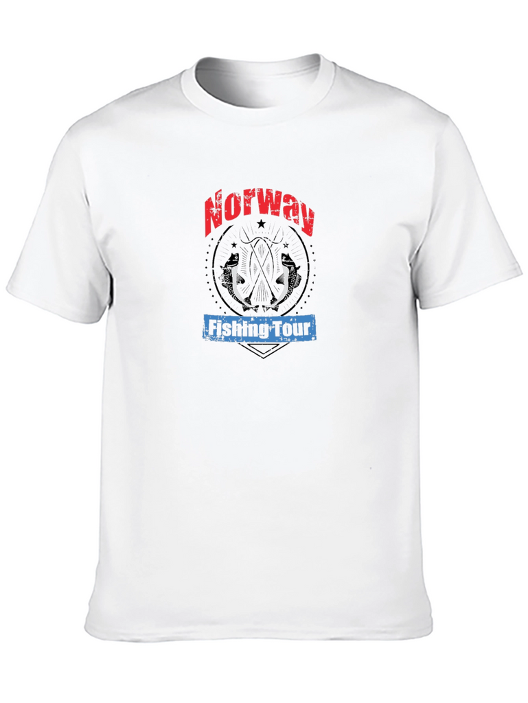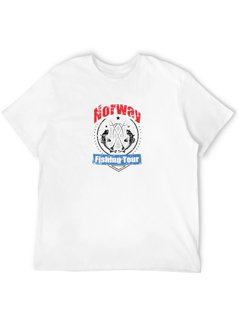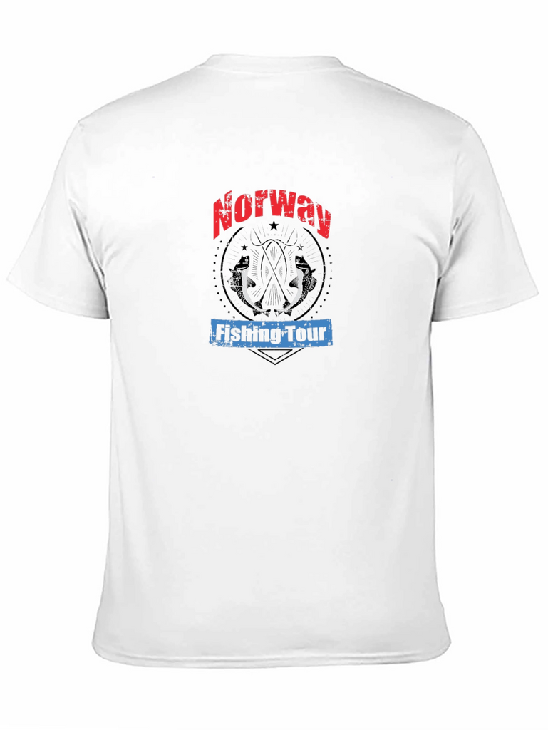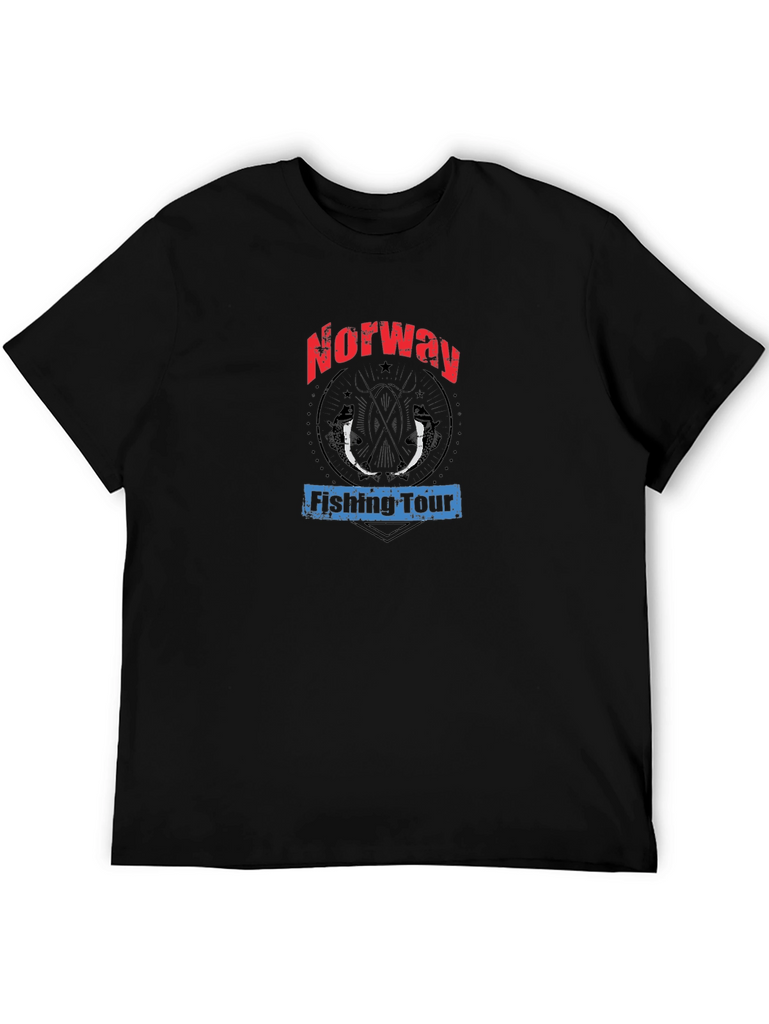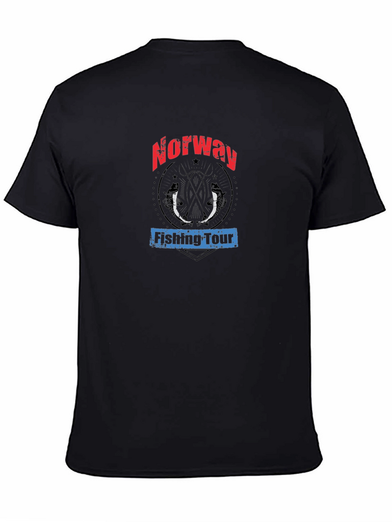 Show off your love for angling in Norway with this unique graphic tee! The black t-shirt features a bold design with "Norway" emblazoned in red lettering above a rustic circle containing two fish silhouettes. Below, "Fishing Tour" is printed in blue. Made from a comfortable fabric, this casual shirt is perfect for everyday wear, fishing trips, or as a souvenir for your Norwegian adventure. This tee combines style and comfort for any fishing enthusiast. Grab yours now and represent your passion!