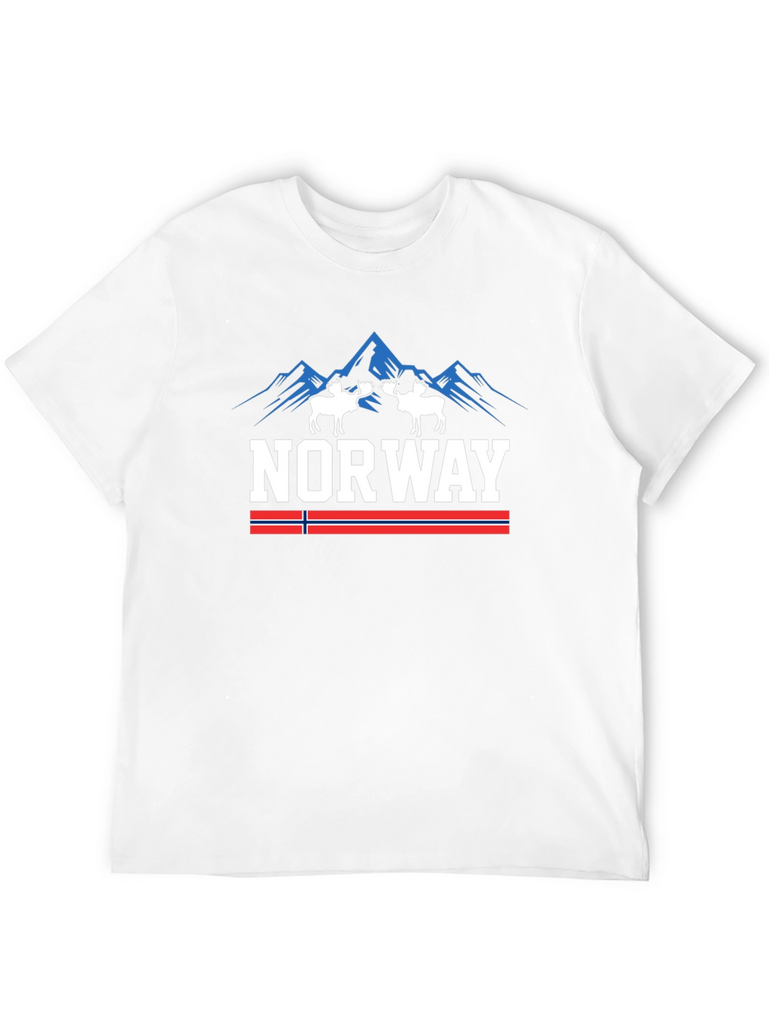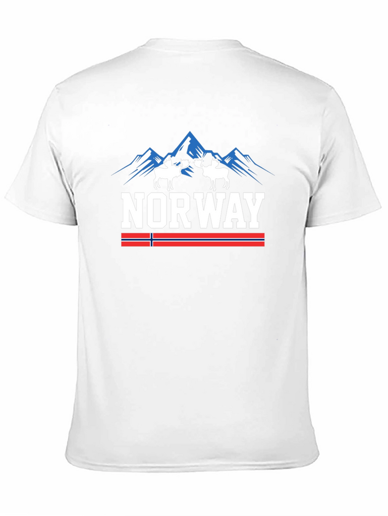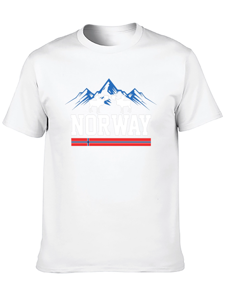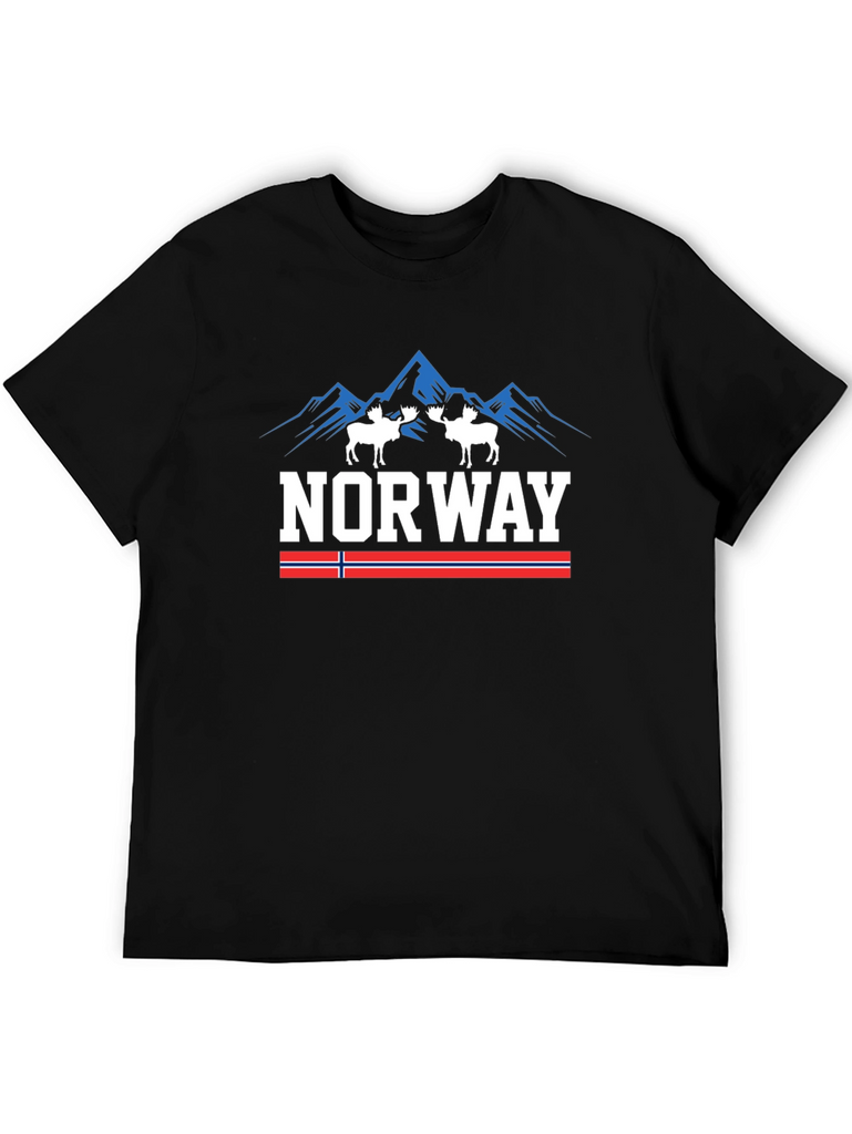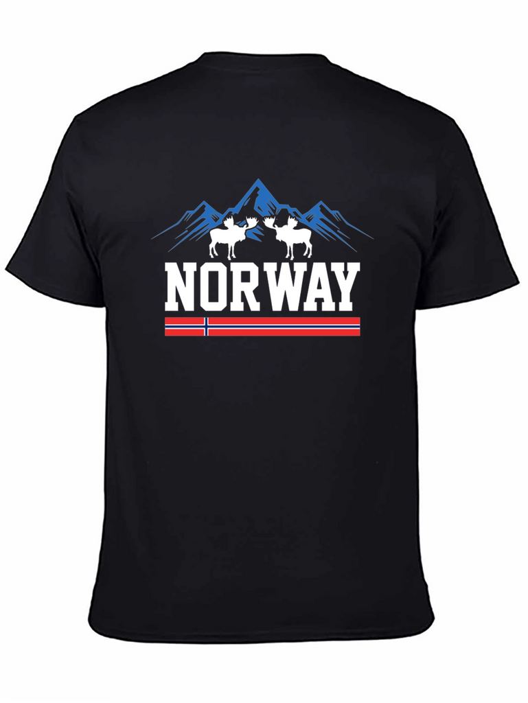 Showcase your love for Norway with this stylish black t-shirt. The shirt features a striking graphic print including moose silhouettes, mountain peaks and the word "Norway" above the Norwegian flag. Made from comfortable, breathable fabric, this tee is perfect for everyday wear. Wear this shirt to celebrate your heritage, travel, or simply show your appreciation for the country's natural beauty. This tee is a great conversation starter and a unique addition to any wardrobe. Order yours today and represent Norway in style!