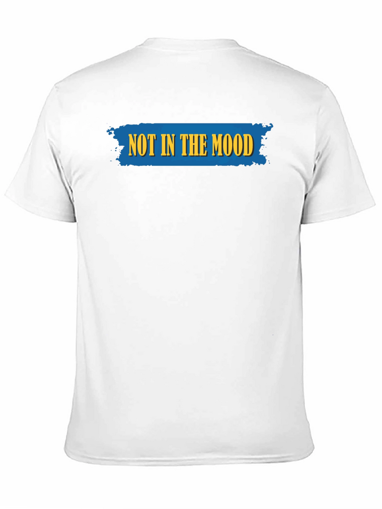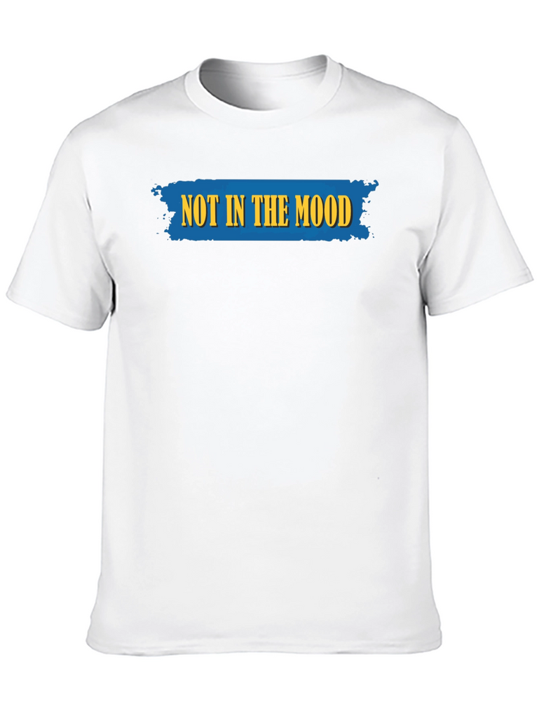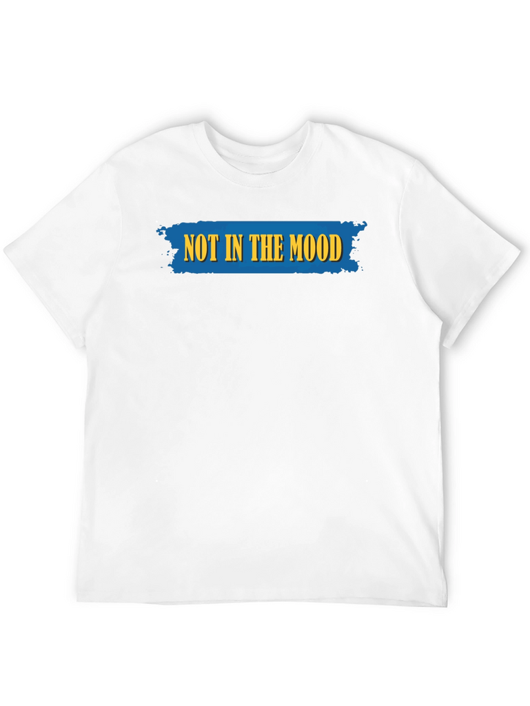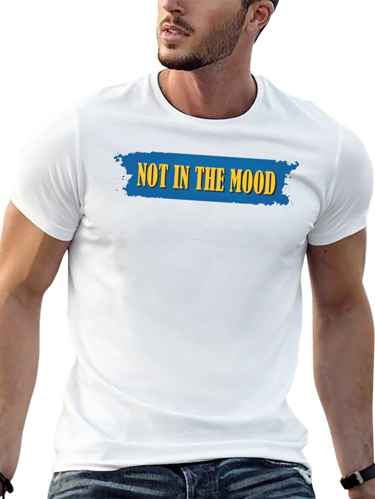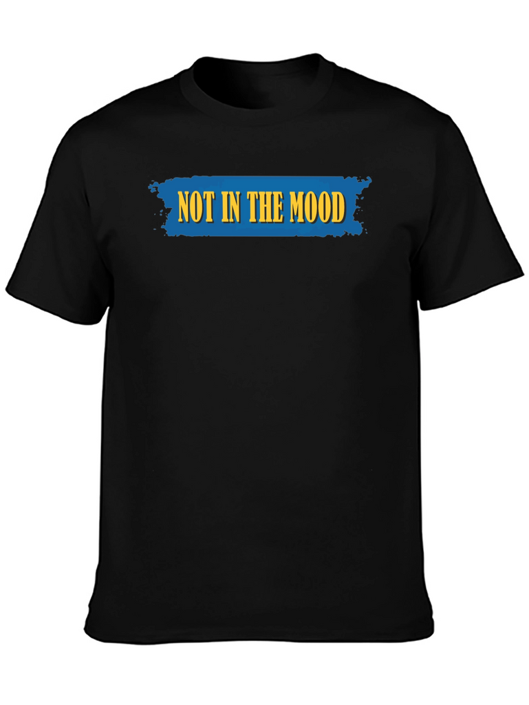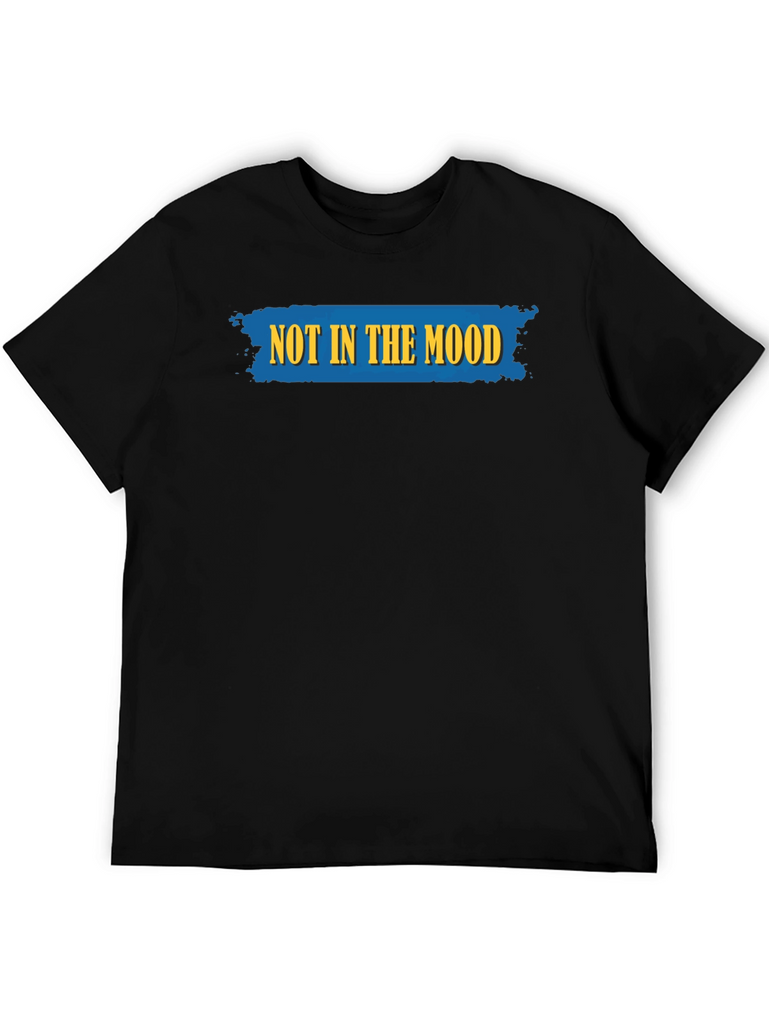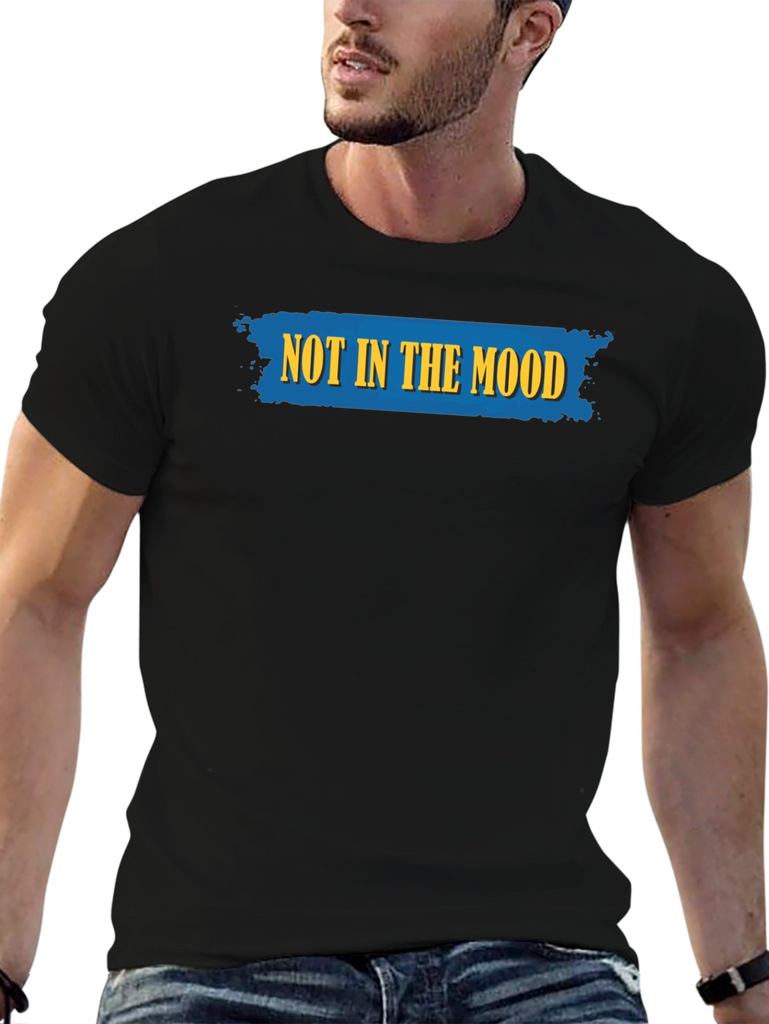 This classic black t-shirt features a bold and humorous statement: "NOT IN THE MOOD" emblazoned across the chest in striking yellow lettering on a textured blue backdrop. The design adds a touch of lightheartedness to any casual outfit. Made from what appears to be a soft and breathable cotton blend, this tee offers both comfort and style. The short sleeves and crew neck make it a versatile choice for everyday wear. Pair it with jeans or shorts for a relaxed, yet expressive look. Ideal for days when you want to make a statement without saying a word. It is perfect for lounging at home or running errands around town.