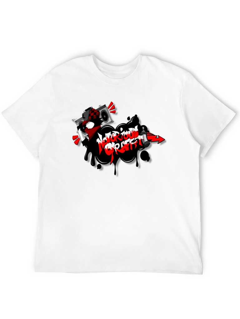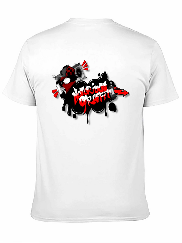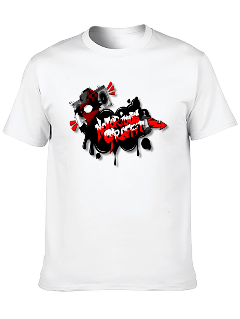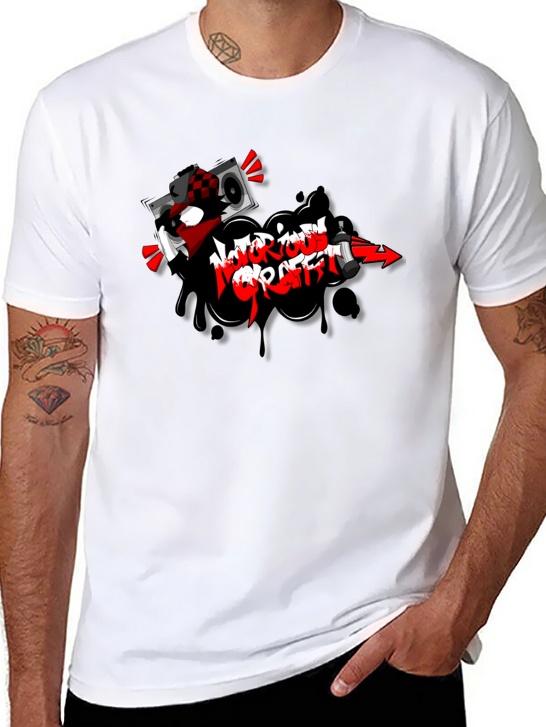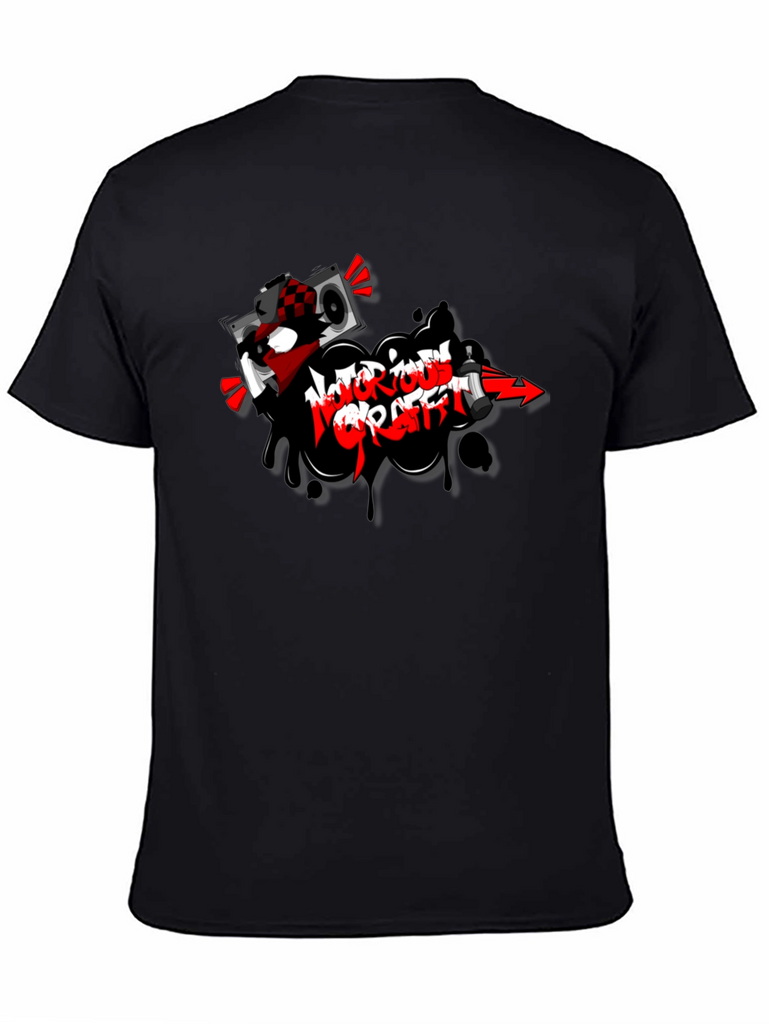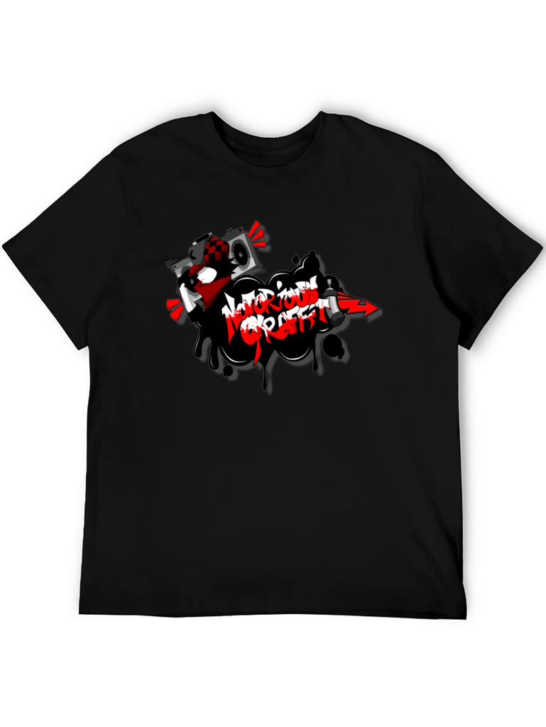 Rock a street-style look with this bold black t-shirt. The tee features a vibrant "Notorious Graffiti" graphic, complete with boombox, masked character, paint cans, and a dynamic, dripping design. Perfect for casual wear, music lovers, and anyone who wants to make a statement. The classic fit and soft fabric ensure comfort, while the eye-catching print adds an edgy flair to your wardrobe. Express yourself and stand out from the crowd with this unique and expressive piece.